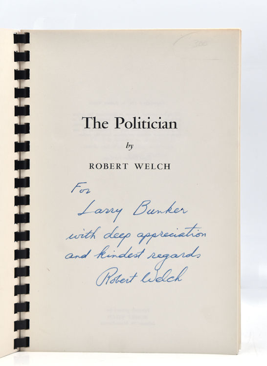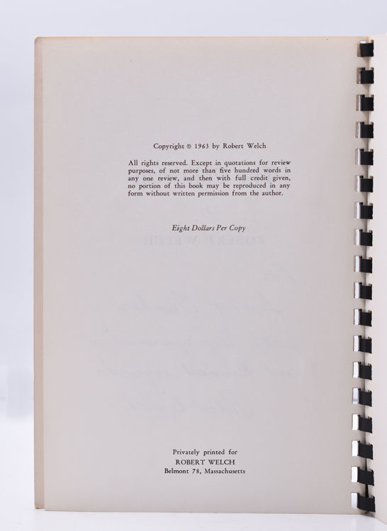 Belmont [Massachussetts]: Privately Printed, 1963. First edition. 300 pp, cxlvii. 1 vols. 8vo. Spiral bound black wrappers, loss to plastic laminate over wrappers, else fine. First edition. 300 pp, cxlvii. 1 vols. 8vo. inscribed "For Larry Bunker with deep appreciation and kindest regards Robert Welch"