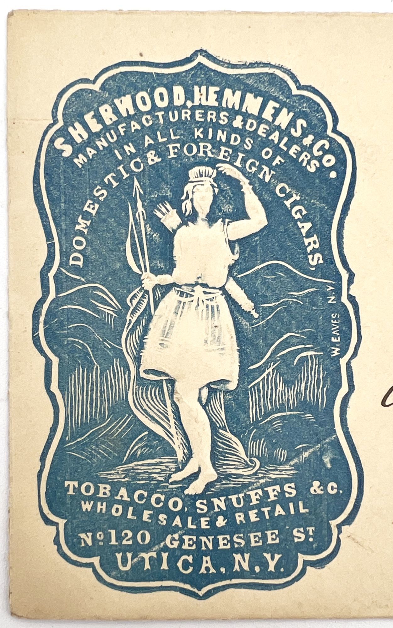 New York, New York: W. Eaves, 1871. Very good. Light toning, right edge torn, pen trial arithmetic on verso.. A handsome 1870s cameo cover advertising Sherwood, Hemmens & Co., of Utica, New York, "Manufacturers & Dealers in All Kinds of Domestic & Foreign Cigars, Tobacco, Snuffs &c." Cameo covers were popular ways for businesses to promote themselves in the 1870s and 1880s, and consisted of envelopes for circulars that had an embossed and colored seal that resembles cameo jewelry. This example is nice because of its large size and detailed image. Its embossing is also so strong it is felt on both sides of the envelope or "cover". The image depicts a Native American woman with bow and arrow, stylized in the "Noble Savage" stereotype popular at the time to promote tobacco. Measures approx. 3.25" by 5", stamped and postmarked October 1st in Utica (no year), addressed in ink to Mr. E[?] Hawey of Camden, New York. Original circular missing. The stamp is a general issue 1870-1871 green 3 cent stamp depicting Washington in profile.