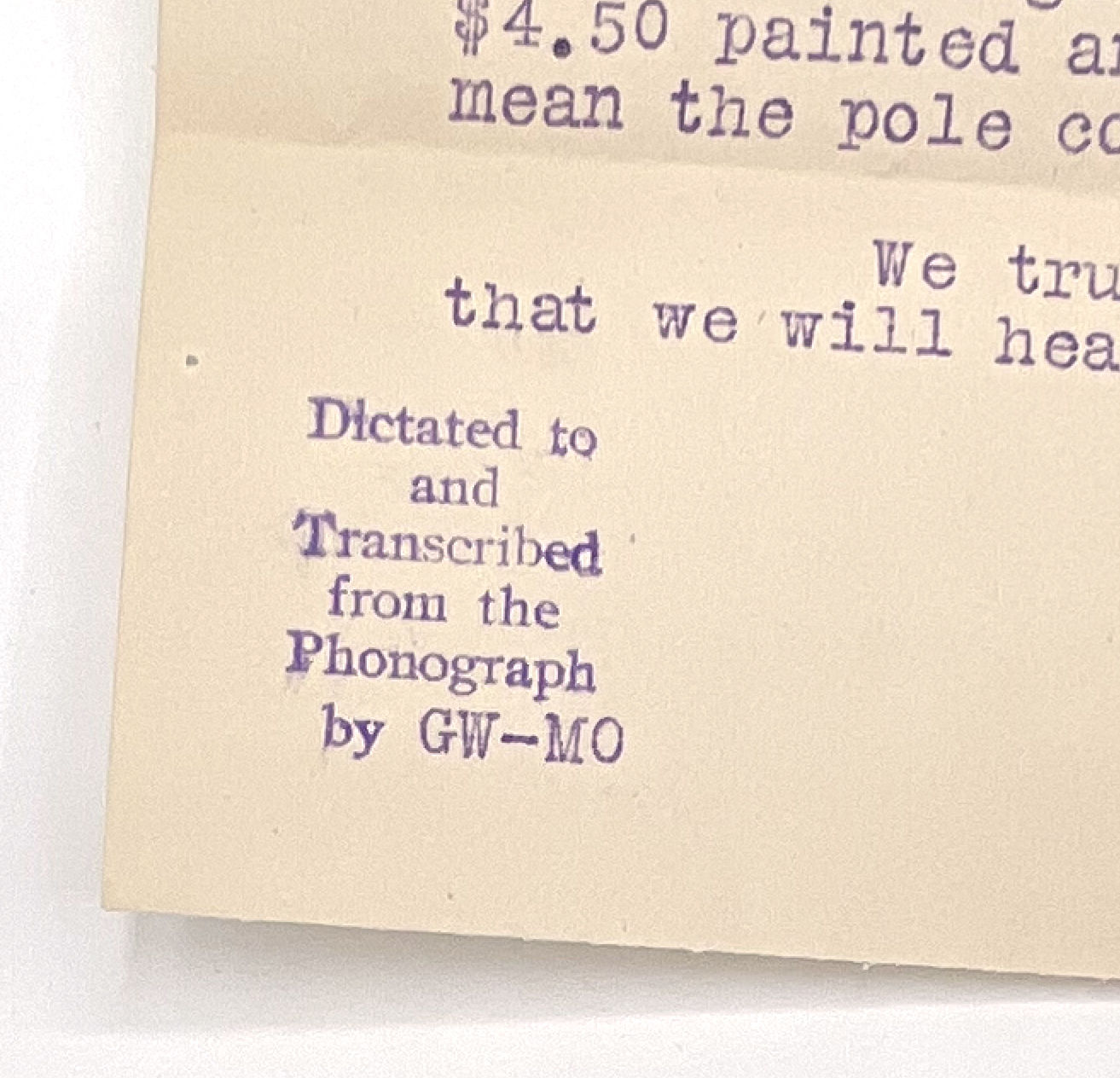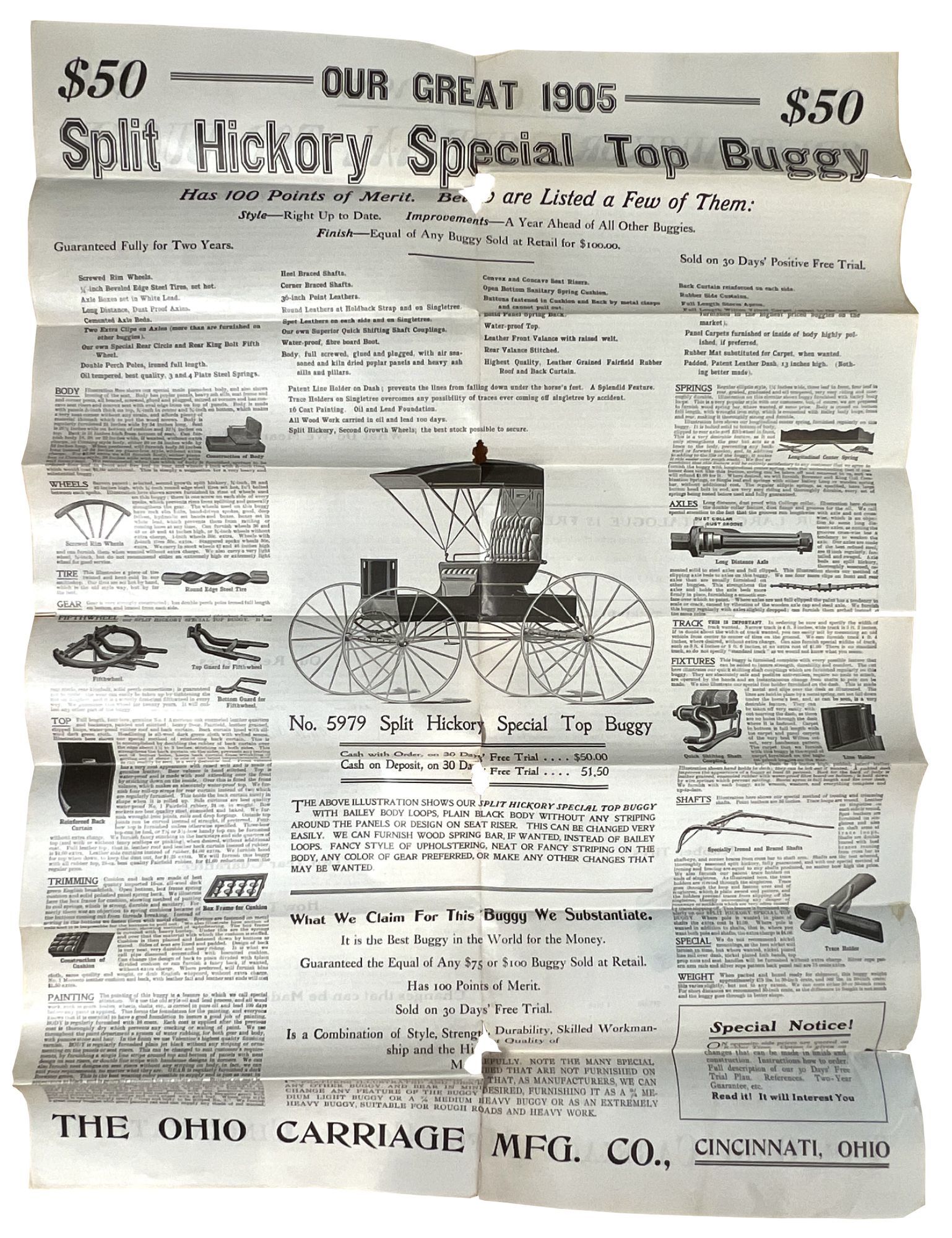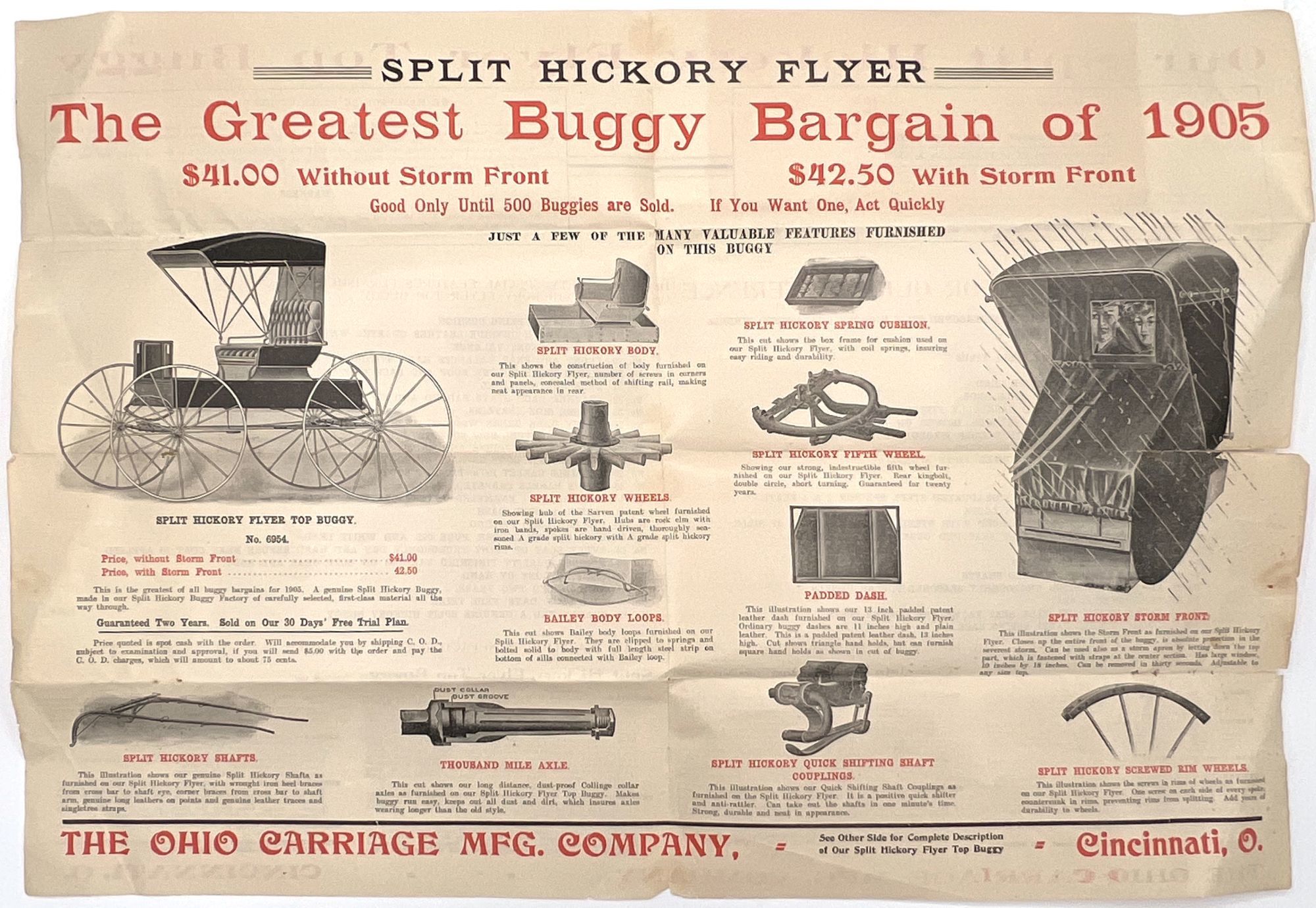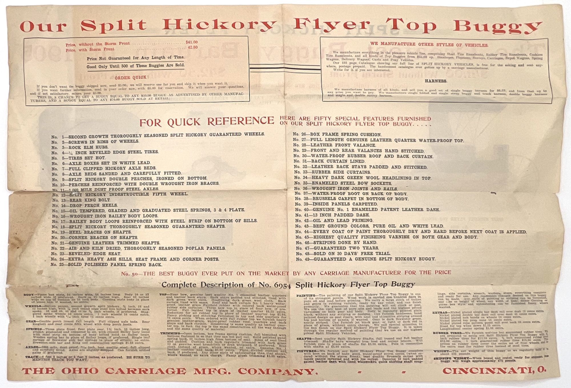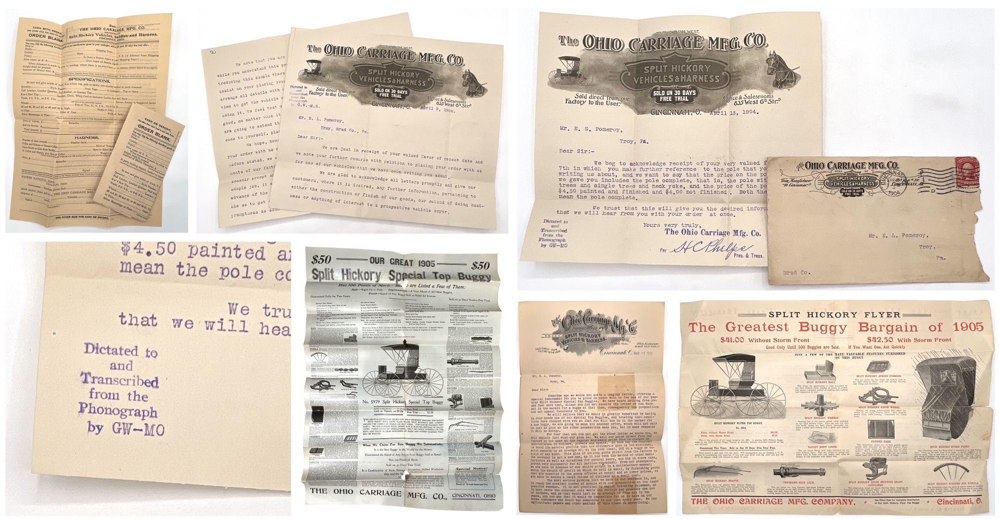 Large illustrated poster advertising the "Split Hickory Special Top Buggy", measuring approx. 25" by 18.25" unfolded, 3" by 9" folded. Includes highly detailed descriptions and specifications of different buggy parts and accessories, illustrated, with directions for how to order and further sales pitch on verso. Includes a bit of dictation history: on two of the sale pitch letters, there is an ink stamp that reads: "Dictated to and Transcribed from the Phonograph". An early version of an e-mail with the signature, "Sent from my iPhone"!