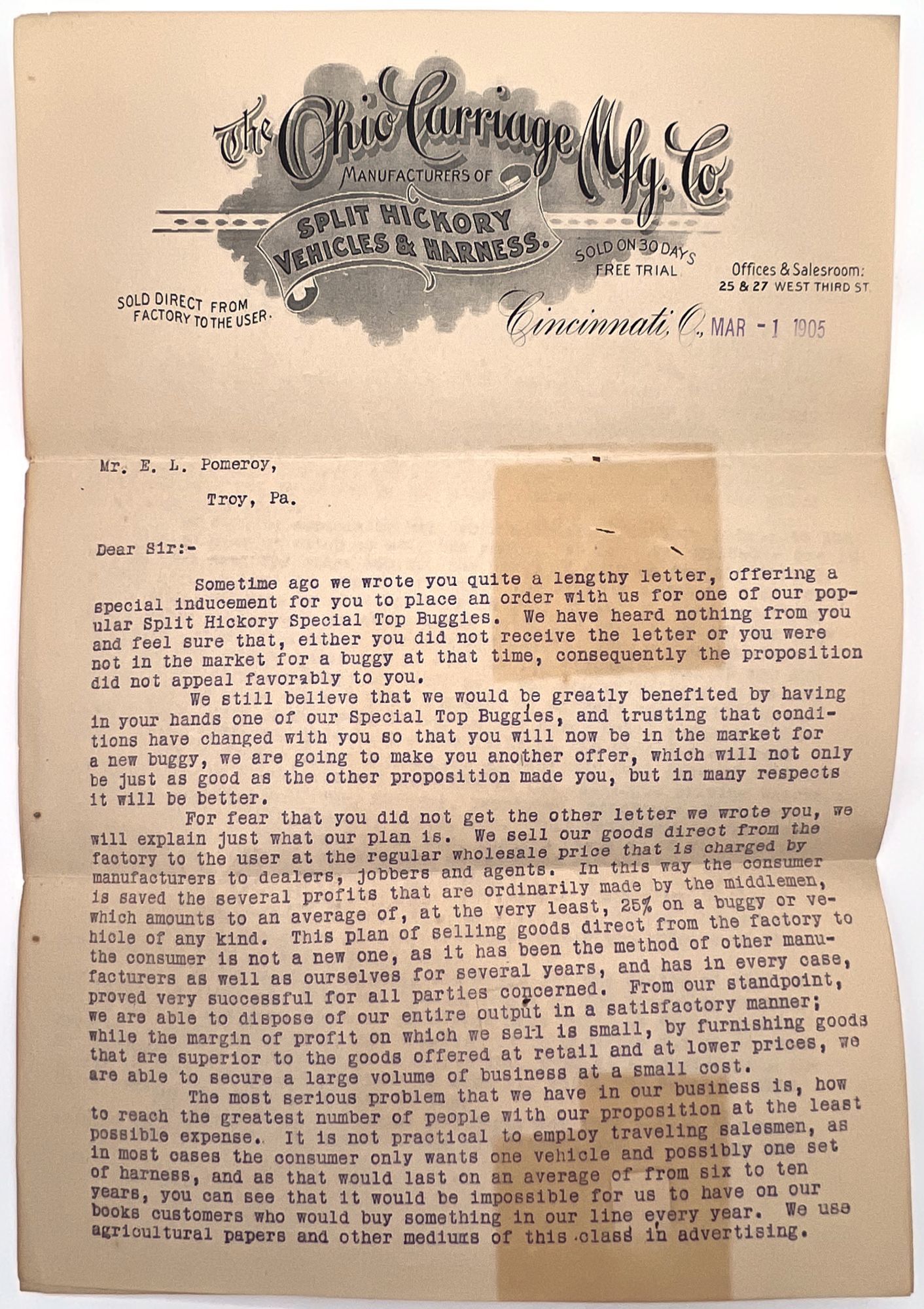 Cincinnati, Ohio: The Ohio Carriage Mfg. Co, 1905. Good. Toned with dust soiling, tears to envelopes, short tears (including large tears to larger poster), light spotting. One of the letters lacking final page.. A small group of ephemera advertising The Ohio Carriage Mfg. Co., makers of fine vehicles, harnesses and accessories "sold direct from our Factory to the User". Together, the ephemera provides valuable insight into transportation and business history, and how vital circulars and written sales pitches were to manufacturing companies at the time. Also interesting to see what sales techniques never change (e.g. illustrating the products always helps sell). In total there are seven (7) items, including three (3) sales pitch letters, two (2) order blanks, and two illustrated flyers advertising the products.