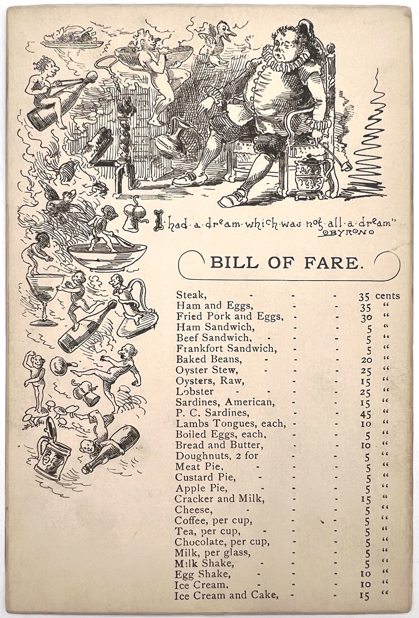 United States: N.p., 1910. Very good. Light dust soiling.. A whimsical bill of fare printed on thick card with beveled edges (6" by 4", verso blank), illustrated in the comical and charming style of Clare Dwiggins and contemporary cartoonists. The image is captioned with a Byron quote ("I had a dream which was not all a dream") and depicts a portly 16th century gentleman fast asleep in a chair, while various troublemaking imps and elves frolic amid food and drink. Each item on the menu is affordably priced. Offerings include comforting and casual pub-style fare (e.g. ham and eggs, oyster stew, lamb tongue, pie, tea and coffee).