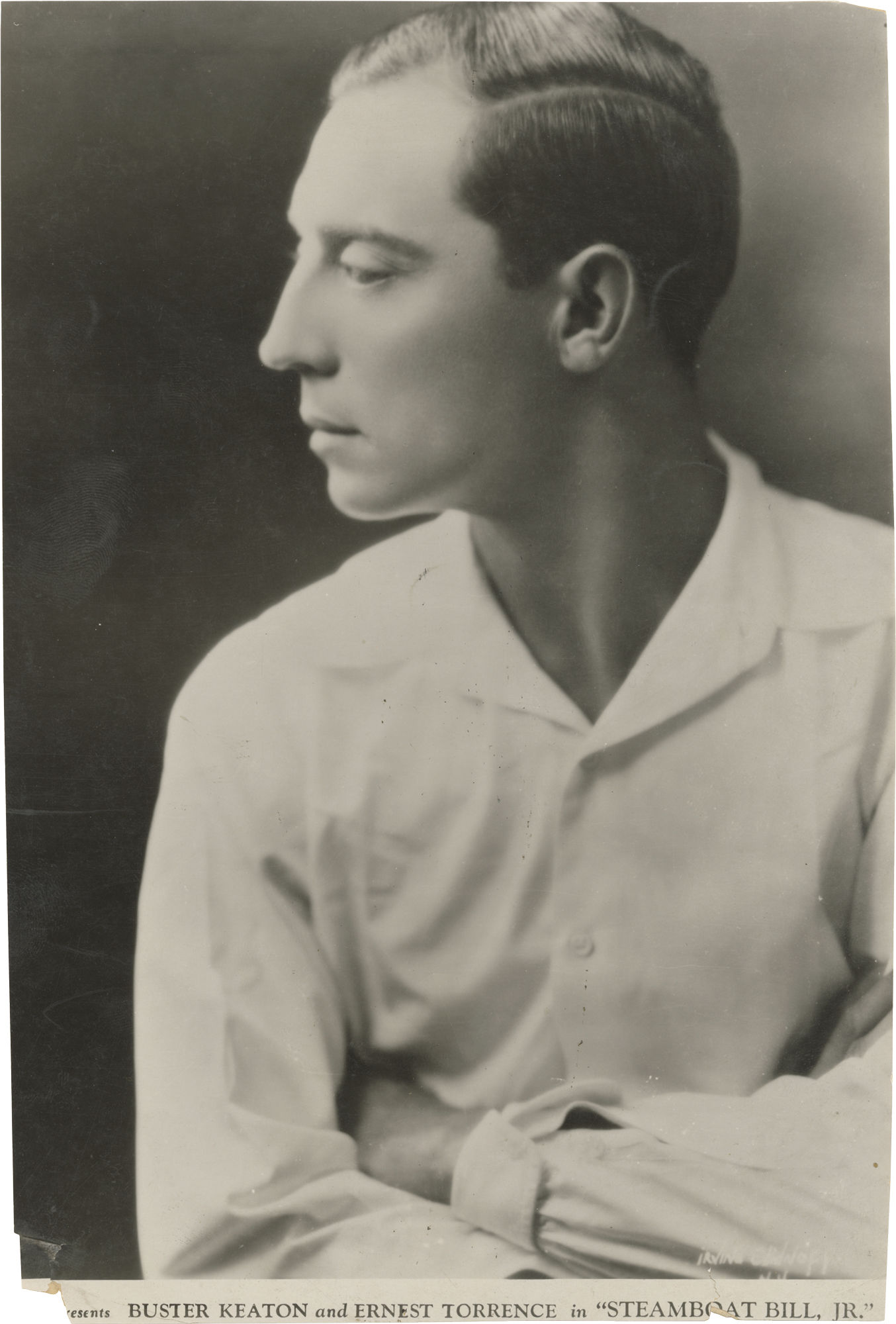 N.p.: N.p., 1928. Vintage borderless publicity portrait photograph of actor Buster Keaton Jr. in his shirtsleeves, issued to promote the 1928 silent comedy film. Contemporary dealer stamp on the verso.