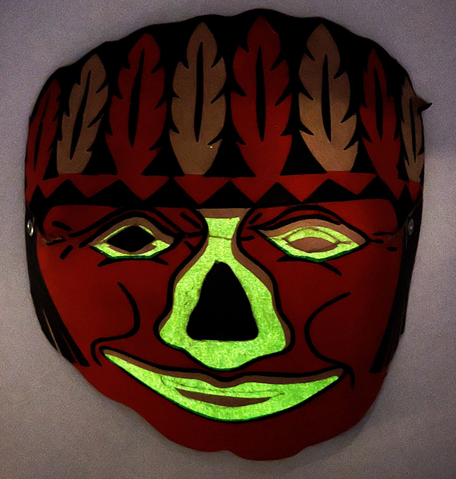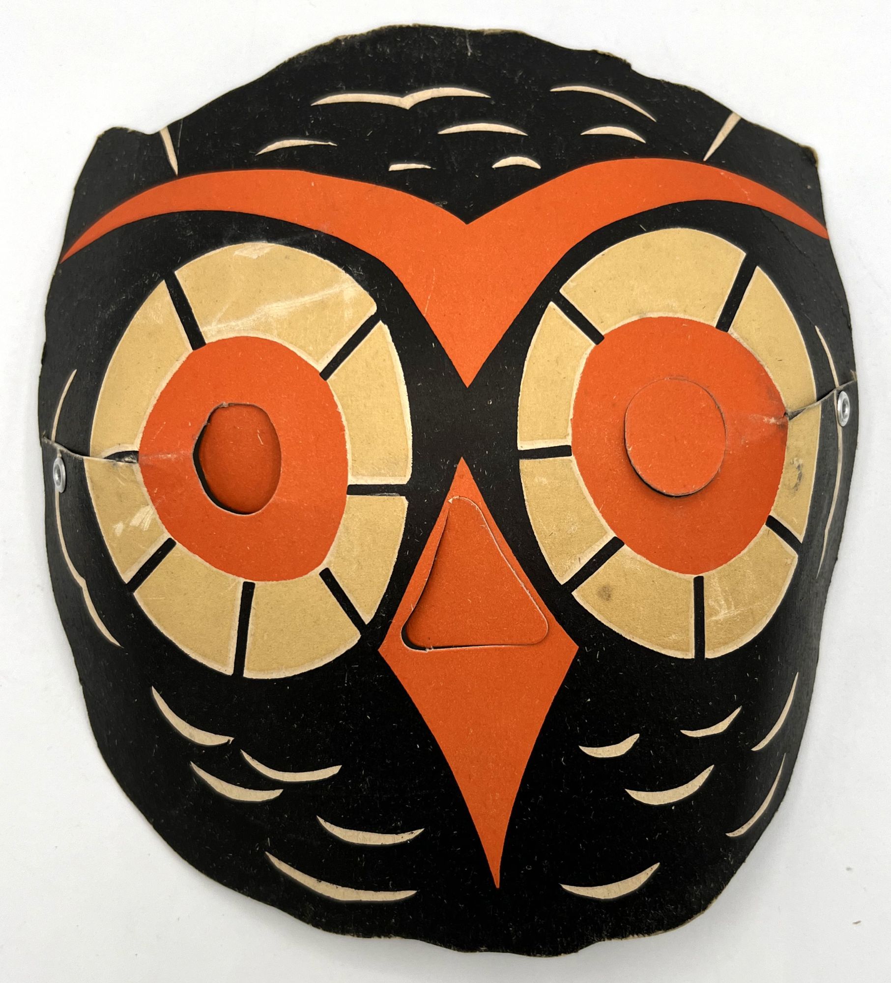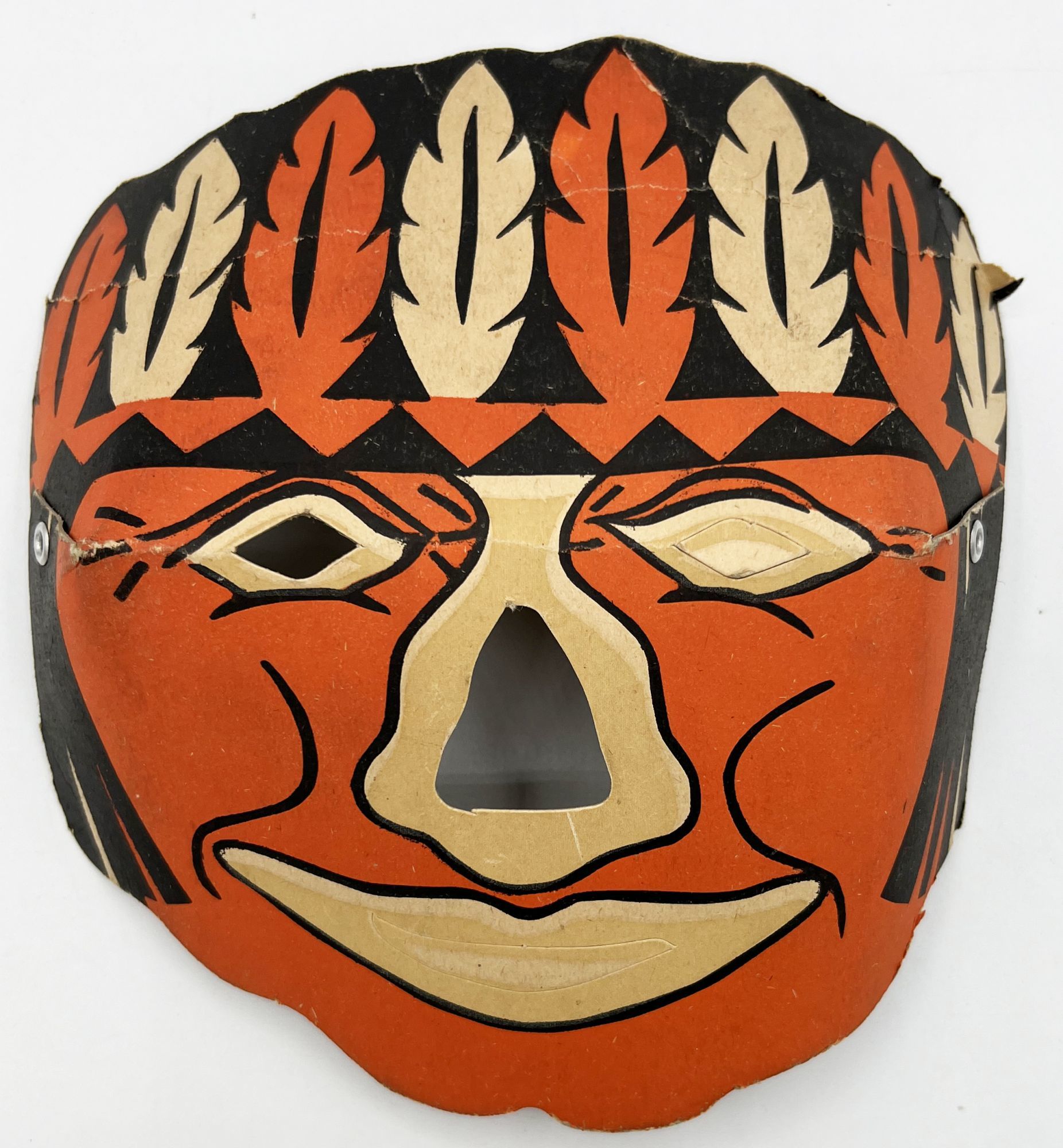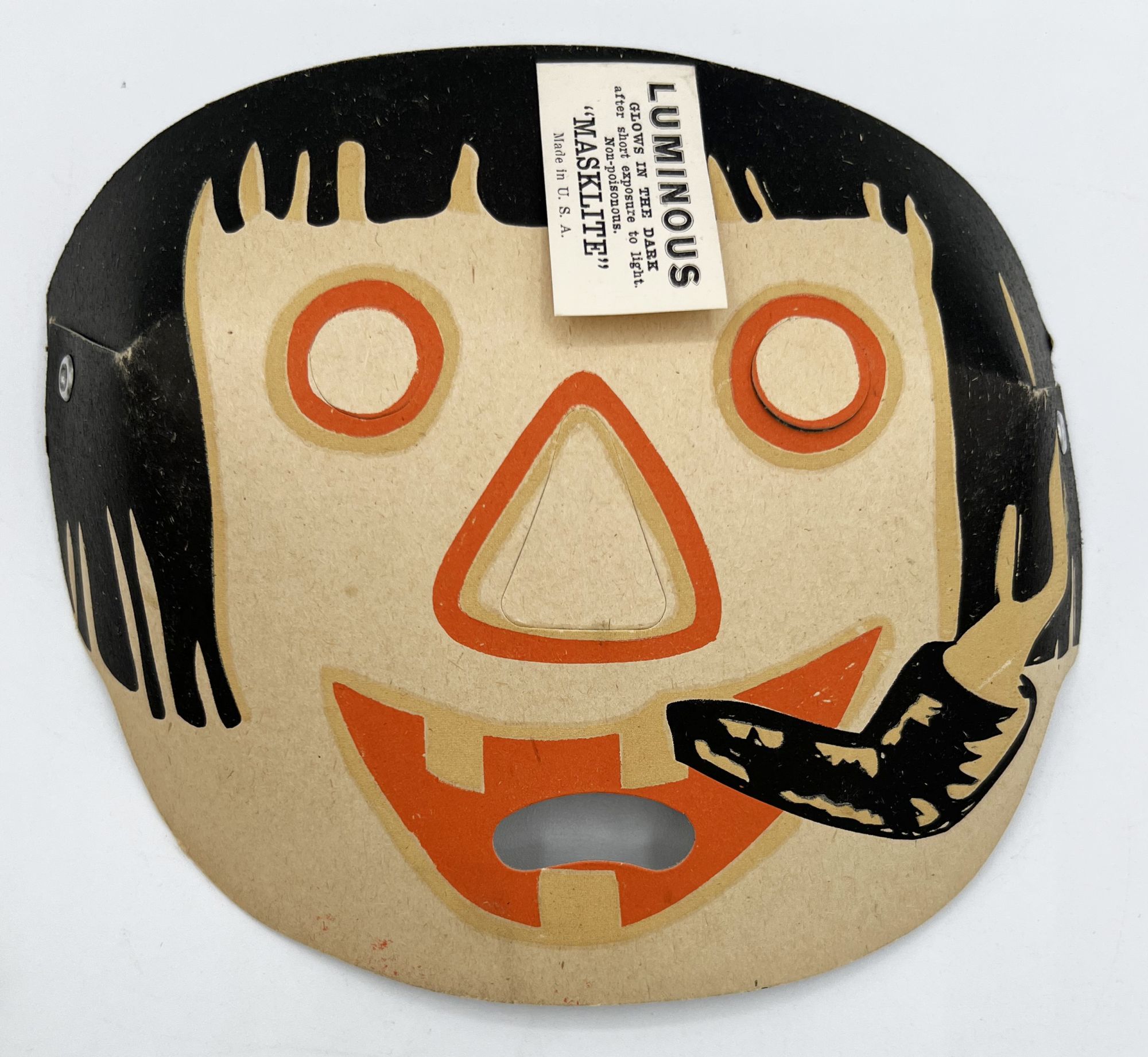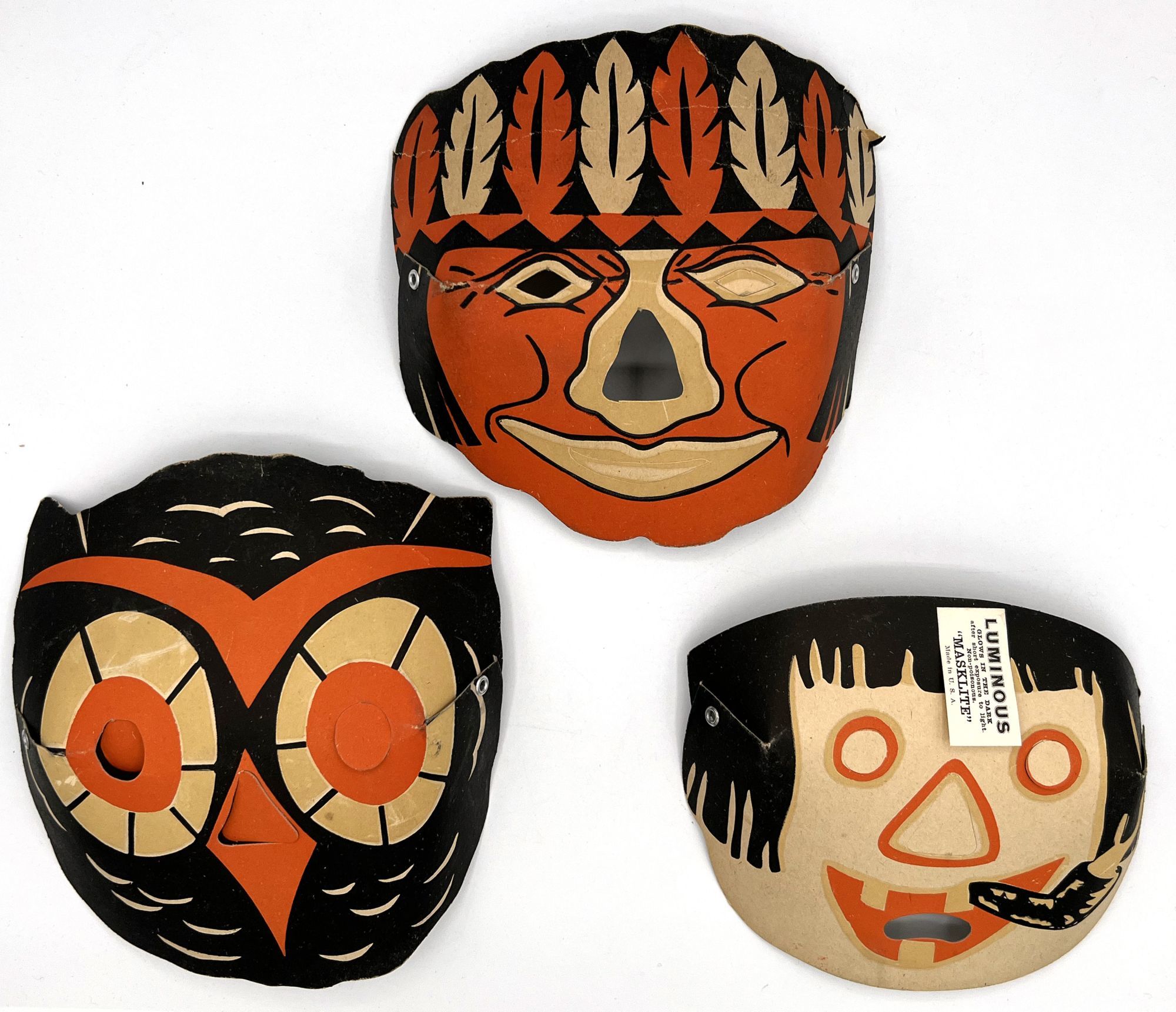 United States: Masklite, 1950. Very good. Light toning, spotting. Three cut-out pieces lacking (an eye, a nose, a mouth).. Three (3) delightful children's Halloween masks, each printed in black and orange, and with added ink that glows in the dark. Includes a Native American mask (complete with of-the-era stereotyping), an owl mask, and an old crone smoking a pipe. They each can be held up to a source of light for a few seconds to then glow-in-the-dark, and one has its original printed slip promoting the "Masklite" brand of "Luminous" glowing technology. Each measures approx. 6" by 7" by 2", and is held together with metal grommets on either side, which also serve as places for a string to be tied to keep it on the face.