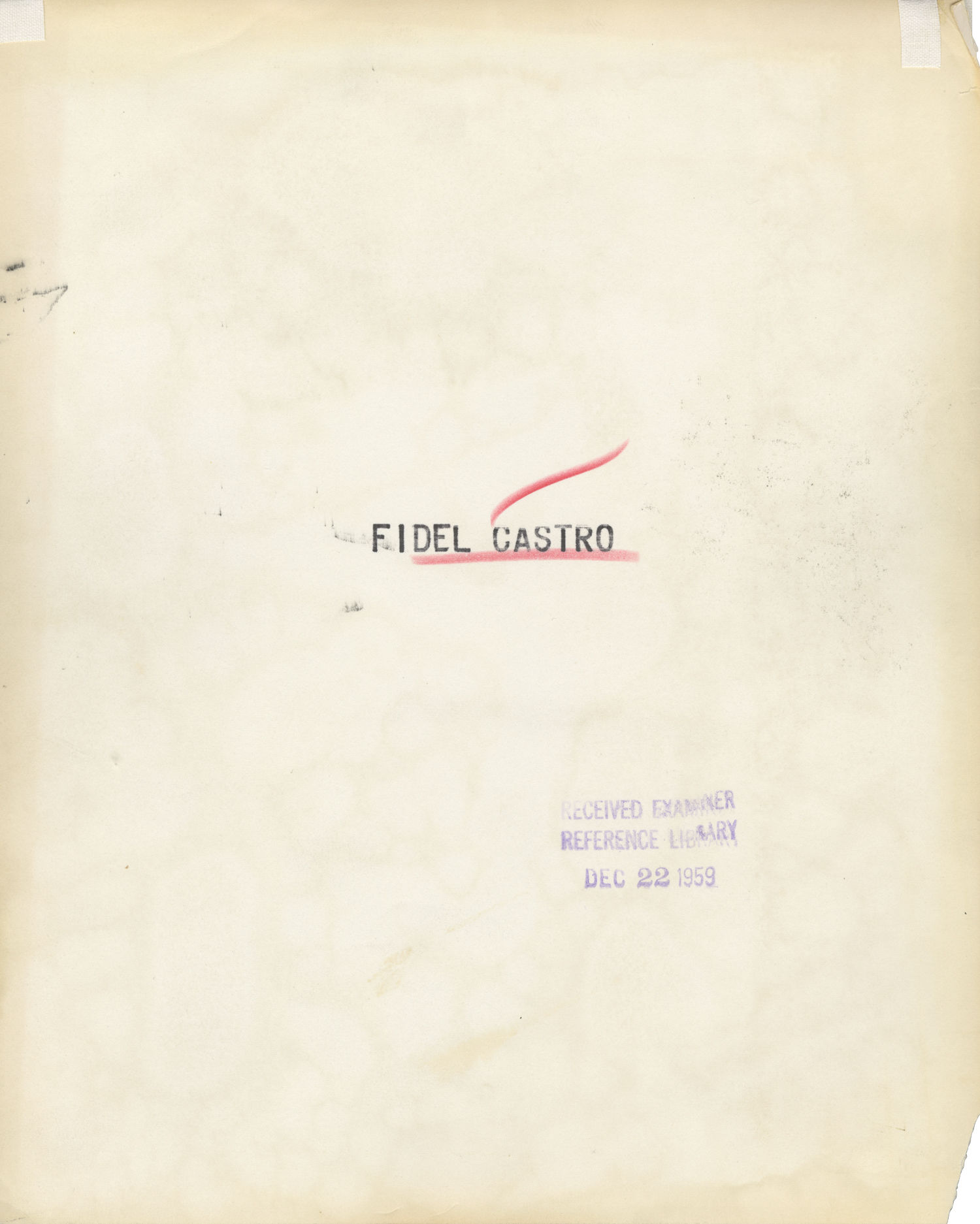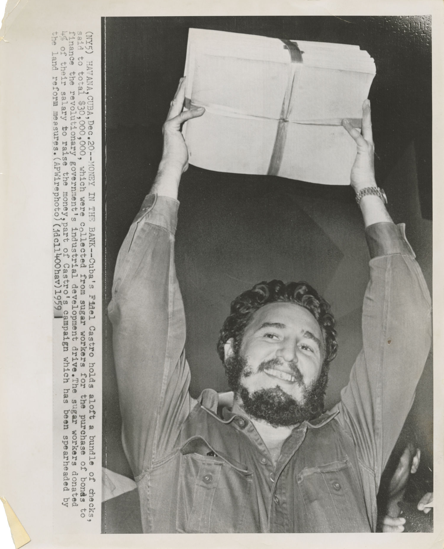 N.p.: N.p., 1959. Vintage press photograph of Cuban revolutionary and politician Fidel Castro on December 20, 1959, holding a bundle of checks collected from sugar workers to fund a national industrial development drive. Date stamp and reference library stamp on the verso.