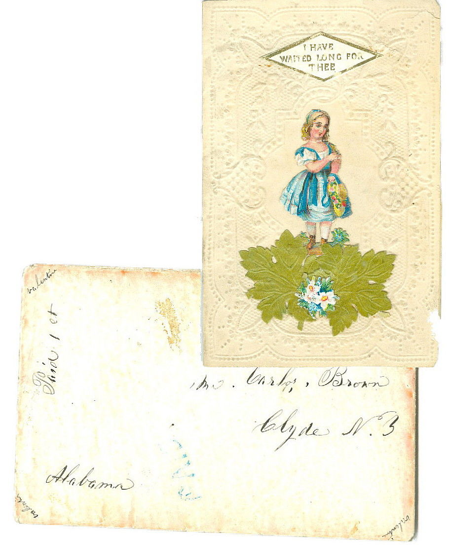 A single fold embossed valentine with applied scraps of a small girl holding her brimmed sun hat. She is standing atop lush green leaves which has tiny daises in the center. Verse read,"I have Waited Long for Thee." Inside blank. Scrapbook residue on reverse. Front and back pages stuck together at top. The envelope has pen inscriptions with front and back toning.