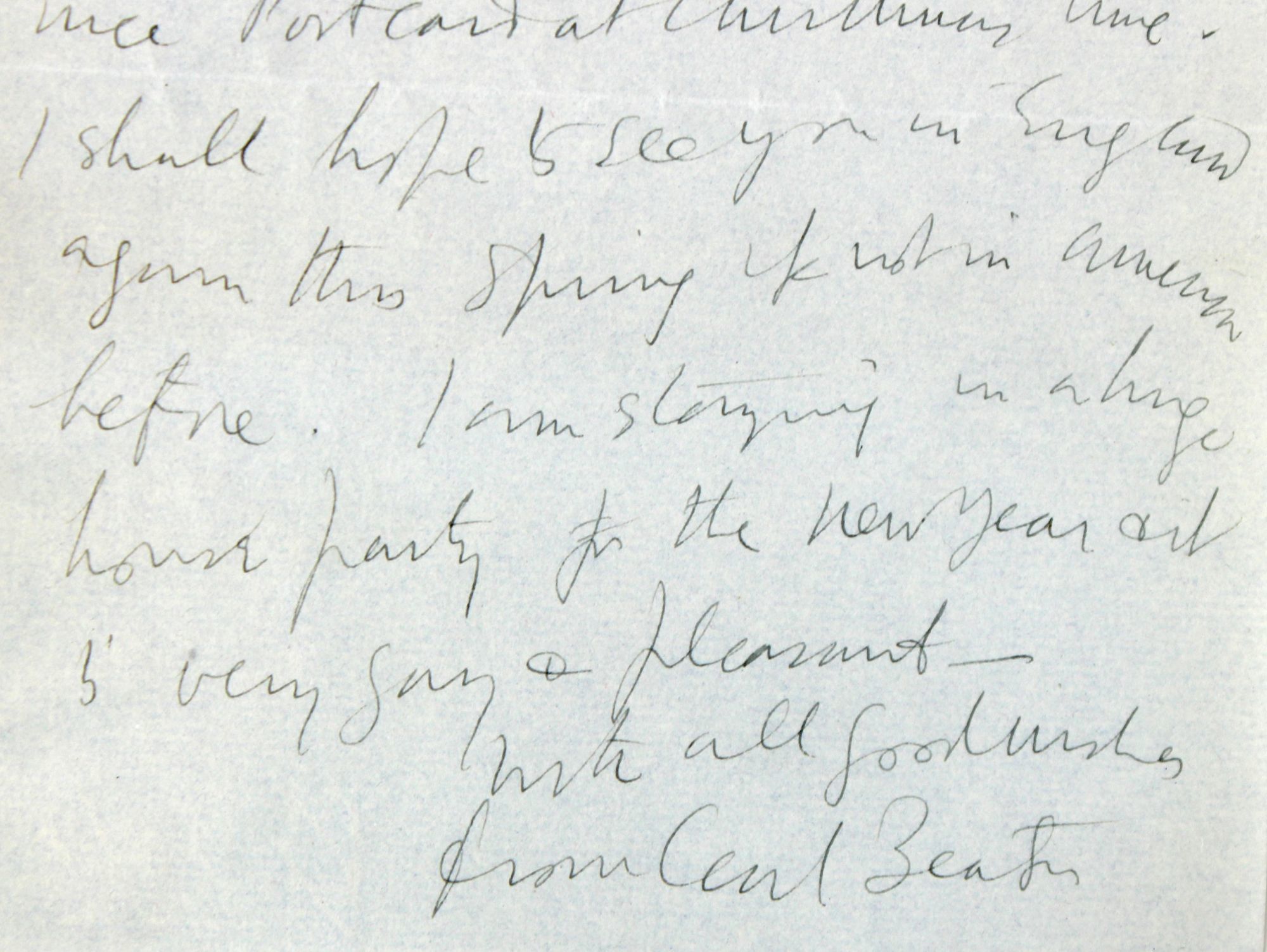Here, Beaton notes on the estate's stationery that he was "staying in a huge house party for the New Year & it is very gay and pleasant." While the letter is undated, it was likely penned during the 1950s, following the 1949 marriage of Sir Michael and Lady Caroline, who were famous for their lavish parties. The recipient — to whom Beaton writes, "I shall hope to see you in England again this Spring if not in America before" — is possibly the painter Tamara de Lempicka, whom Beaton had photographed in the 1930s, and who lived in New York City from 1943 until the early 1960s.
