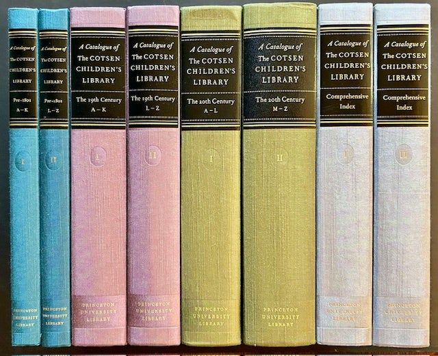 Princeton University Library, 2021. Cloth. Fine. The uncommon complete catalogue of the magnificent Lloyd Cotsen children's collection, now housed at the Firestone Library at Princeton University. All 8 exhaustive volumes --thick, tall, uniform quartos-- are in easily Near Fine to Fine condition, with most of the volumes leaning more towards pristine. Vols. I-II, in their silken, light-blue cloth, cover "The Pre-1801 Imprints" and were originally published in 2020; Vols. III-IV, in their silken purple cloth, cover "The Nineteenth Century" and were published in 2018; Vols. V-VI, in their silken green cloth, cover "The Twentieth Century" and were also published in 2020. And finally, the 2 "Comprehensive Index" volumes, in their silken gray cloth, were published in 2021. A sweeping undertaking, the catalogue itself --not to mention the remarkable collection it painstakingly records-- is a marvel of bibliographic achievement in its own right.