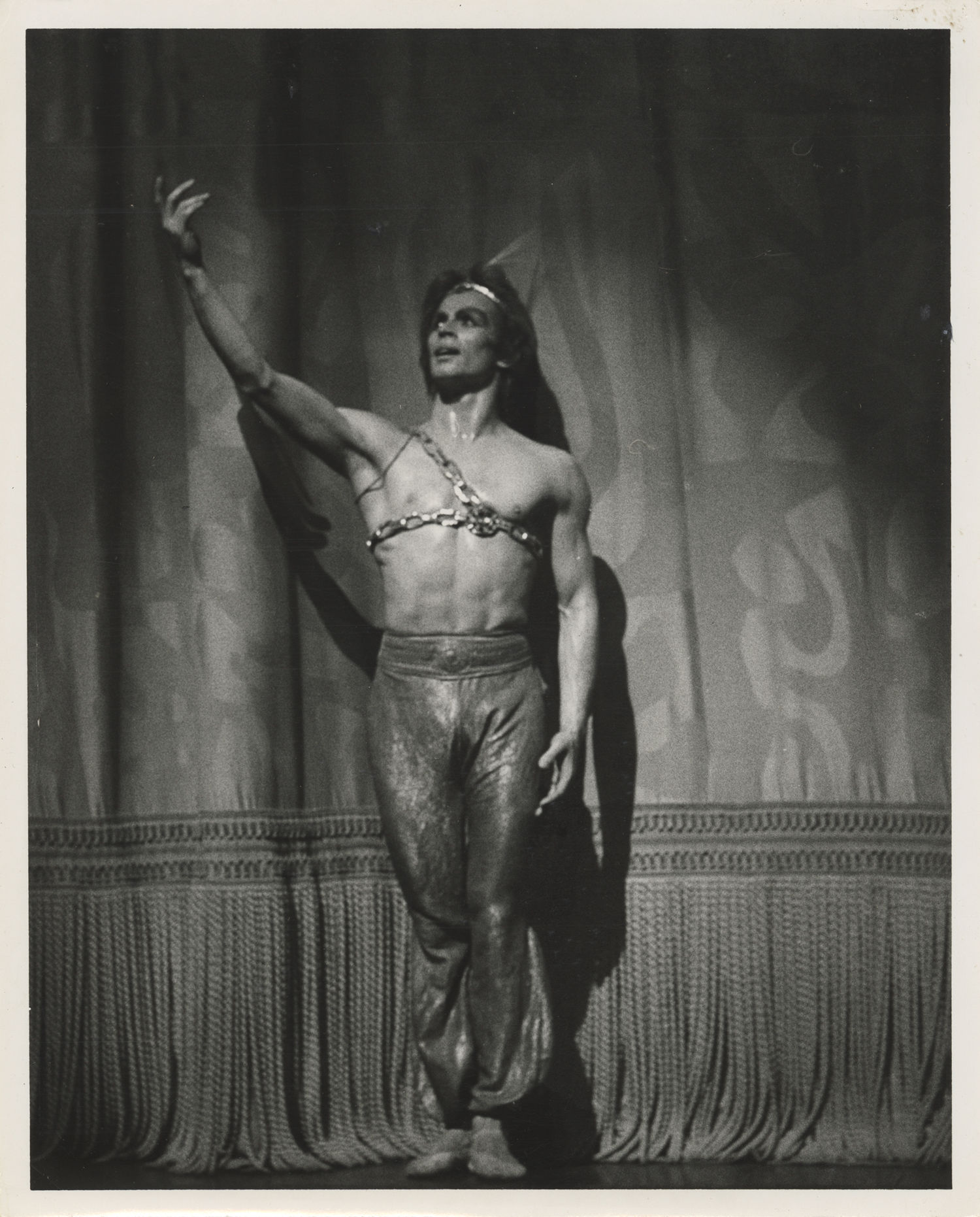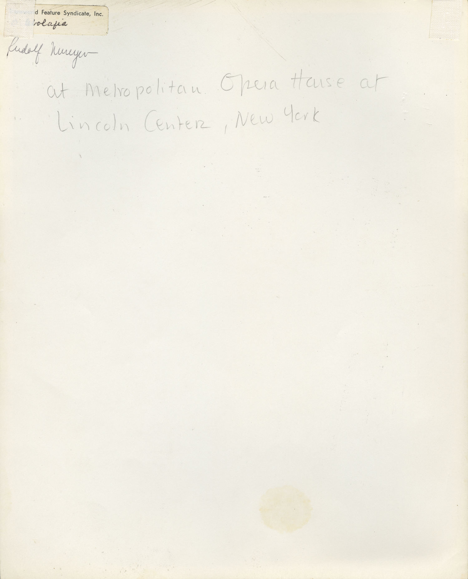 N.p.: N.p., 1970. Vintage photograph of Russian American dancer Rudolf Nureyev in his costume for "Le Corsaire," bowing during a curtain call at the Metropolitan Opera House, circa 1970s.