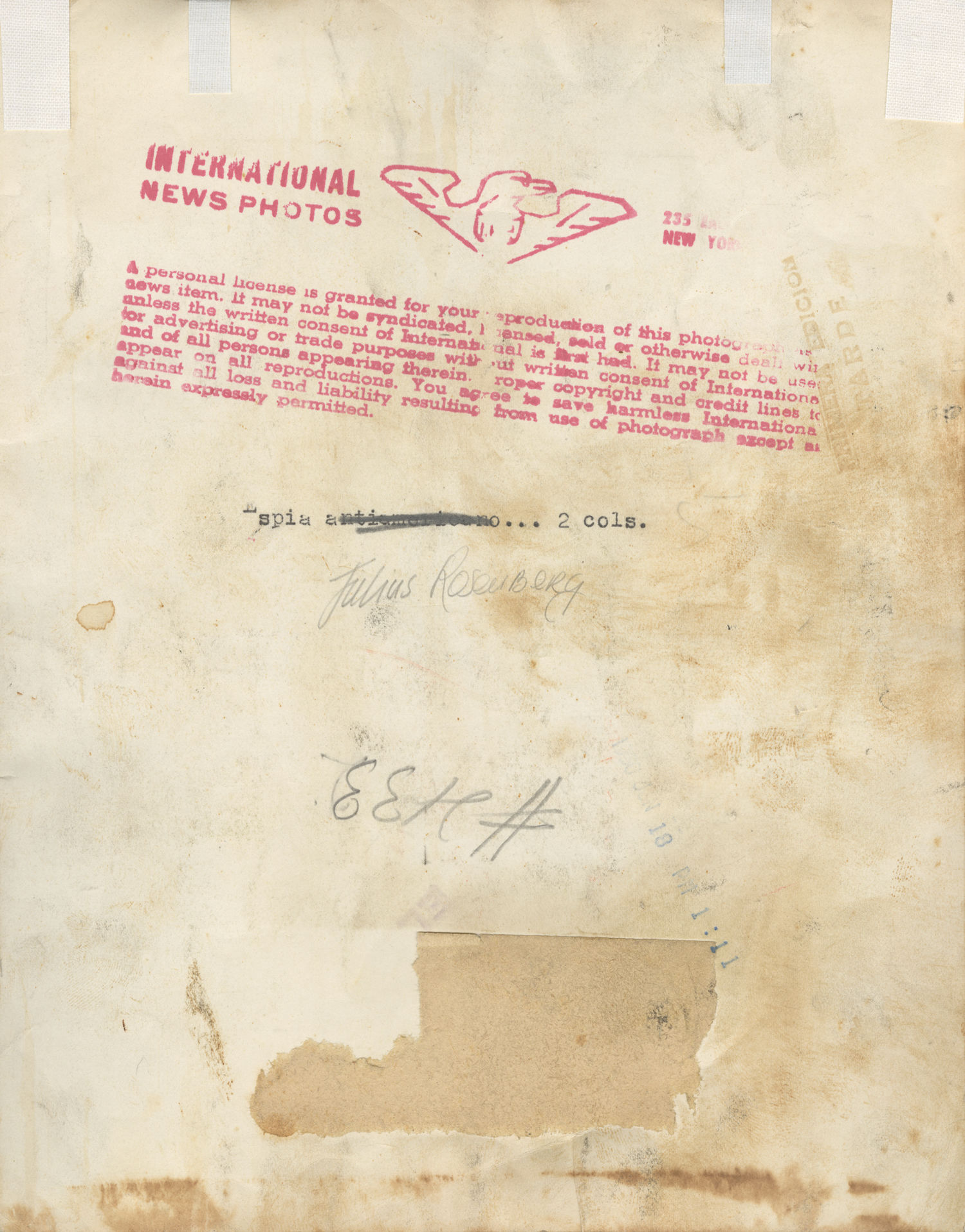 New York: International News Photos, 1950. Vintage photograph of the arrest of Soviet spy Julius Rosenberg on July 17, 1950. International News Photos stamp on the verso, as well as a June 15, 1950, date stamp.