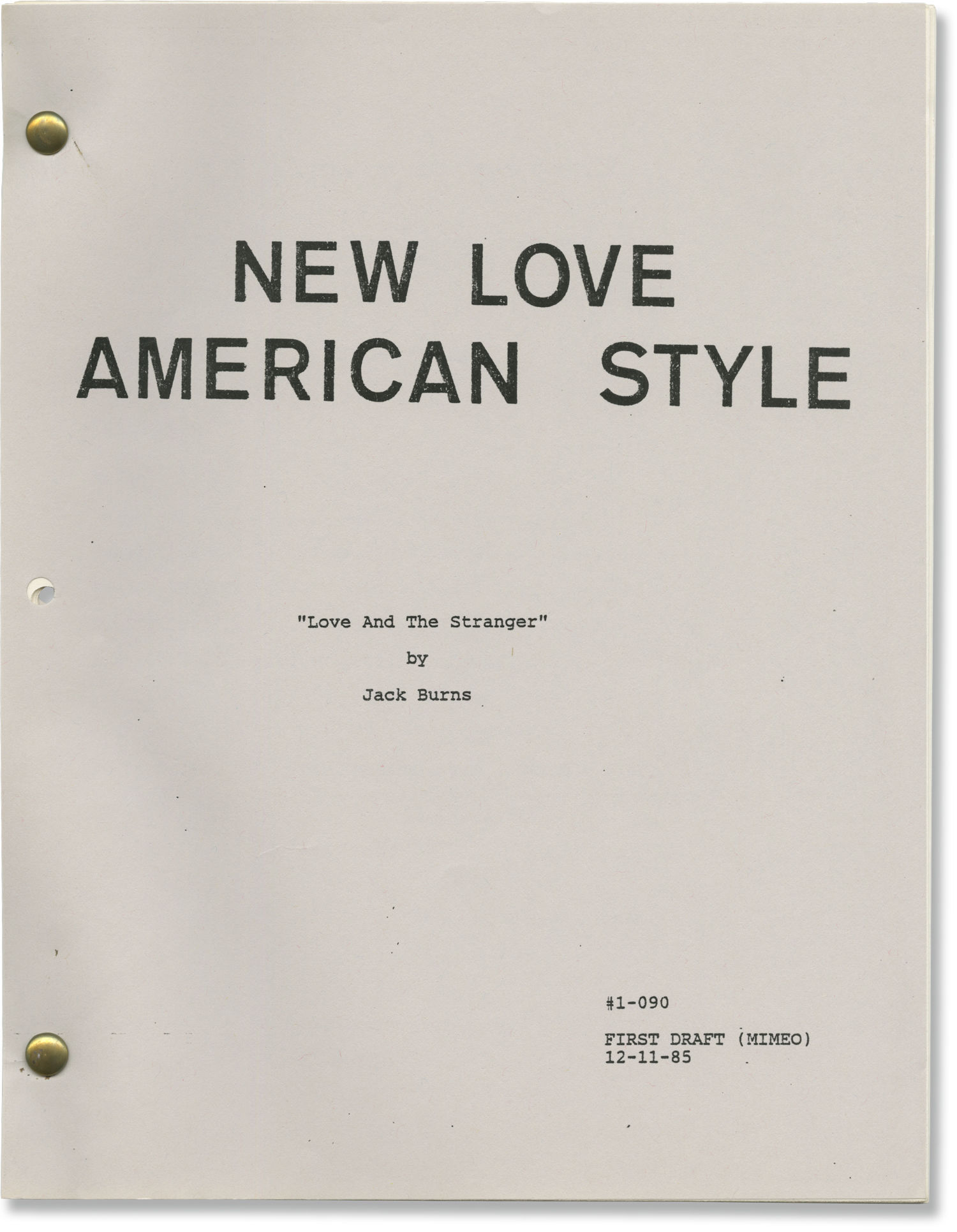 Gray titled wrappers, noted as FIRST DRAFT on the front wrapper, production No. 1-090, dated 12-11-85, with credits for screenwriter Jack Burns. Title page integral with front wrapper. 16 leaves, with last page of text numbered 14. Xerographic duplication, rectos only. Pages Near Fine, wrapper Near Fine, bound with two gold brads.