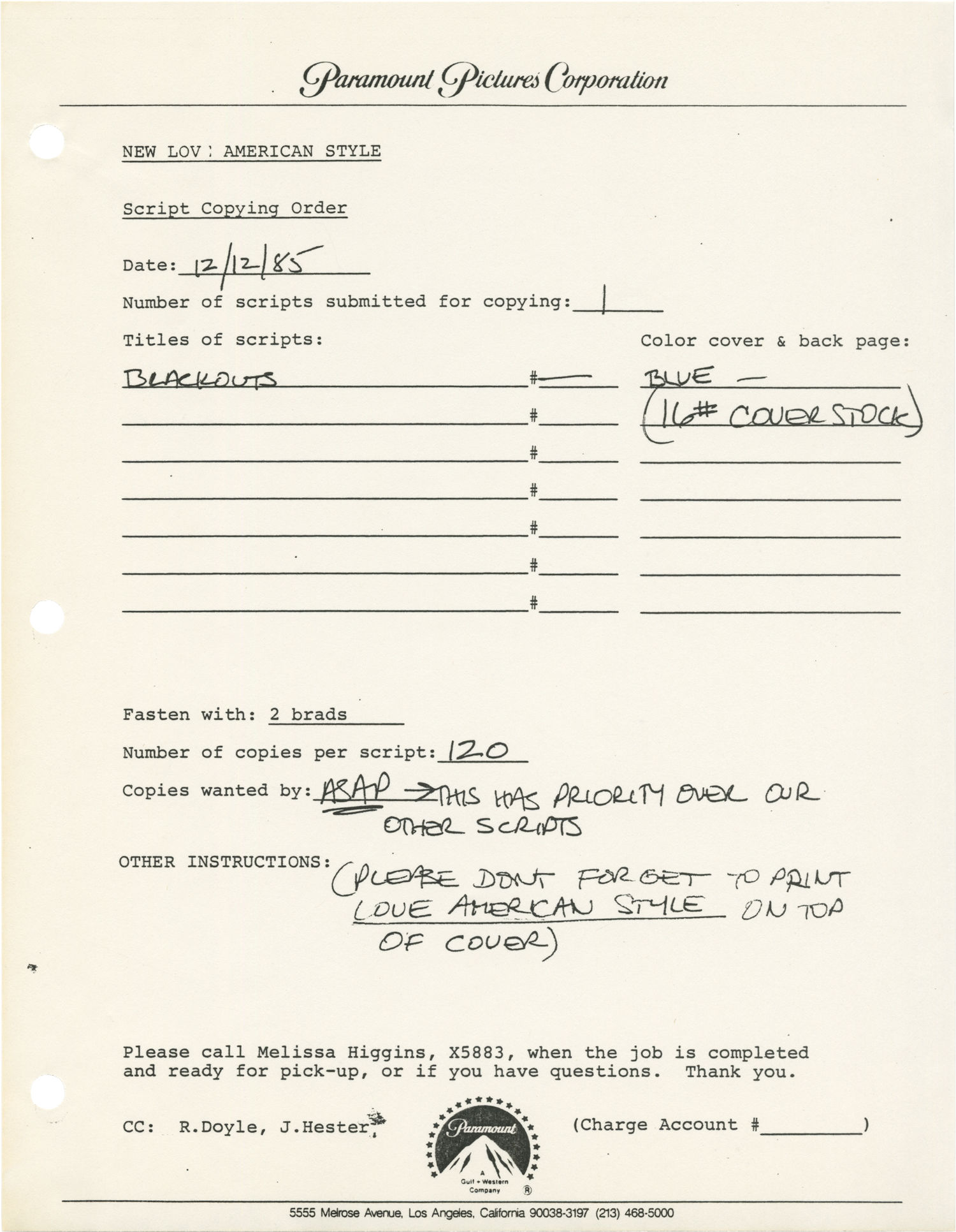 Hollywood: Paramount Pictures, 1985. First Draft script for an unproduced episode of the 1985-1986 television series. With xerographically duplicated Paramount Pictures script duplication form laid in the back of the script.