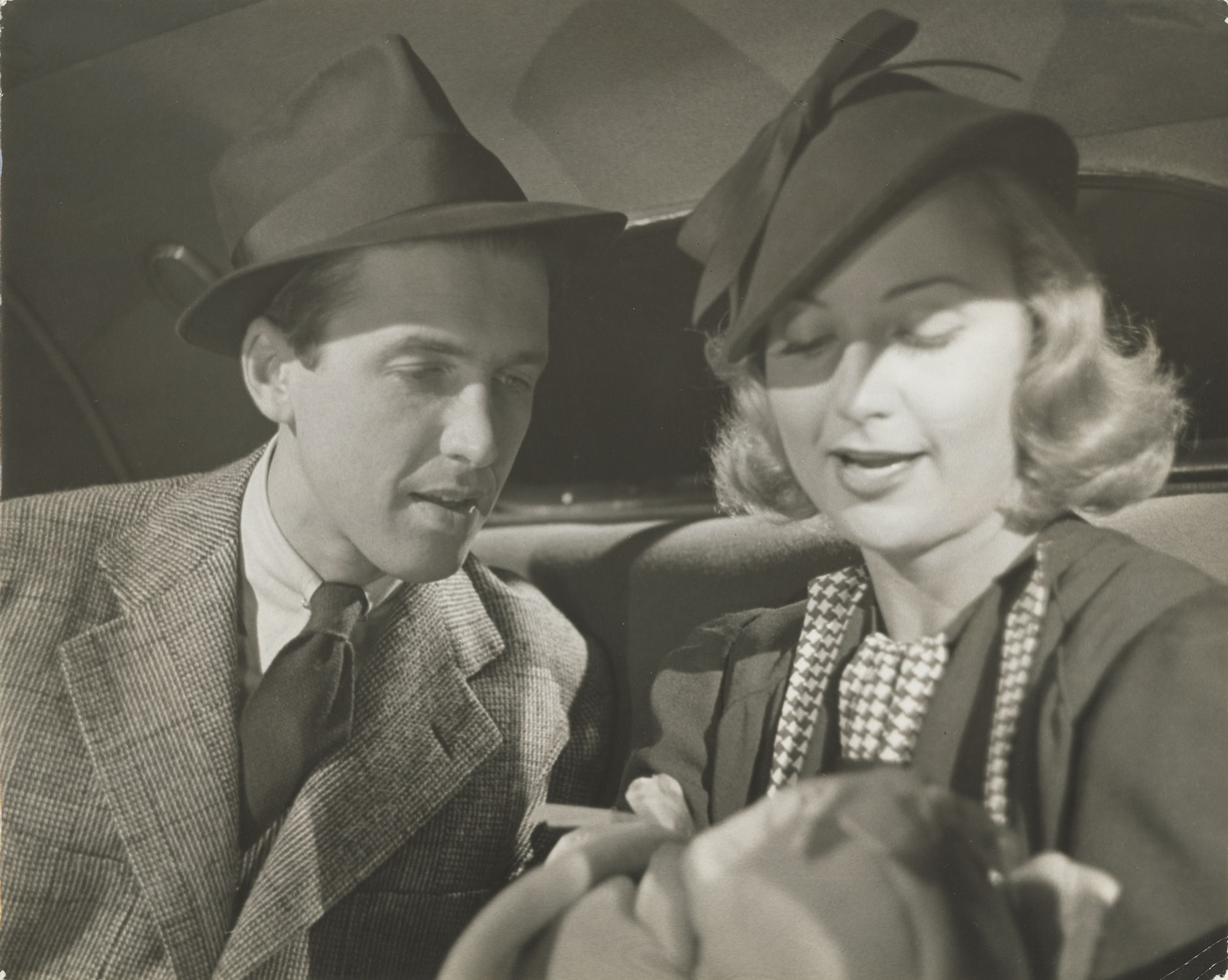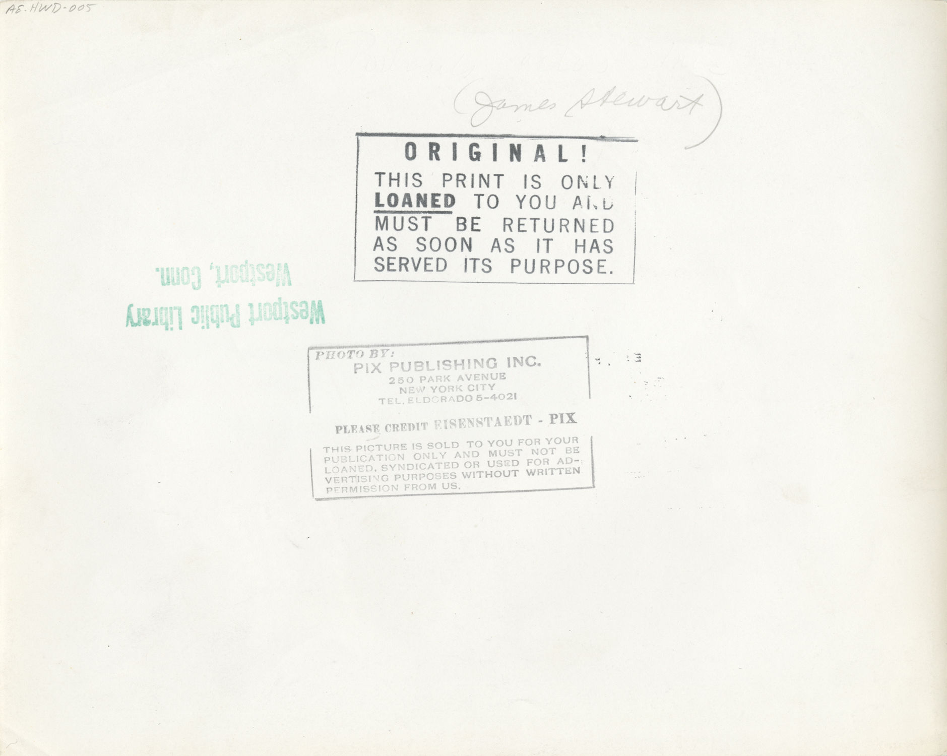 New York: N.p., 1939. Vintage borderless reference photograph from the set of the 1939 film, showing actors Carole Lombard and James Stewart. PIX agency stamp on the verso, crediting noted photographer Alfred Eisenstaedt, as well as a Westport Public Library stamp.