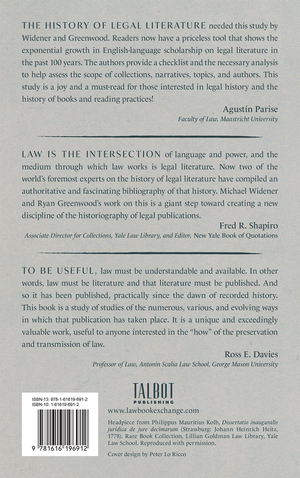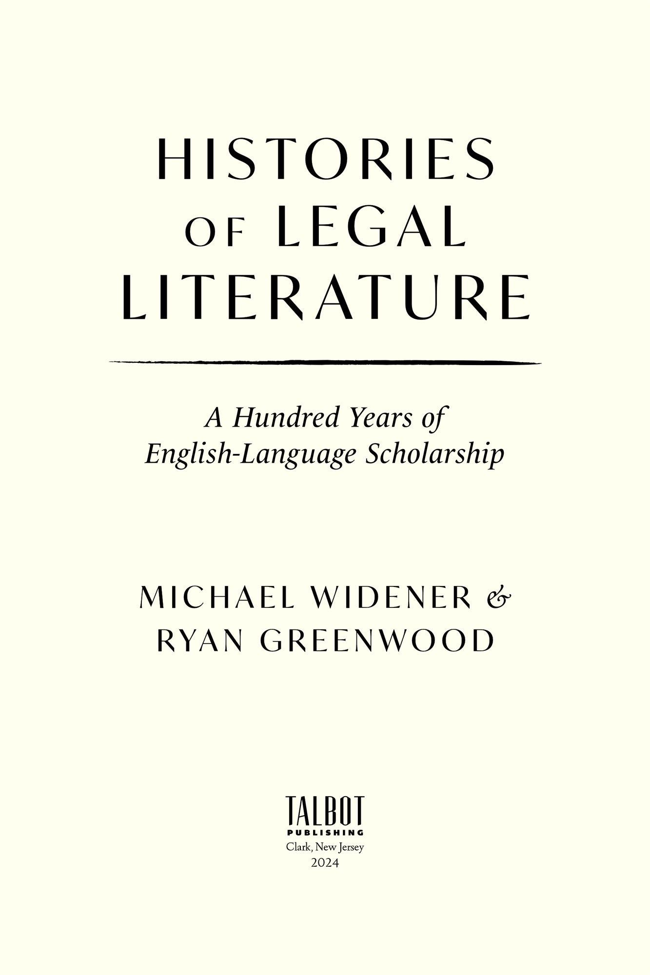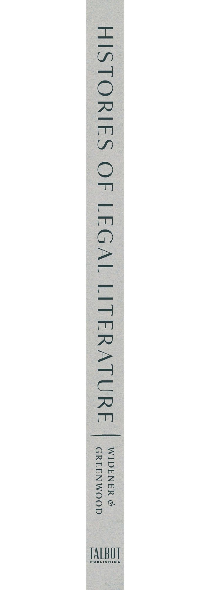 2024. Talbot Publishing, 2024.. Talbot Publishing, 2024. Widener, Michael. Greenwood, Ryan. Histories of Legal Literature: A Hundred Years of English-Language Scholarship. Clark, New Jersey: Talbot Publishing, 2024. viii, 202 pp. ISBN-13: 9781616196912 ISBN-10: 1616196912. Hardcover. New. $49.95. * The history of the law is known above all through its literature, an extraordinarily diverse body of texts in an equally diverse variety of formats. Histories of Legal Literature maps the past hundred years of English-language scholarship with a bibliography of 998 publications on the origins, authorship, dissemination, design, readership, and preservation of the works that shaped the law books of today, including the vast legal literatures from outside the Anglo-American world. With the help of a detailed subject index and statistical analysis, Widener and Greenwood reveal the strengths and gaps in this body of scholarship and point to opportunities for new contributions. Histories of Legal Literature will be a useful reference for legal historians, book historians, librarians, and those working in allied fields. Michael Widener was Rare Book Librarian at the Yale Law School Library until his retirement in 2021. He teaches a course on law books for the University of Virginia's Rare Book School. He is co-author (with Mark S. Weiner) of Law's Picture Books: The Yale Law Library Collection (Talbot Publishing, 2017), which won the 2018 Joseph L. Andrews Legal Literature Award from the American Association of Law Libraries. Ryan Greenwood is Curator of Rare Books and Special Collections at the University of Minnesota Law Library, and has served as Widener's co-instructor at Rare Book School. He is co-author (with Patrick Graybill) of Jewels of the Collection: Treasures of the Riesenfeld Rare Books Research Center, which won the 2024 Joseph L. Andrews Legal Literature Award from the American Association of Law Libraries.