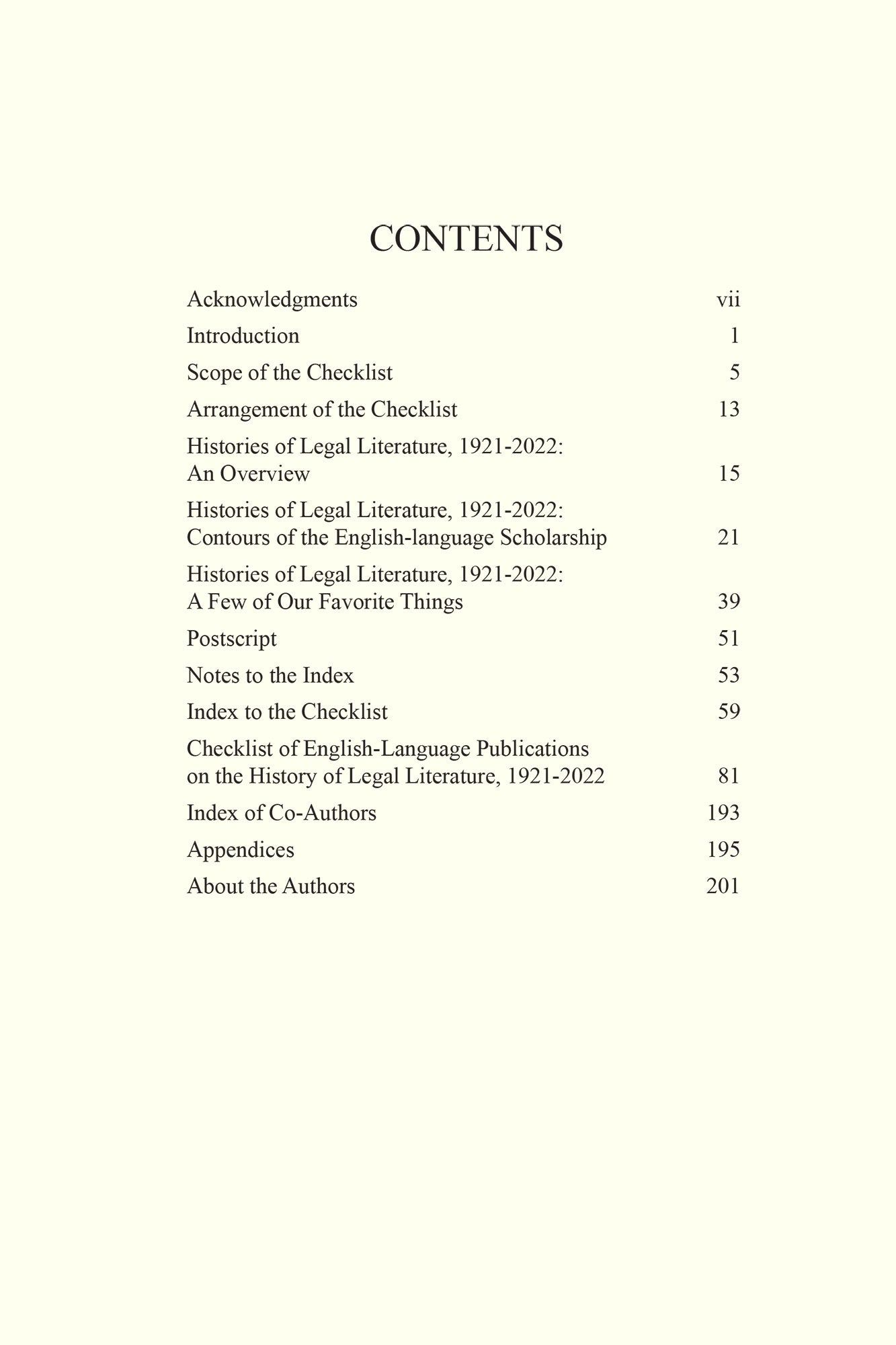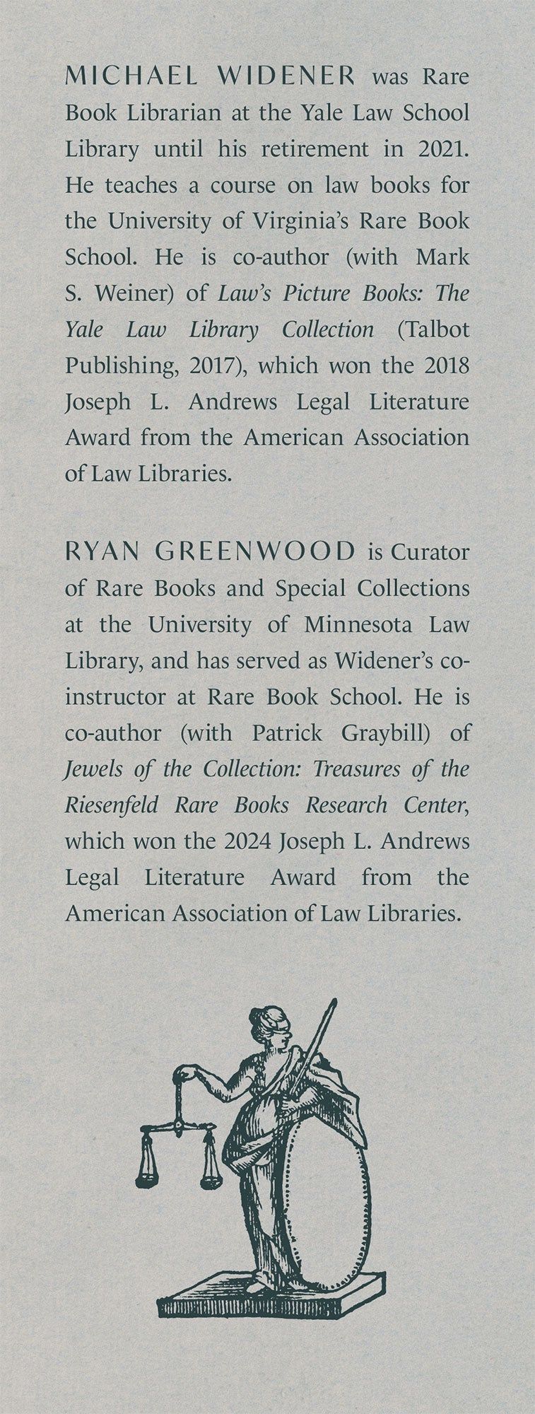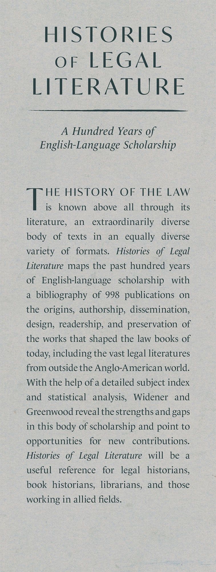2024. Talbot Publishing, 2024.. Talbot Publishing, 2024. Widener, Michael. Greenwood, Ryan. Histories of Legal Literature: A Hundred Years of English-Language Scholarship. Clark, New Jersey: Talbot Publishing, 2024. viii, 202 pp. ISBN-13: 9781616196912 ISBN-10: 1616196912. Hardcover. New. $49.95. * The history of the law is known above all through its literature, an extraordinarily diverse body of texts in an equally diverse variety of formats. Histories of Legal Literature maps the past hundred years of English-language scholarship with a bibliography of 998 publications on the origins, authorship, dissemination, design, readership, and preservation of the works that shaped the law books of today, including the vast legal literatures from outside the Anglo-American world. With the help of a detailed subject index and statistical analysis, Widener and Greenwood reveal the strengths and gaps in this body of scholarship and point to opportunities for new contributions. Histories of Legal Literature will be a useful reference for legal historians, book historians, librarians, and those working in allied fields. Michael Widener was Rare Book Librarian at the Yale Law School Library until his retirement in 2021. He teaches a course on law books for the University of Virginia's Rare Book School. He is co-author (with Mark S. Weiner) of Law's Picture Books: The Yale Law Library Collection (Talbot Publishing, 2017), which won the 2018 Joseph L. Andrews Legal Literature Award from the American Association of Law Libraries. Ryan Greenwood is Curator of Rare Books and Special Collections at the University of Minnesota Law Library, and has served as Widener's co-instructor at Rare Book School. He is co-author (with Patrick Graybill) of Jewels of the Collection: Treasures of the Riesenfeld Rare Books Research Center, which won the 2024 Joseph L. Andrews Legal Literature Award from the American Association of Law Libraries.