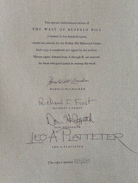 New York (1974): Harry N. Abrams, Inc. First Edition. Near Fine. oblong quarto, bound in publisher's green leather with a cast commemorative medallion mounted onto front panel. Signed, limited edition, #333 of 500 copies. Signed by all 4 authors: Harold McCracken, Richard Frost, Don Hedgpeth and Leo A. Platteter. A three part celebration of the Buffalo Bill Historical Center in Cody Wyoming. Part I "The Buffalo Bill Museum" - Part II "The Plains Indian museum" - Part III "The Whitney Gallery of Western Art." A single leaf (page 91/92) with marginal crease. A handsome production.