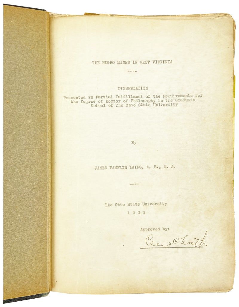 Late working draft of white anthropologist James T. Laing's doctoral thesis - a detailed account of Black miners and their families in the mining communities and company towns across the state of West Virginia, based in part on surveys, interviews, and first-hand sociological studies of the people, towns, and working conditions under which they often dangerously toiled. Evidently not the finished work, the first half of the text with fairly substantial ink corrections either in Laing's hand or that of his thesis advisor's.
