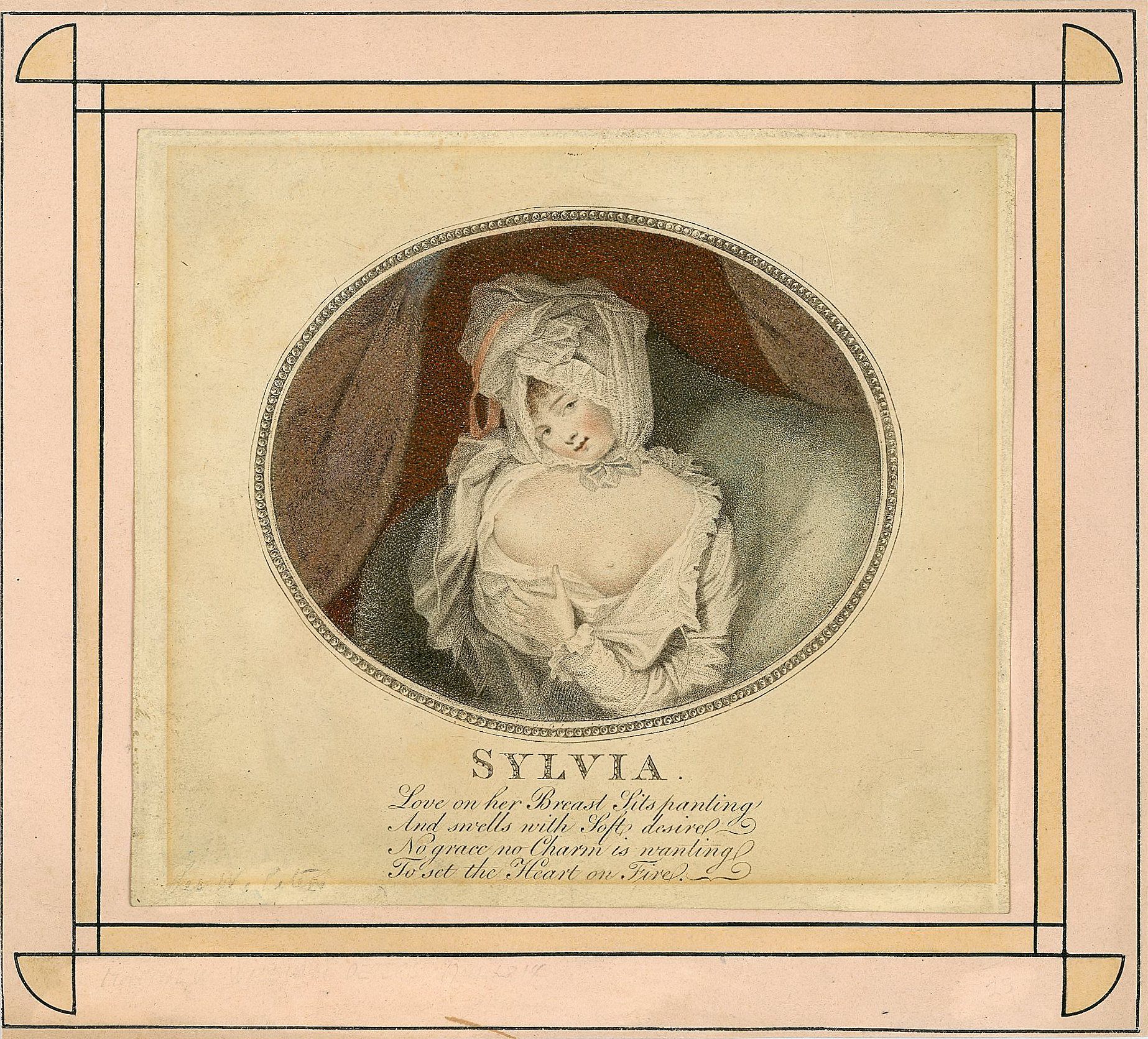 A 6 1/4" x 7" etching titled Sylvia depicting a coquettish woman with exposed breasts. The verse below from Acis and Galatea by John Gay and reads "Love on her Breast Sits panting' And swells with Soft desire No grace no Charm is wanting To set the Heart on Fire. Hand finished. Affixed to a geometric printed board page presumably from a scrap book. Peters name penciled at base lower left corner. Surface soiling.