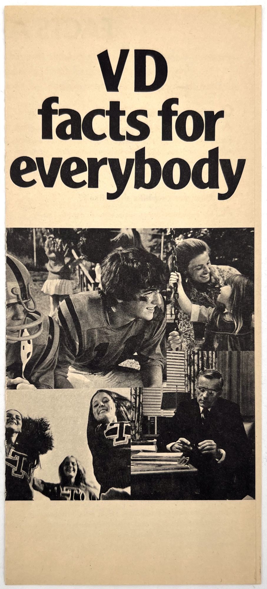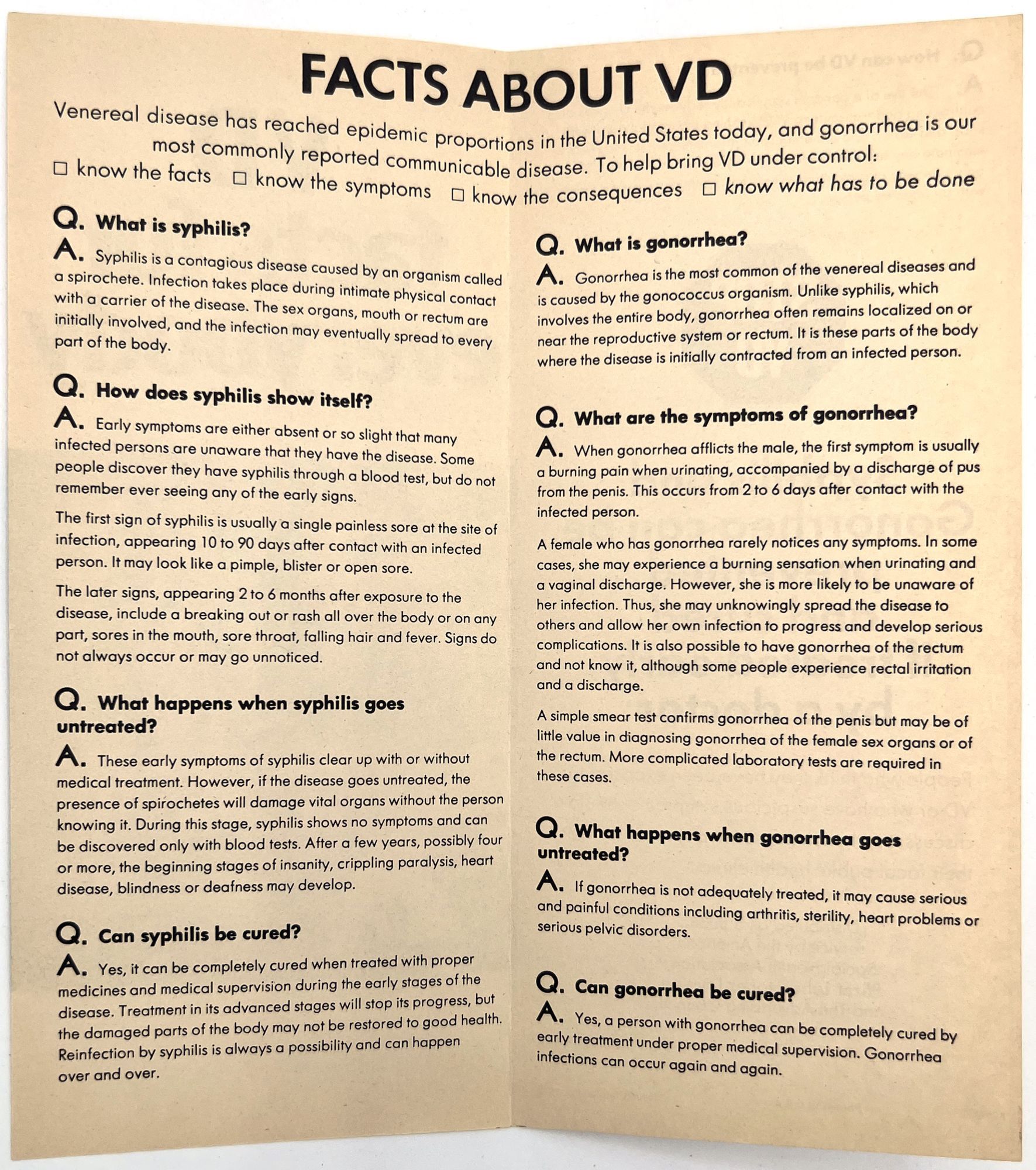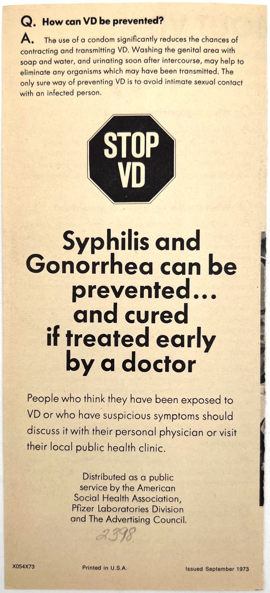 United States: American Social Health Association and Pfizer Laboratories, 1973. Very good. Toned.. A public health pamphlet on venereal disease distributed by the American Social Health Association and Pfizer Laboratories, aiming to educate the general public about the dangers of syphilis and gonorrhea. Formatted in a clear and concise Q&A format, the pamphlet answers questions such as "What happens when syphilis goes untreated?" and "How can VD be prevented?". Uses photos of happy teens, a mother and daughter, and a doctor on the front. Illus. bifolium (8.75" by 3.75").