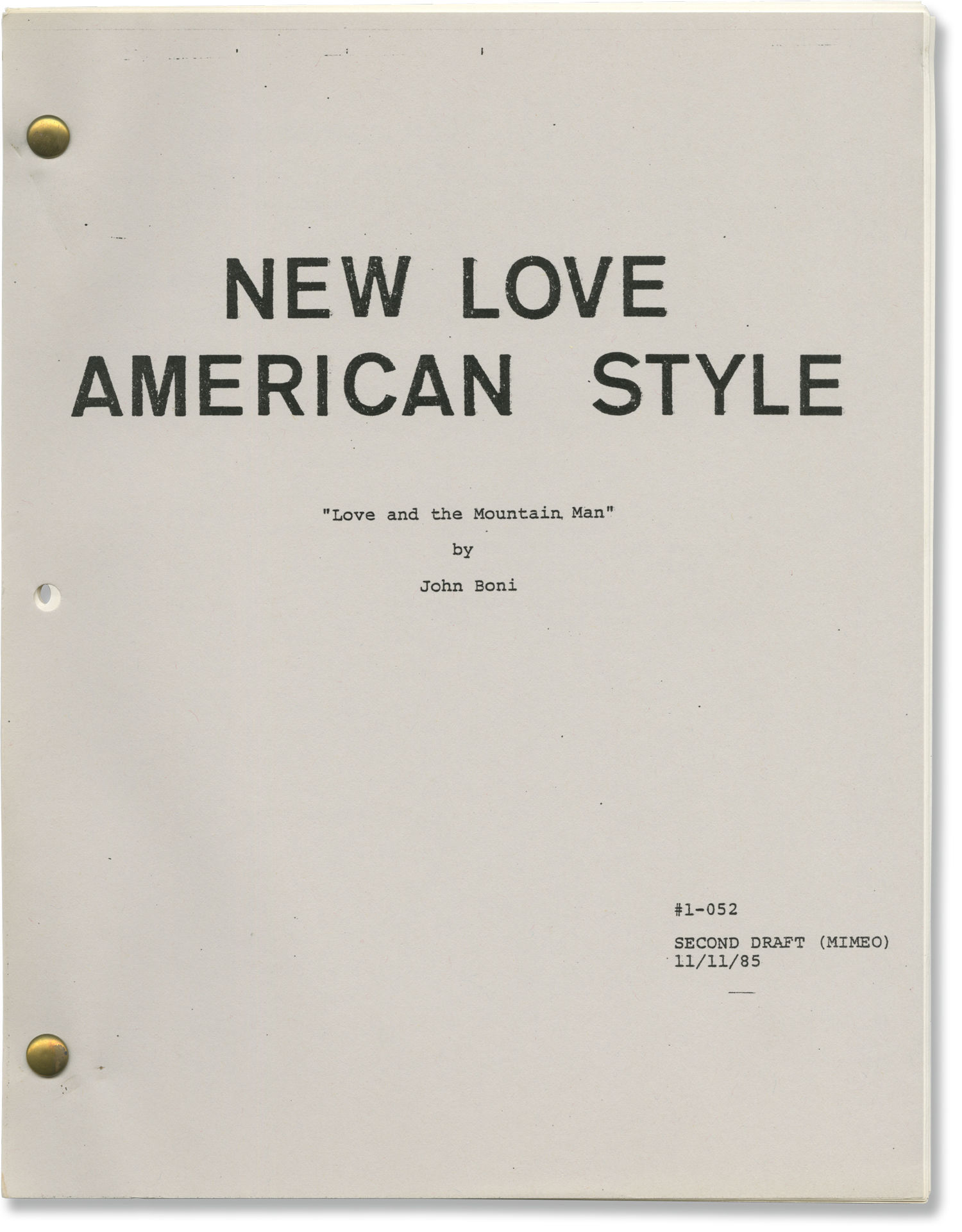 Gray titled wrappers, noted as SECOND DRAFT on the front wrapper, production No. 1-052, dated 11/11/85, with credits for screenwriter John Boni. Title page integral with front wrapper. 21 leaves, with last page of text numbered 20. Xerographic duplication, rectos only. Pages Near Fine, wrapper Near Fine, bound with two gold brads.