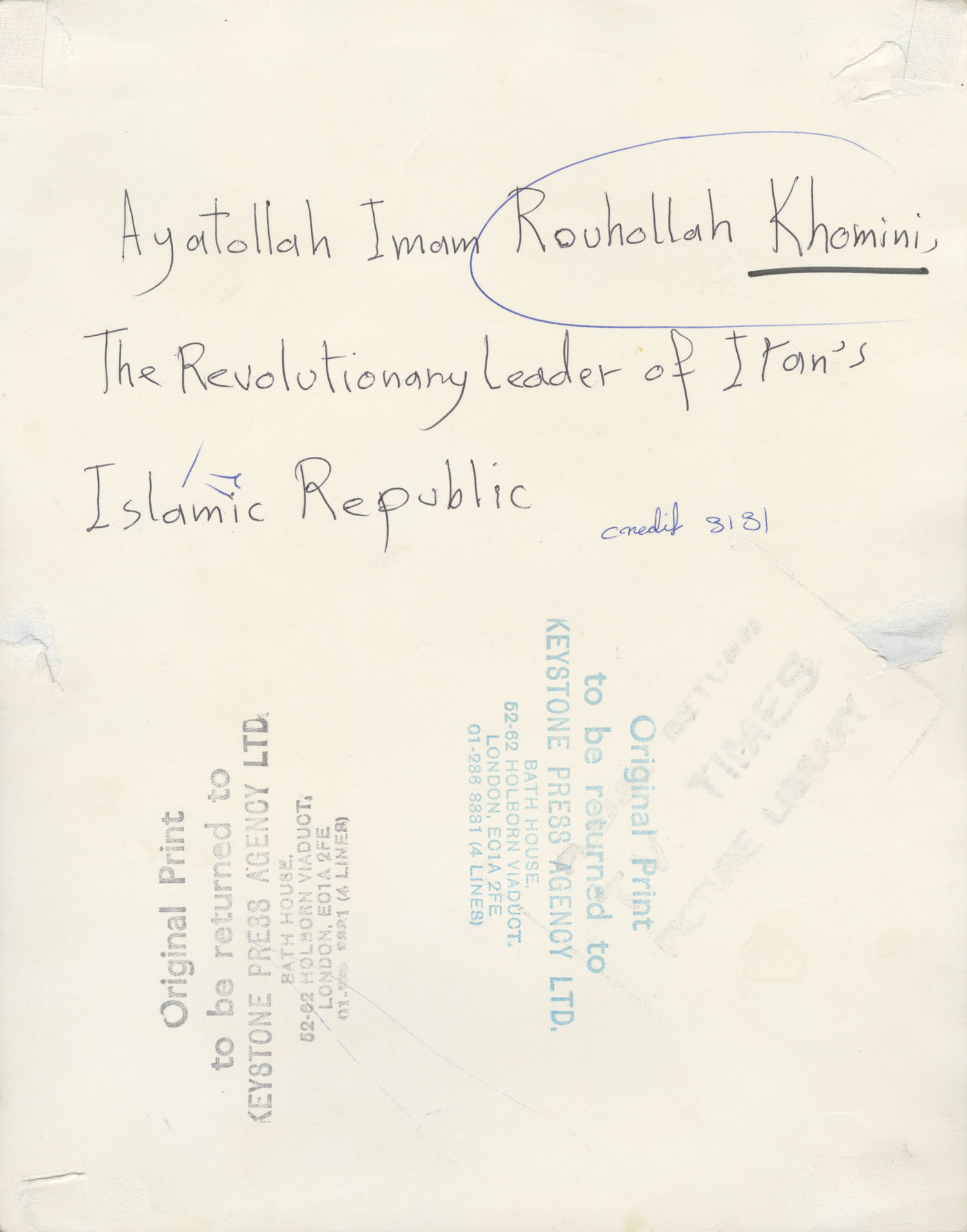 London: Keystone [Press Agency], 1980. Vintage borderless photograph of Iranian revolutionary, religious leader, and politician Ruhollah Khomeini, circa 1980s. Keystone Press Agency stamps and annotations in manuscript ink on the verso.