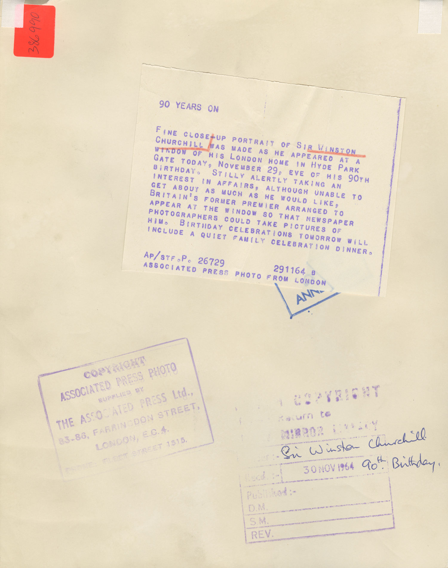 London: The Associated Press, 1964. Vintage borderless oversize photograph of Winston Churchill on November 29, 1964, a day before his 90th birthday. Printed mimeo snipe and the stamp of Associated Press on the verso.