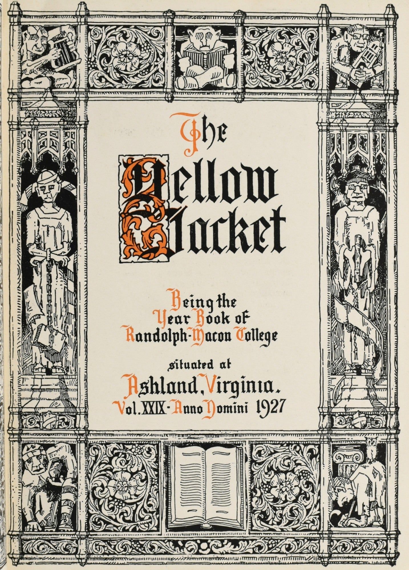 Ashland, Virginia: Randolph-Macon College, 1927. Hard Cover. Very Good binding. Quarto; in black embossed cloth with tiltling in gold; 185 pages, followed by a number of local ads, and profusely illustrated with black and white photographs, linocuts and silhouettes. ~~This is Volume 29 of The Yellow Jacket, 1927, the yearbook for Randolph-Macon College. We are very struck by a section at the back of the yearbooks "The Ten Books Every Man Reads" [including Puss In Boots, The Bible, The Arabian Nights and others]. The books are illustrated by full page captioned photographs of students in costume and posed to illustrate a scene from each book -- "The two men rolled over and over until they came to the edge of the precipice, and there they fought" -- Tales of Sherlock Holmes.~~We can imagine that the students enjoyed chosing their book and posing. Very Good binding.