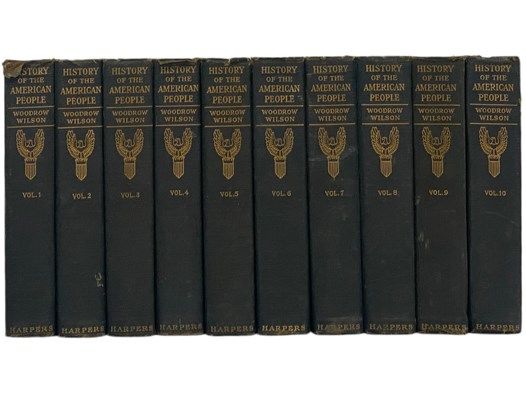 New York: Harper & Brothers, 1917. First Thus. Hard Cover. Very Good/No Jacket. 0x0x0. First thus. 1/2 inch tear to spine head of first volume, minor wear to corners of all volumes, original publisher's check slip and newspaper clipping regarding Wilson's death laid in. 1917 Hard Cover. Complete in ten volumes. Expanded from 1902 five-volume edition with original source material, etc. This edition precedes the limited edition of this expanded version, which was released in 1918. A history of America and its citizens by the 28th President of the United States. The work was originally published twelve years before he was elected to the office, while he was serving as President of Princeton University, and began as a series of articles written for Harper's magazine. The work is quite controversial for its apologetic position with regard to the formation and actions of the Ku Klux Klan, specifically Wilson's dismissal of lynchings, and is often used to assert that racial prejudice informed many of Wilson's social policies. Wilson's work is quoted in The Birth of a Nation, a film controversial for its negative portrayal of African-Americans. Wilson viewed the film at the White House (it was the first film to be viewed there), but later distanced himself from it.