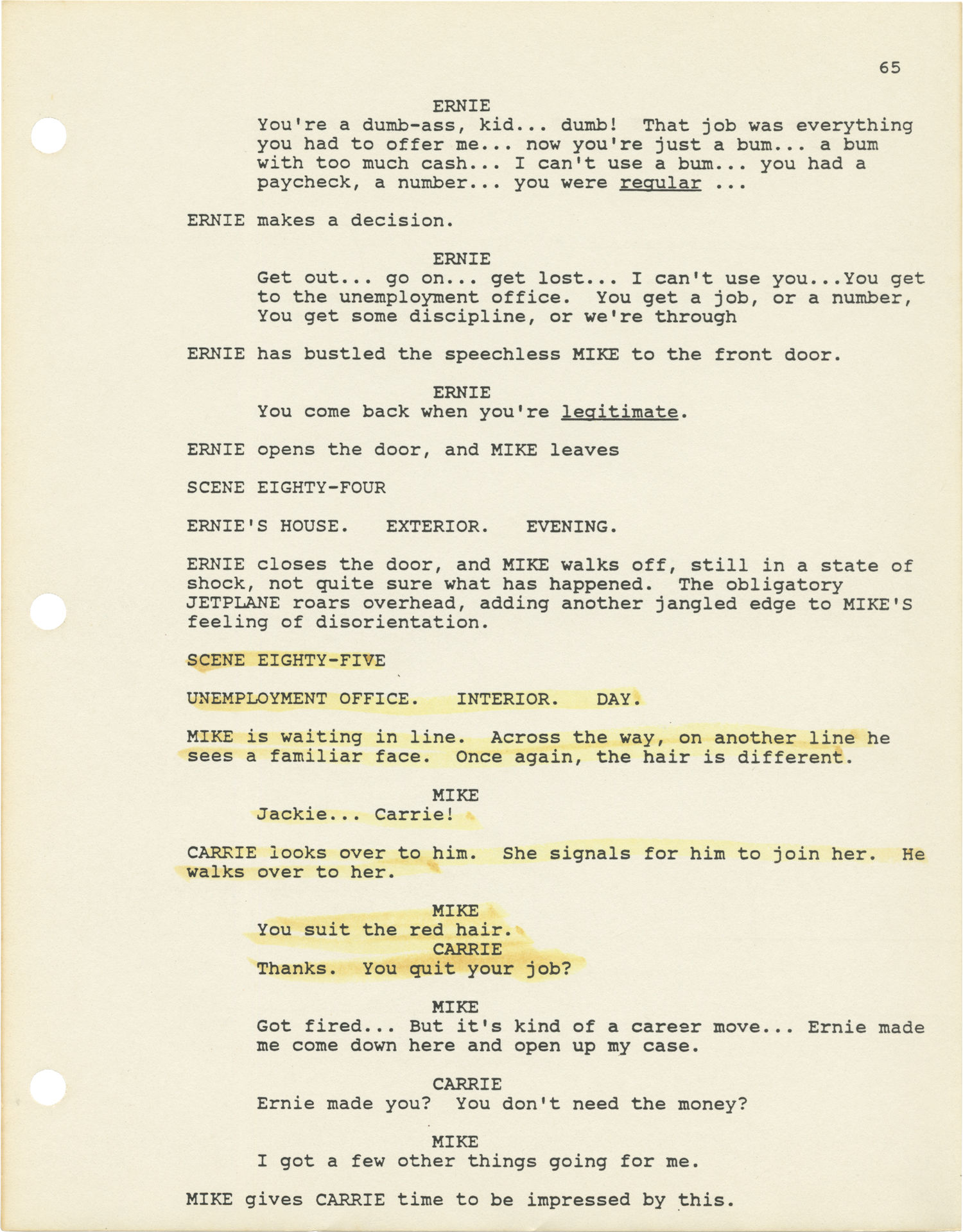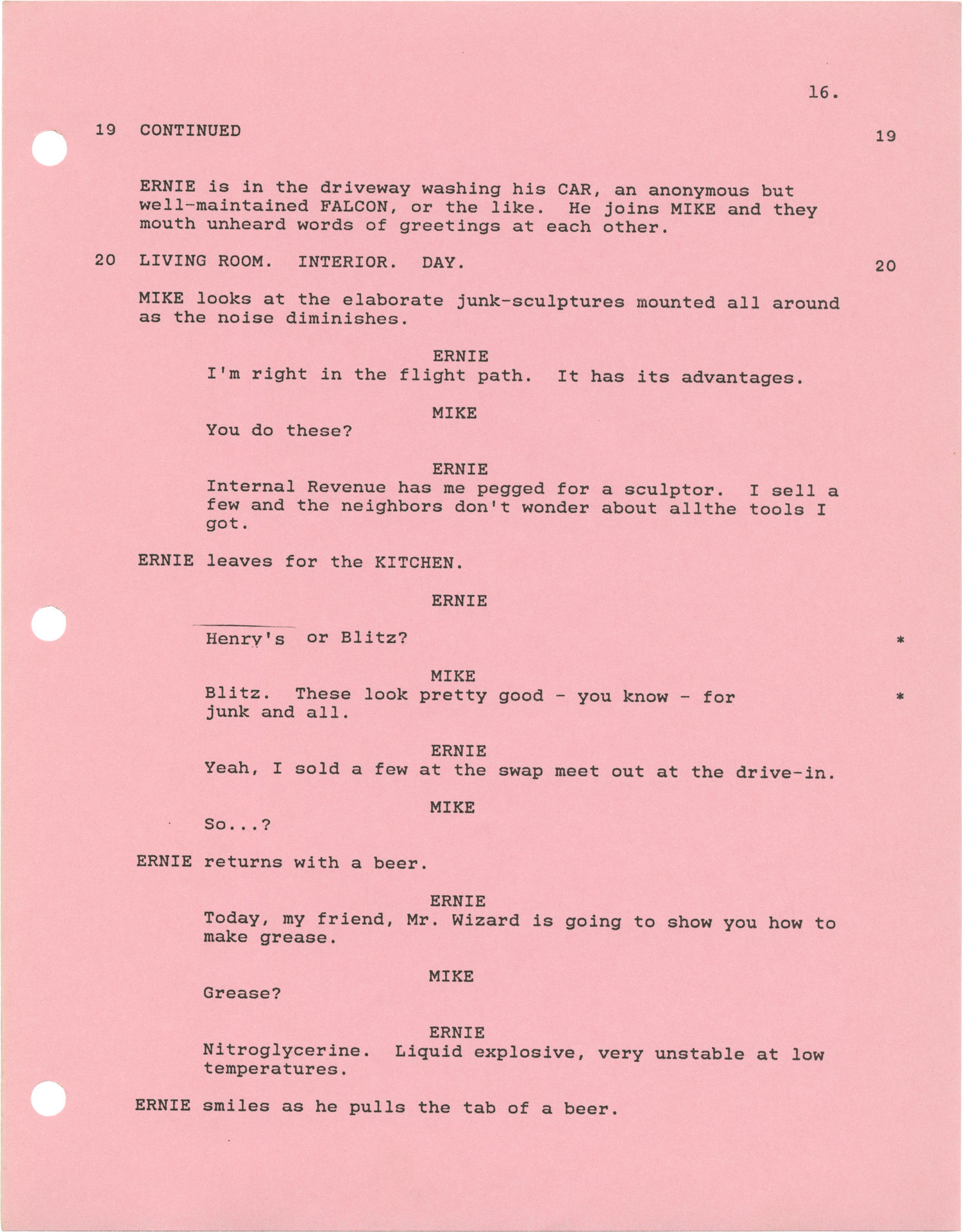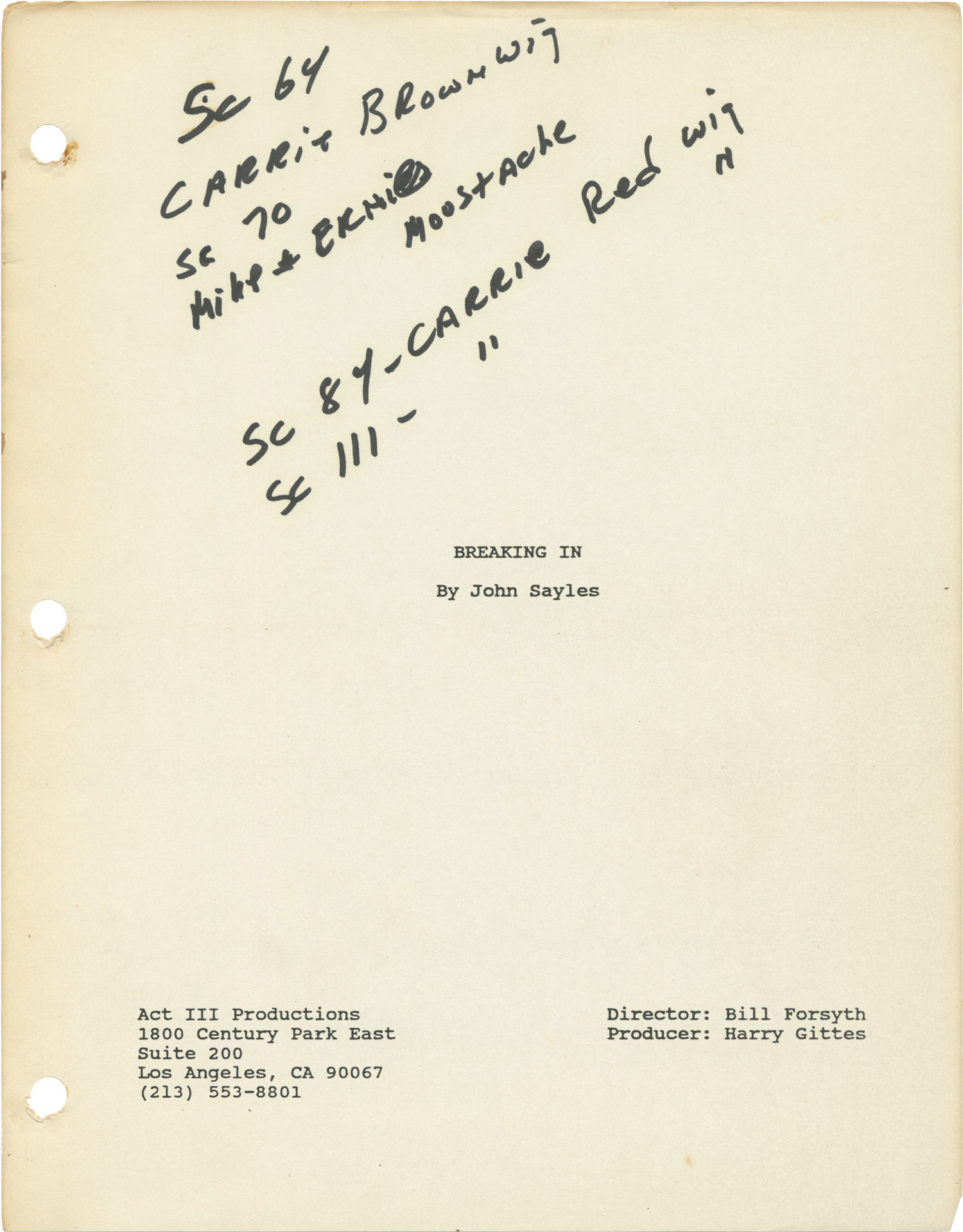 Blue untitled wrappers. Title page present, with credits for director Bill Forsyth and screenwriter John Sayles. 128 leaves, with last page of text numbered 112. Xerographic duplication, rectos only, with blue, pink, and green revision pages throughout, most undated, with one dated June 15, 1988. Pages Near Fine, wrapper Very Good, moderately soiled, bound with three silver brads.