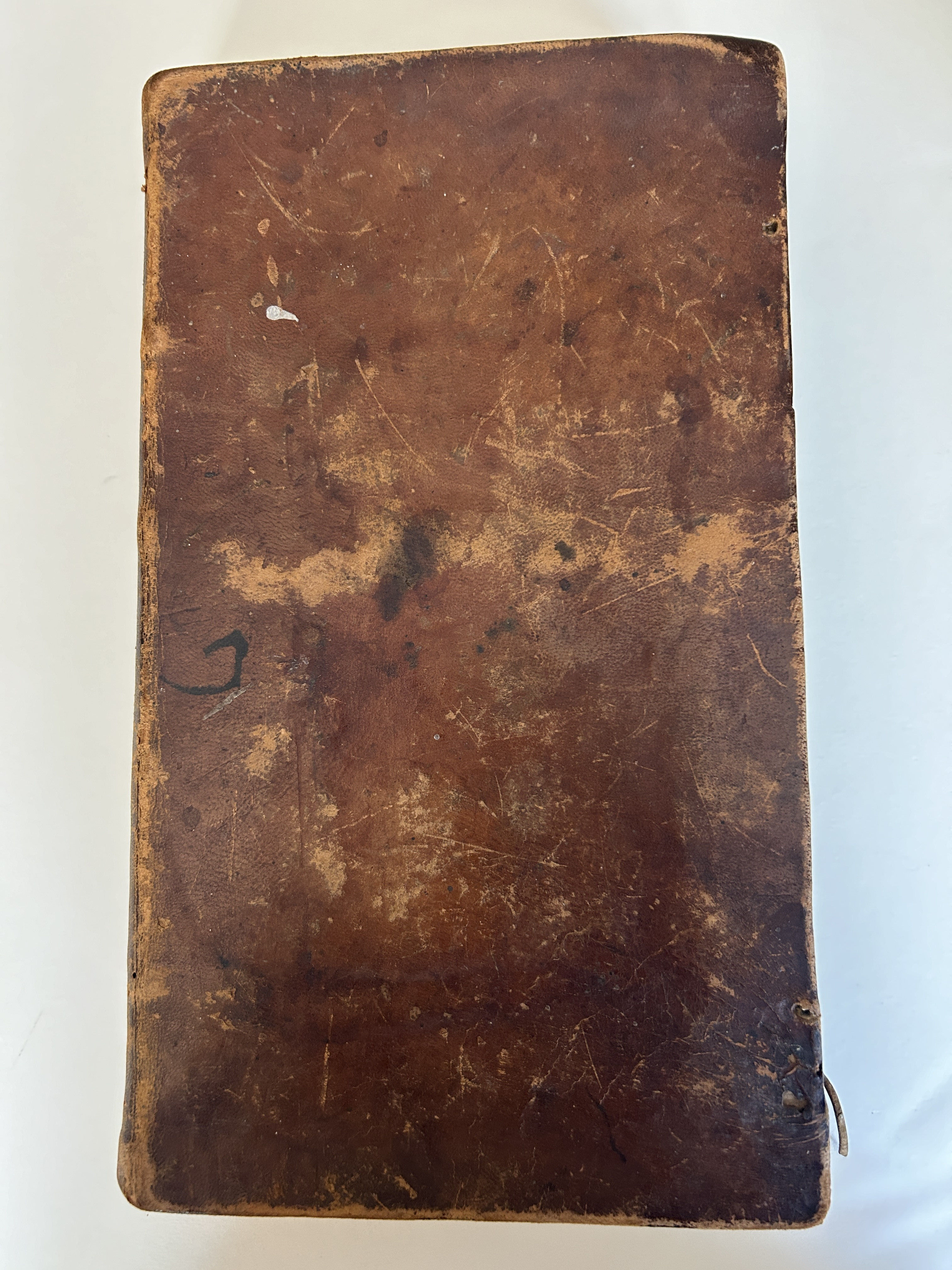 Also includes a family geneaology and history on page 207 of Isaac Sanderson's children. Ephemera and scattered handwritten notes laid in. Album documents the business in Western Mass for thirty years, displays industry products from a cooper and the materials needed to run such business. As the dates and entries move through the years, the ledger also generates insight into the evolution of products being introduced like "hemlock oil" and "calf skins." Lastly, tell the story abuot the impactful legacy the Salem Witch Trials have left behind on the descendents in their lifestyle and generational decision-making. Moderate rubbing, scuffing, toning, browning to extremities, toning, evidence of dampness, and discoloration throughout. Bound dark brown calf, handwritten in brown ink, remnants of leather ties. 215 [leaves], multitple handwritten notes/ephemera laid in on various bit of paper. Handdrawn alphabetical tab labels laid in.