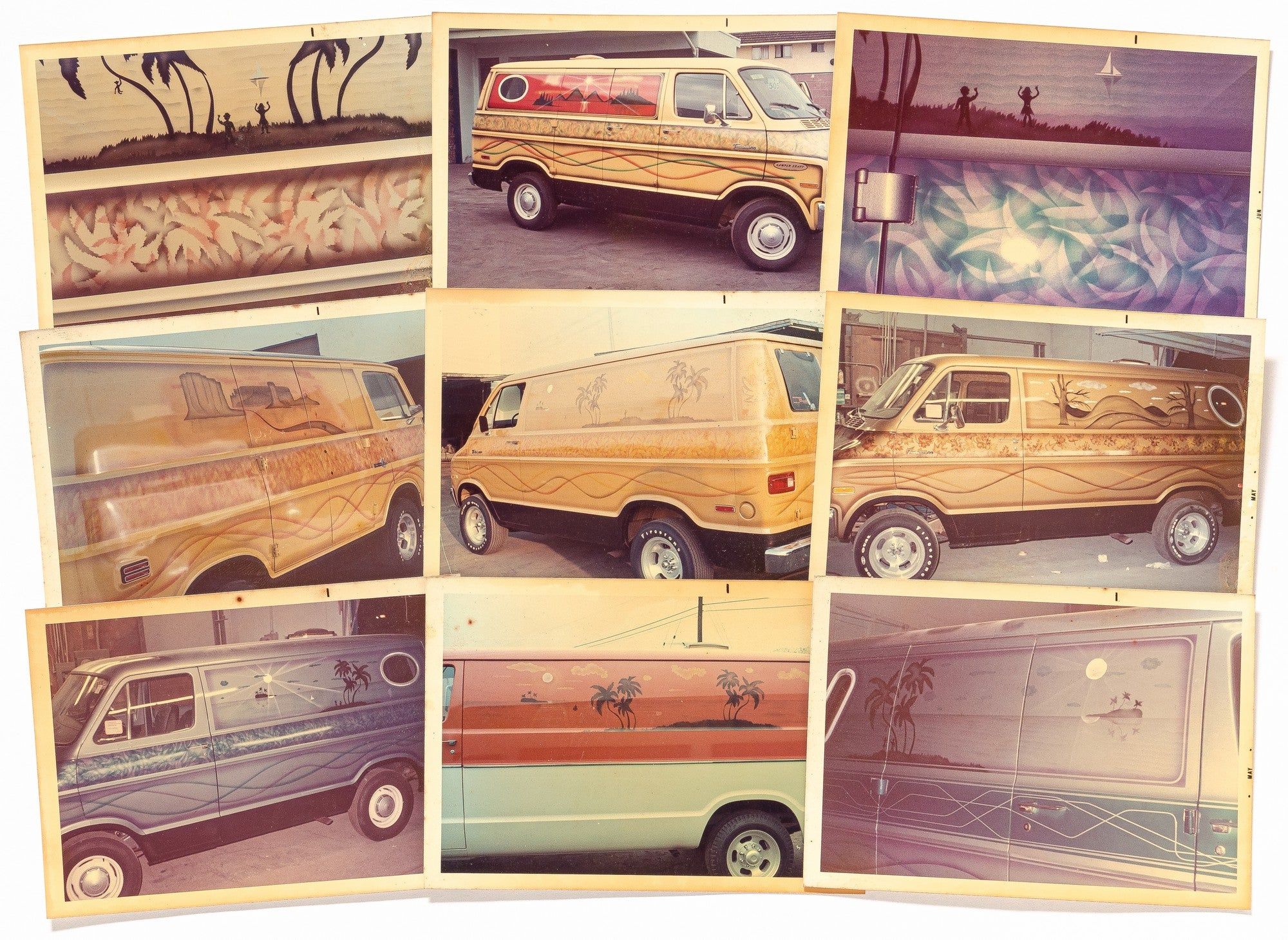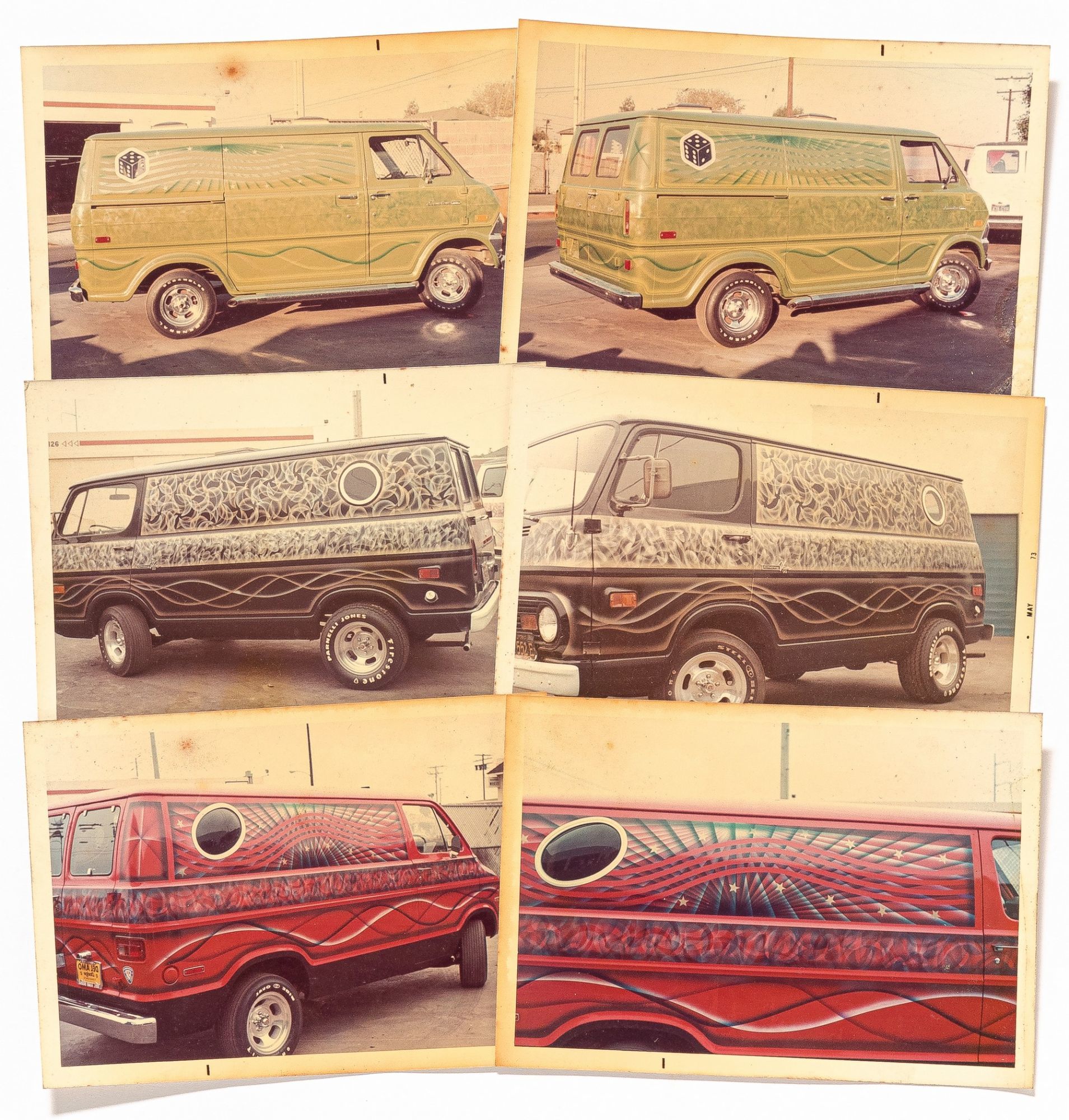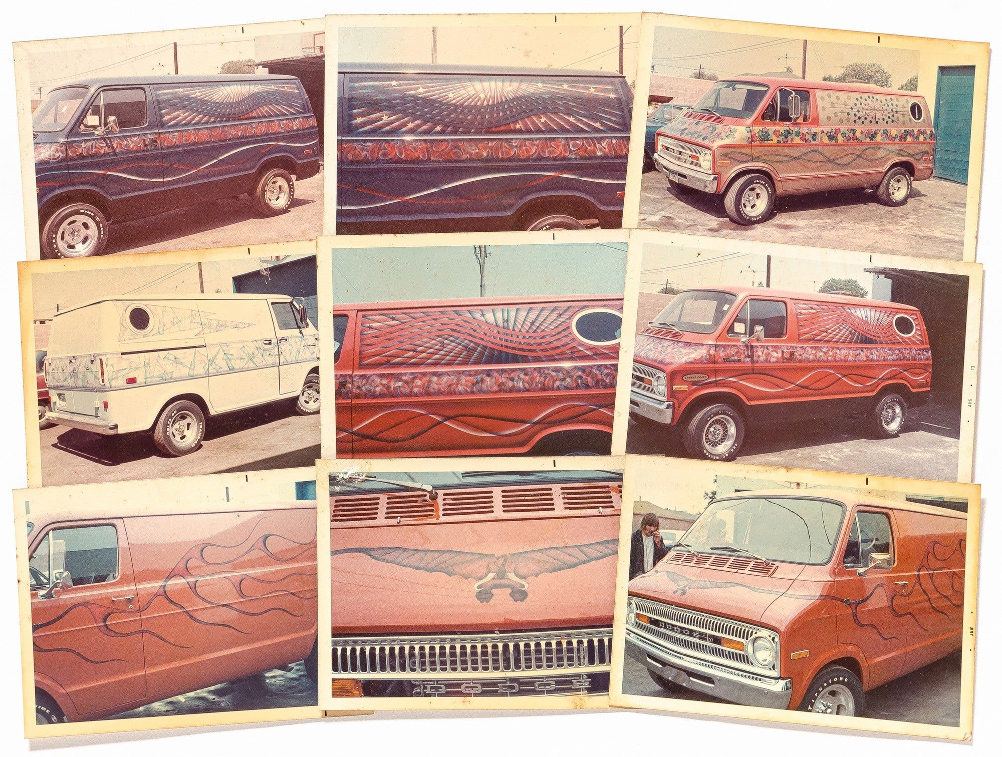 In the early 1970's, with the muscle car era coming to an end, panel vans swept through the custom car scene like a psychedelic wave, becoming the vehicle of choice for many people who wanted to express themselves through their ride. Arguably the best way to stand out was with a custom airbrush paint job. Many different paint styles can be seen throughout this album, including murals, smoke, panels, tape, flames, stenciling, and more. The photos feature about 45 different custom vans, along with five different trucks, several Corvettes, a Mustang, a Camaro, two Datsun 240Z's, a Honda Civic, a Beetle, several Porsches (911's, 356's, and a 914), and more. A few vehicles are depicted both before and after their paint jobs.