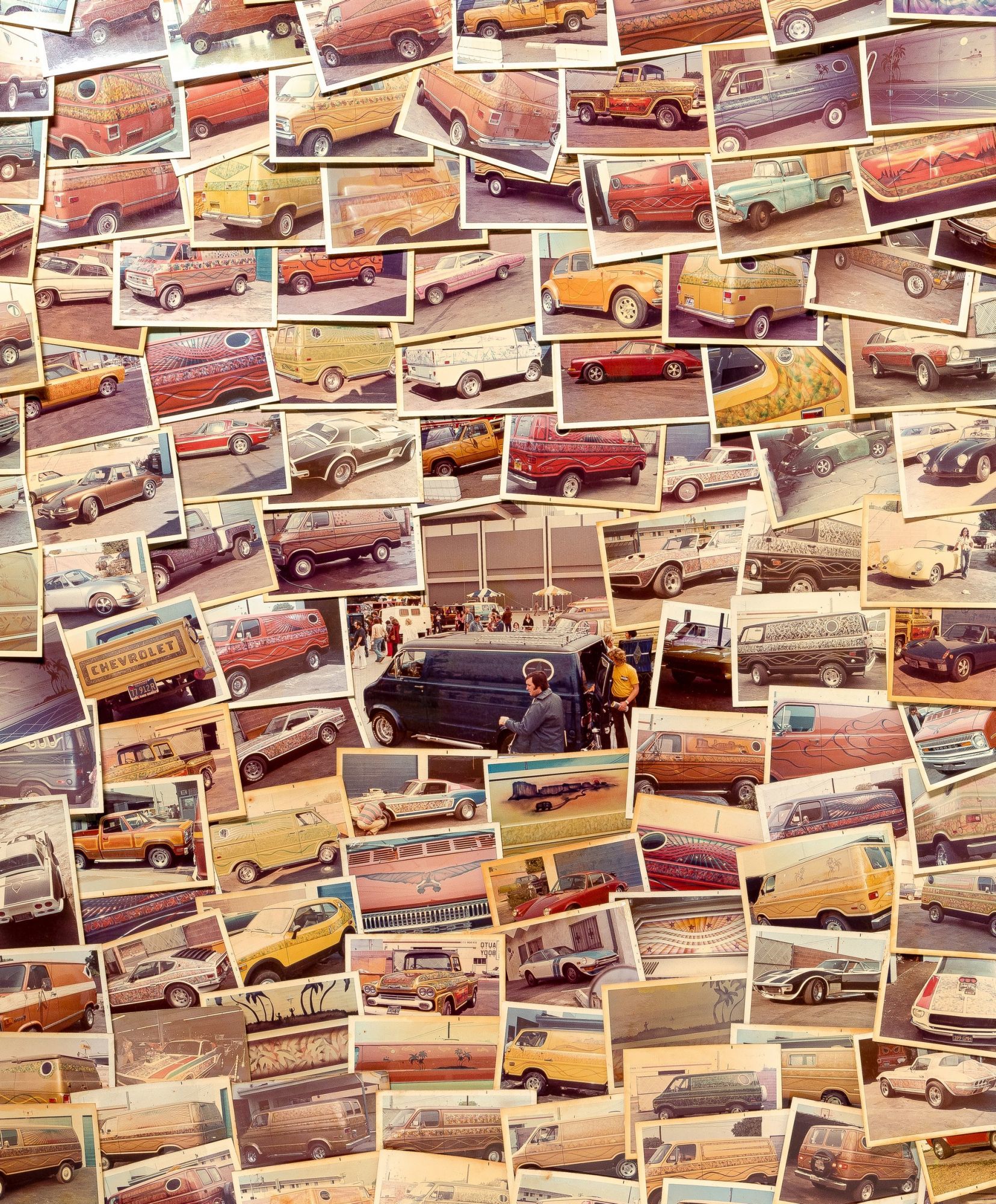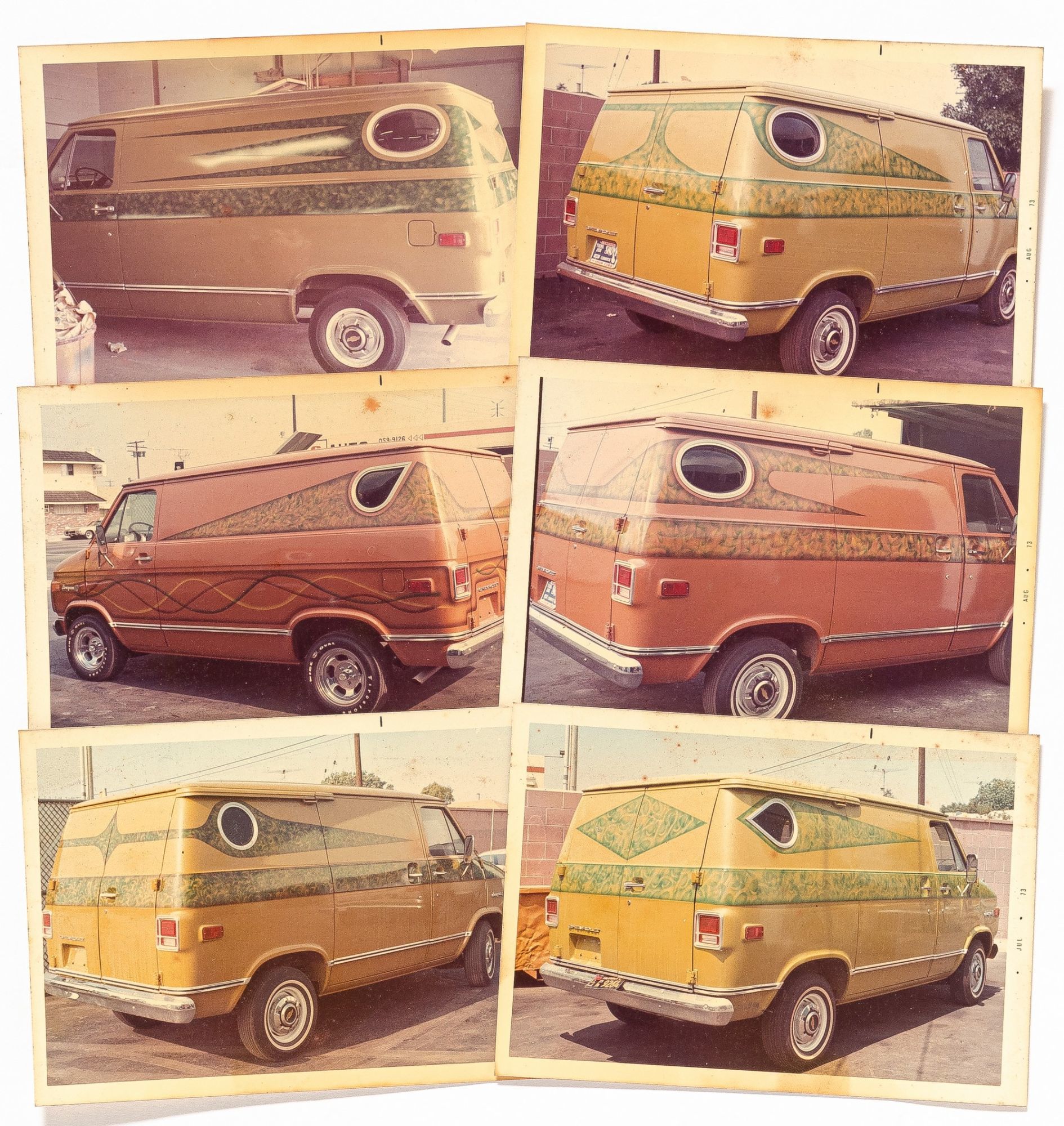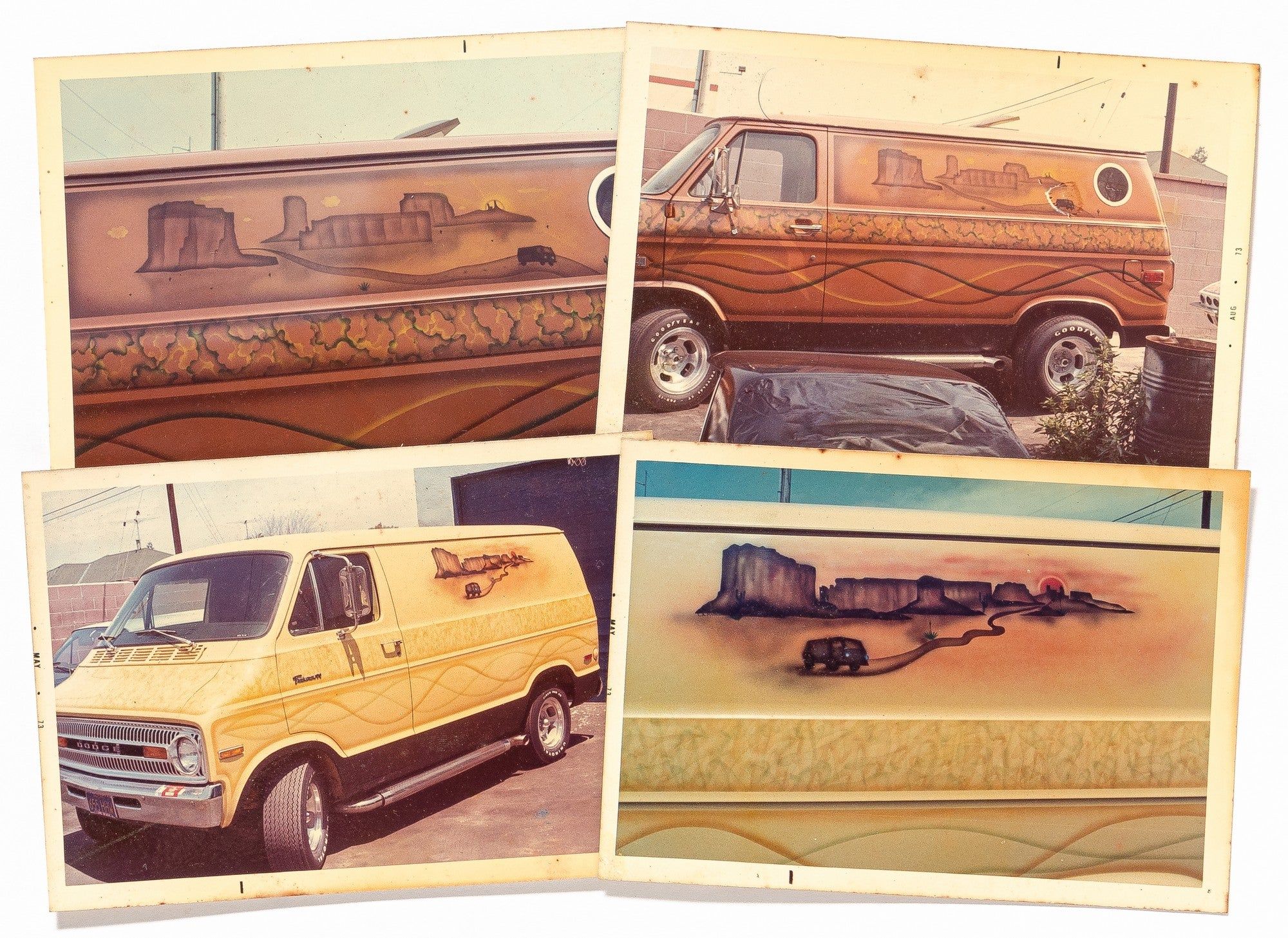 In the early 1970's, with the muscle car era coming to an end, panel vans swept through the custom car scene like a psychedelic wave, becoming the vehicle of choice for many people who wanted to express themselves through their ride. Arguably the best way to stand out was with a custom airbrush paint job. Many different paint styles can be seen throughout this album, including murals, smoke, panels, tape, flames, stenciling, and more. The photos feature about 45 different custom vans, along with five different trucks, several Corvettes, a Mustang, a Camaro, two Datsun 240Z's, a Honda Civic, a Beetle, several Porsches (911's, 356's, and a 914), and more. A few vehicles are depicted both before and after their paint jobs.