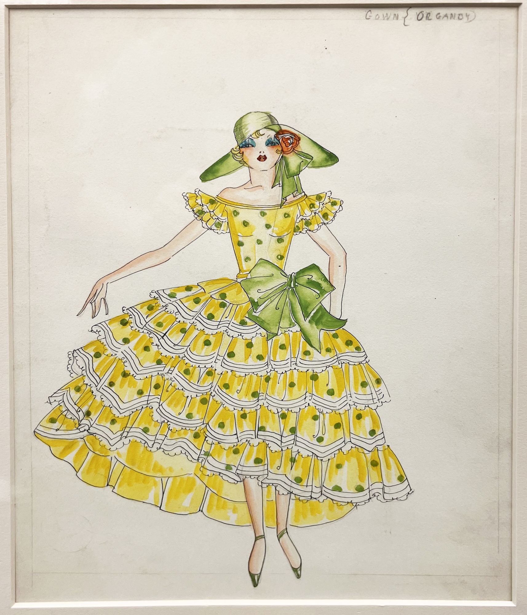 "GOWN (Organdy)". Original pen and ink and watercolor design for yellow and green dress made form organdy fabric. Measures 18" by 14" matted.
