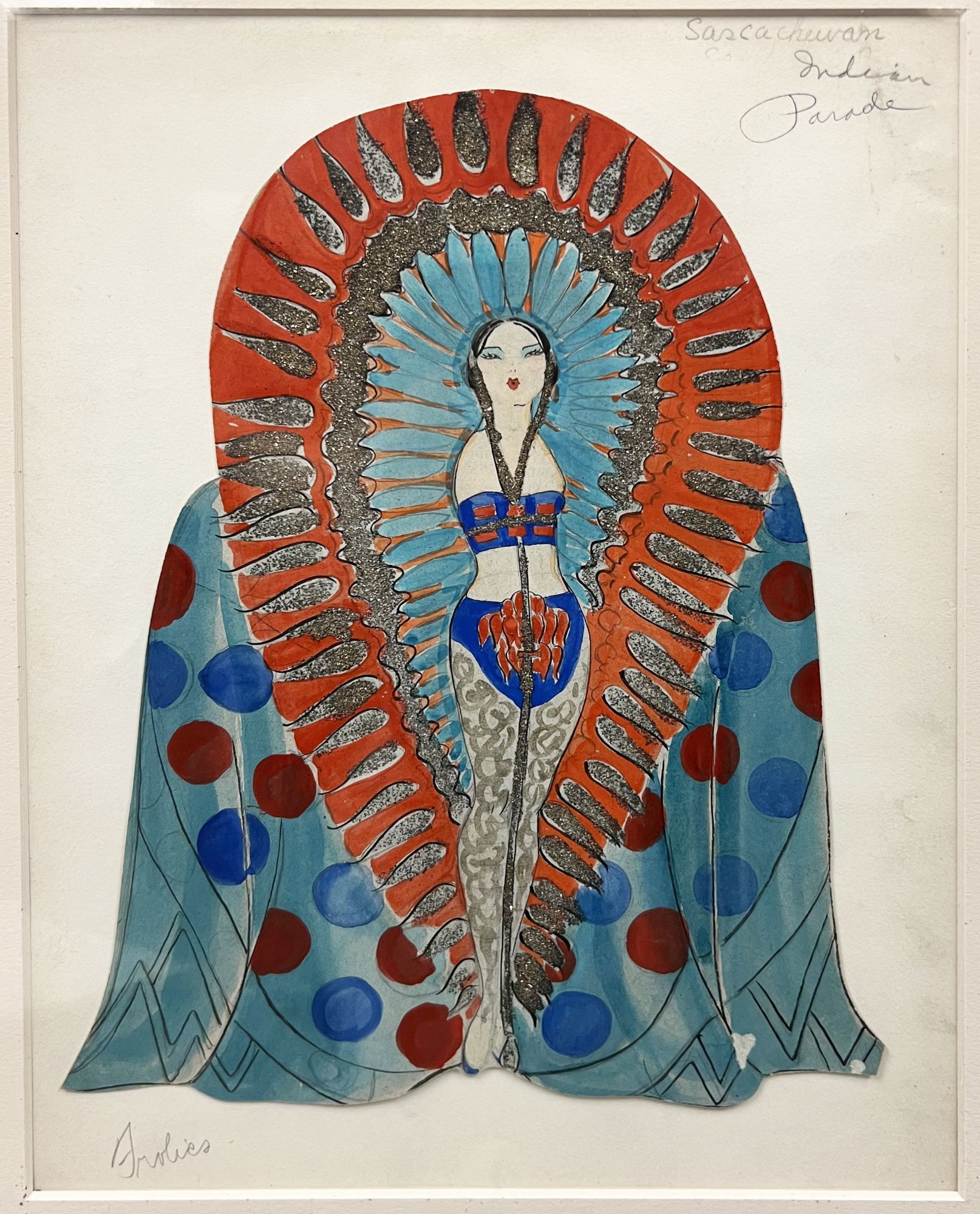 "Saskatchewan Indian Parade". Original watercolor and glitter design for a Canadian Native American-themed parade costume. Cut from original sheet, approx. 12" in height and mounted in 18" by 14" mat.