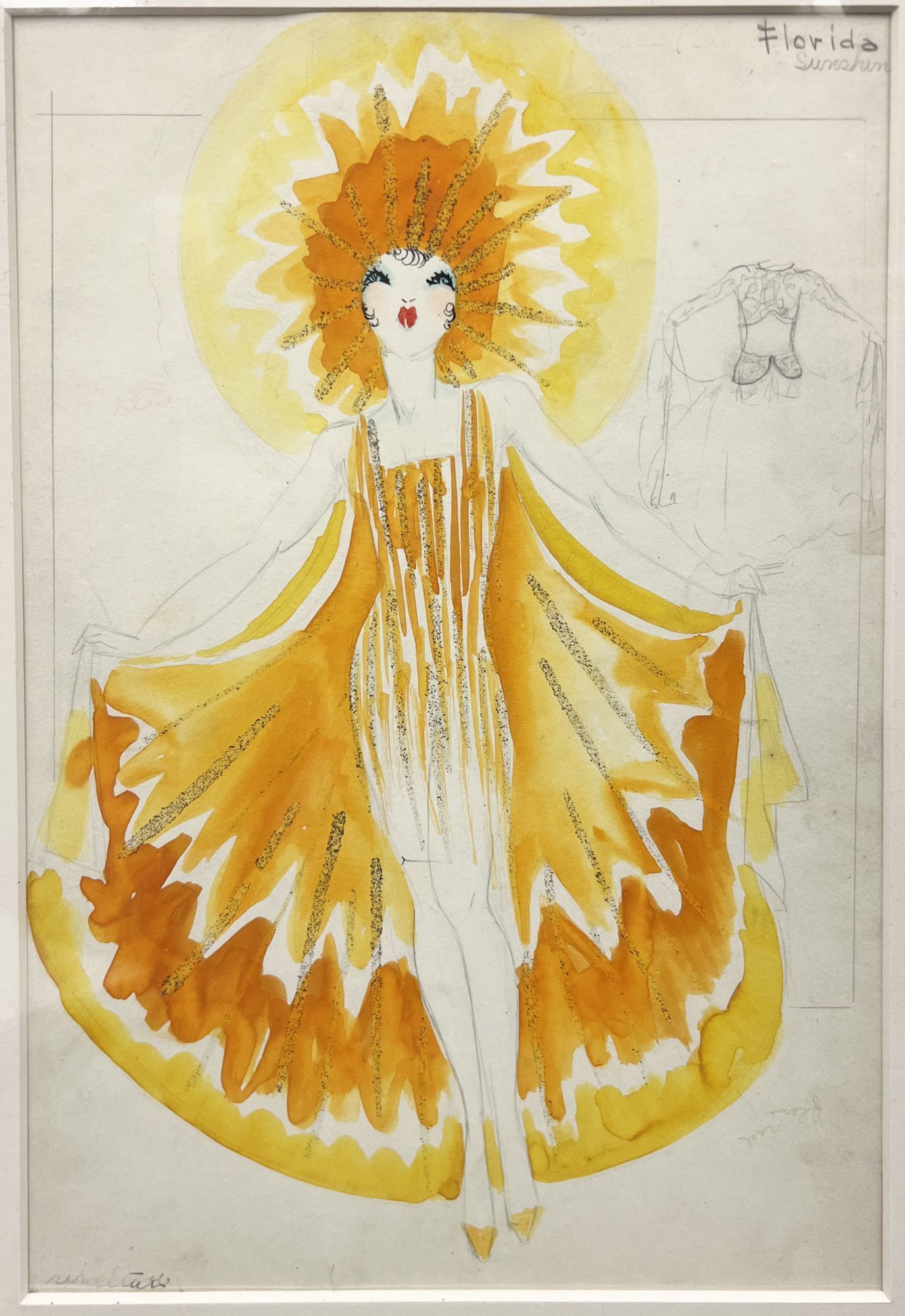 "Florida Sunshine". Original pencil, watercolor and glitter design for a Florida-themed parade costume. Measures 18" by 14" matted.