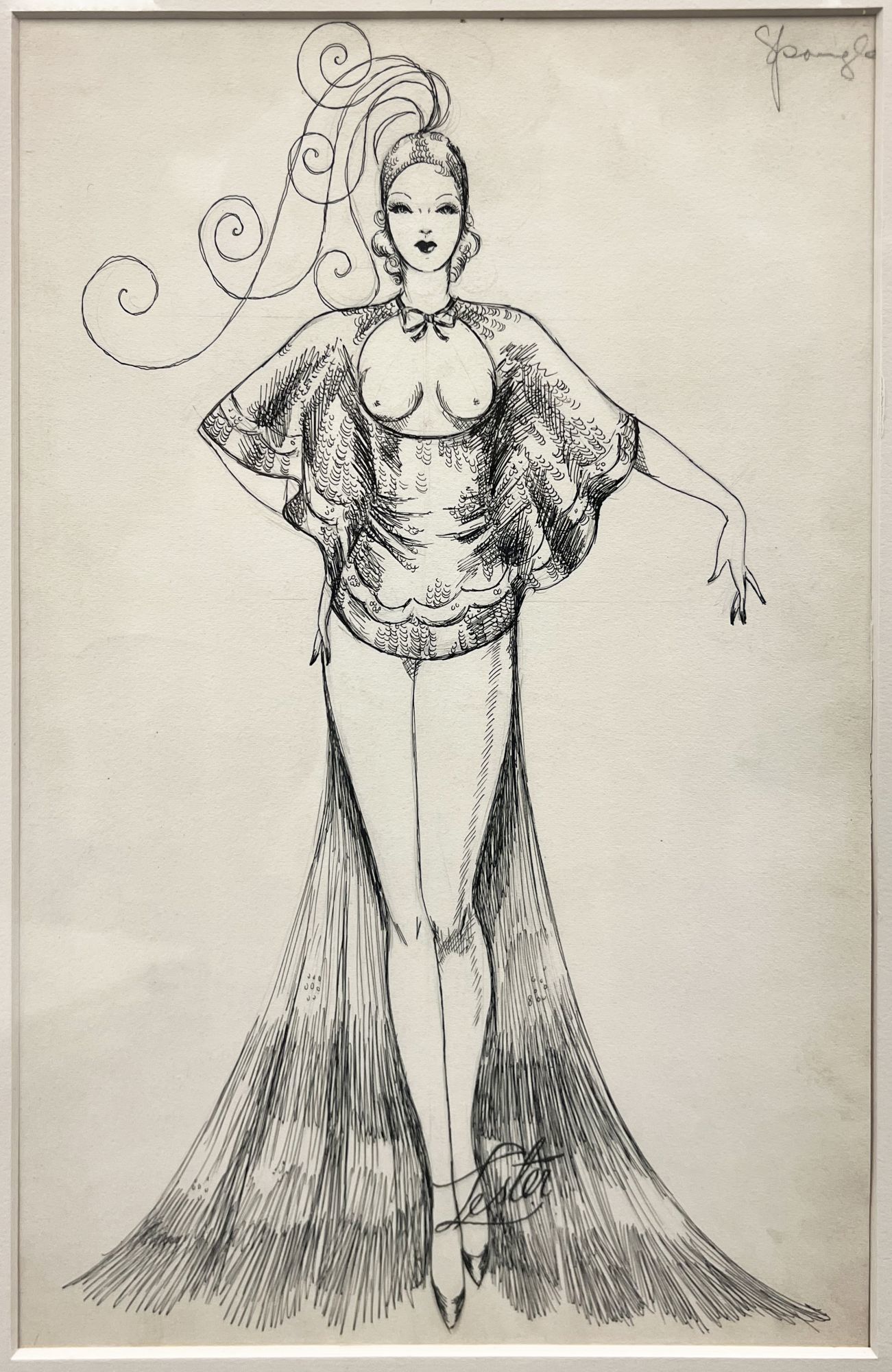 "Spangle". Original pen and ink costume design for a burlesque-style stage costume. Measures 18" by 14" matted.
