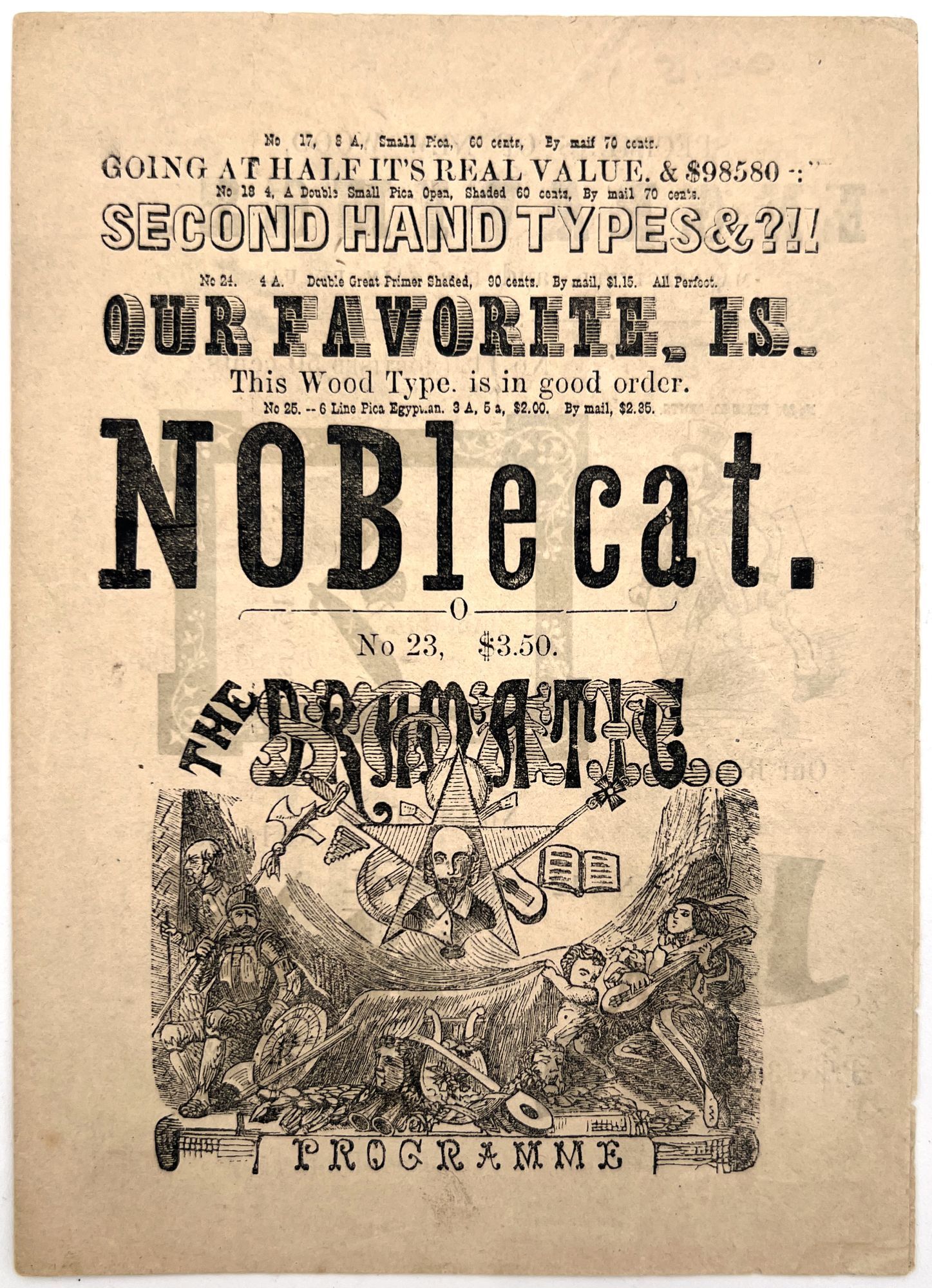 N.p.: N.pl, 1890. Good. Toned with a couple nicks or creases.. A printed specimen of different wood engraved images and "SECOND HAND TYPES&?!!", ready for newspaper publishers and other jobbing printing. Each is priced with an item number. Some of the images include: a political cartoon depicting an "Inflationist Candidate" before and after being dumped in a barrel of tea by voters; a policeman ushering a prisoner into a jail cell with a billy club; a top hat; a horse getting a new shoe from a farrier; a pile of books; three wood cuts of birds stylized to resemble calligraphic drawings; and a complete headpiece for a theatrical program, complete with different allegorical figures and a bust of Shakespeare in the center. There is no maker or publisher listed, but a previous owner has suggested "C.T. Crampton" of Cortland, New York as a possible source/maker. Printed bifolium (7.5" by 5.25").