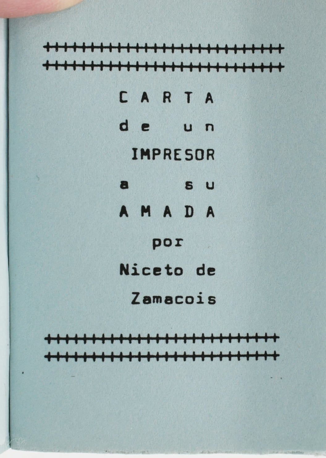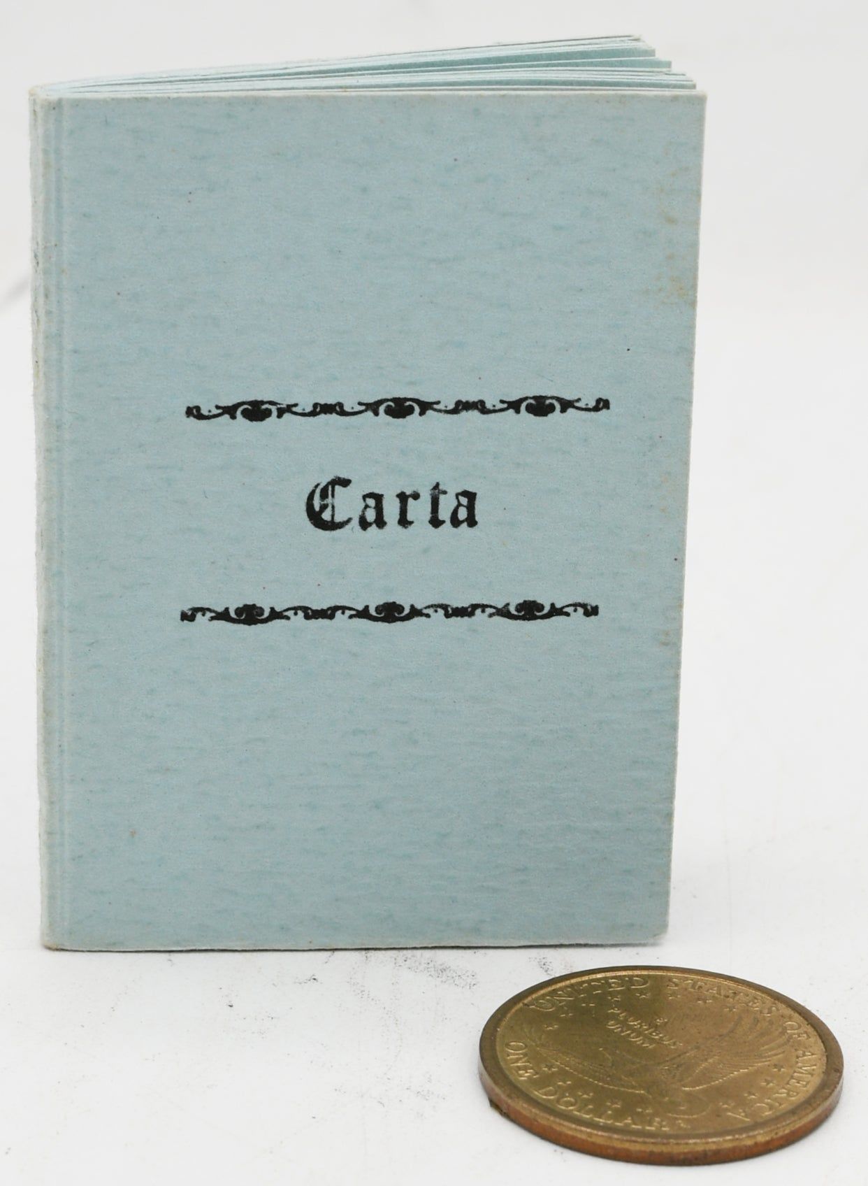 Mexico: Trifon Lecturas, 1979. 2 ½” x 1 ¾” light blue tome titled ‘Carta (Letter)’ by Mauricio Charpenal published through Trifón Lecturas, reprinting an historical letter. Charpenal is the author of a 1970 book about miniatures in popular Mexican art. The intro states that this letter was written by Niceto de Zamacois, a Spanish/Mexican historian, journalist, novelist, and poet. ~~Per Charpenal, Zamacois originally published it in in an 1861 periodical, ‘El Jarabe’. ‘El Jarabe’ translates loosely to ‘medicine’, as in syrup. El Jarabe is also known in English as the Mexican hat dance, which gained popularity in the 19th century. The book contains a glossary of terms after the letter related to printing. Spanish language. Mexico: 1978. 32pp. Very good.