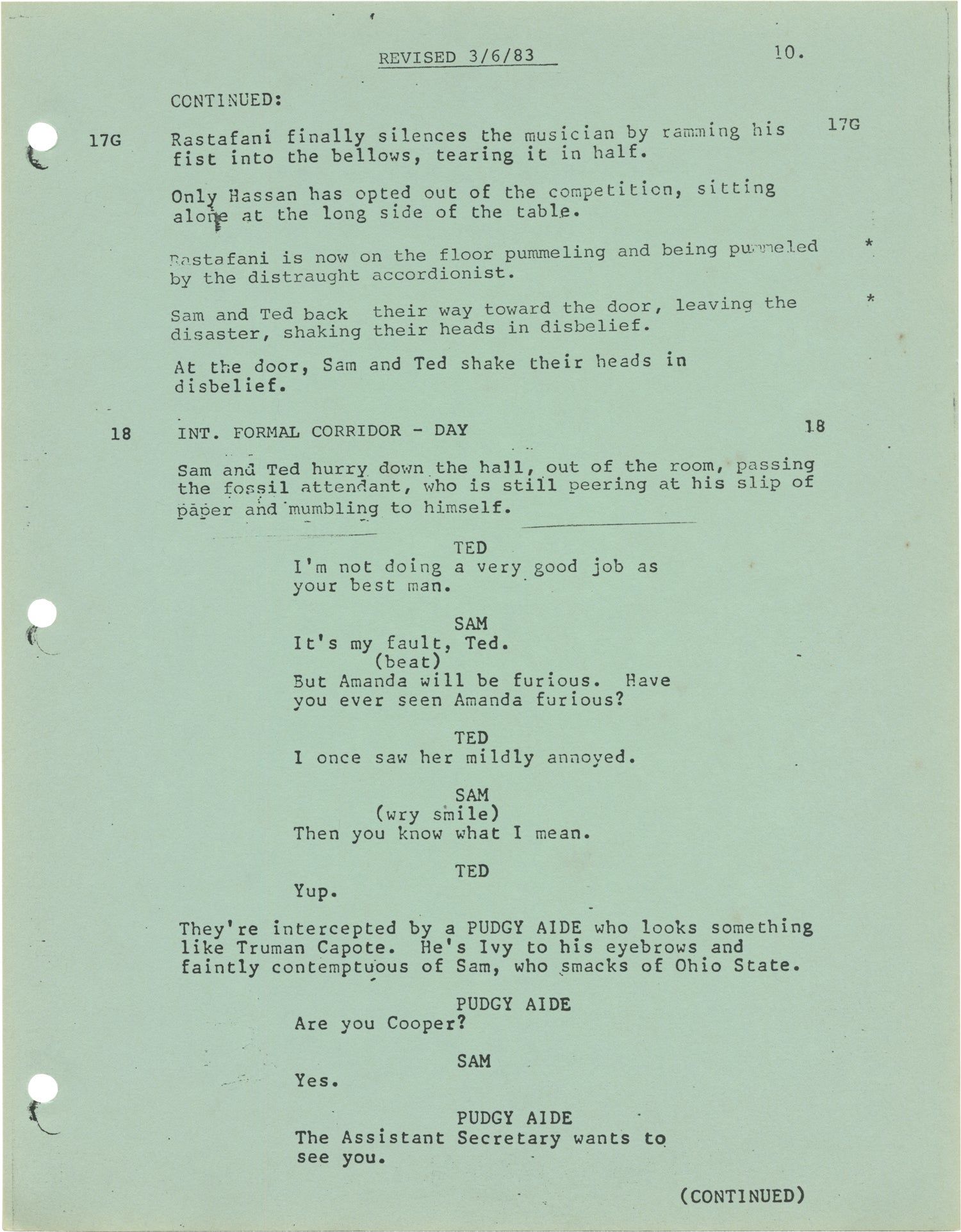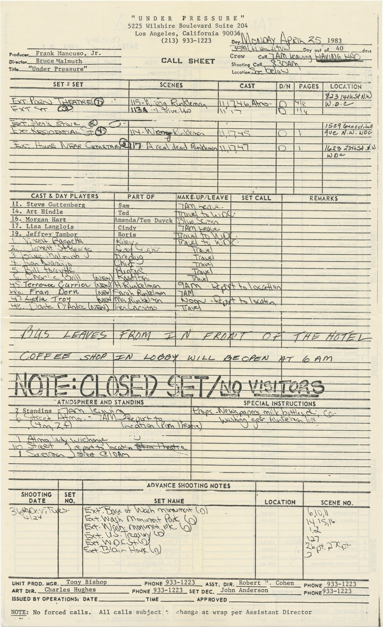 N.p.: N.p., 1983. Final Draft script for the 1983 film, seen here under the working title "Under Pressure." Call sheet dated April 25, 1983, laid in.