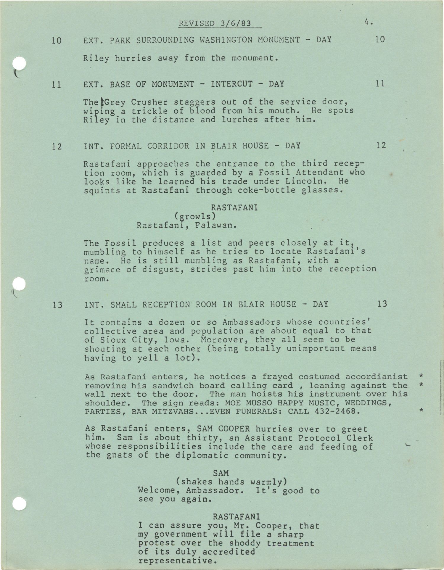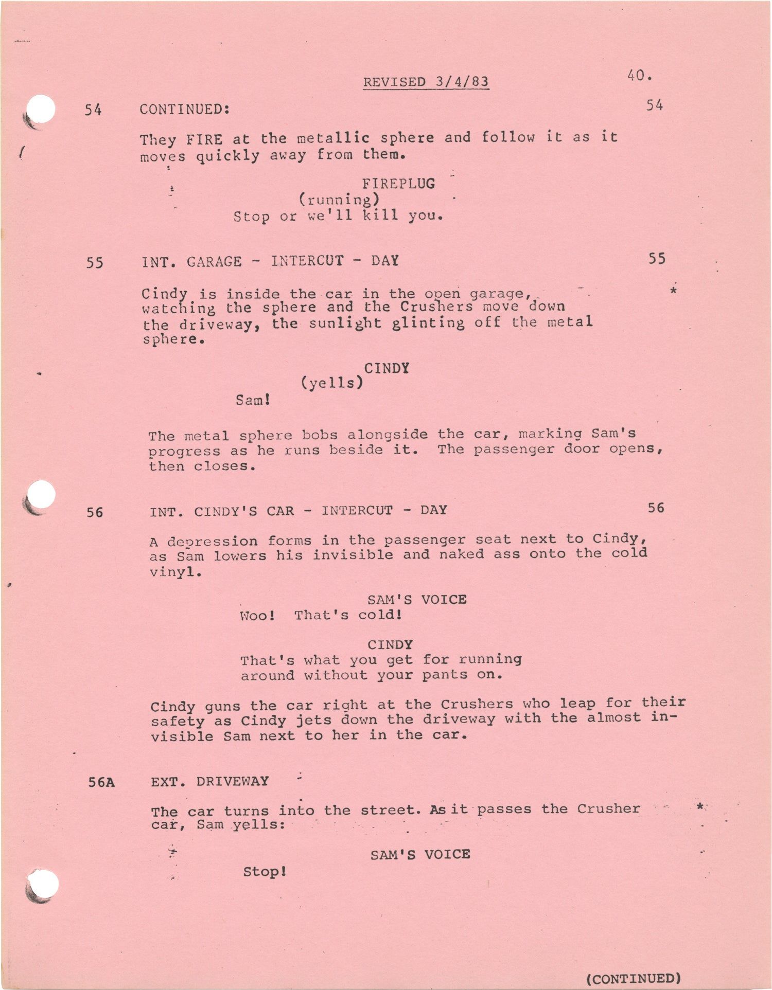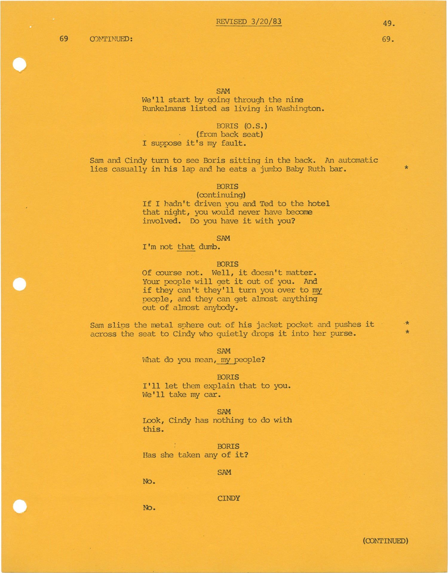 Blue titled wrappers. Title page present, dated February 28, 1983, noted as FINAL DRAFT, with credit for screenwriter Stanford Sherman. 115 leaves, with last page of text numbered 110. Xerographic duplication, rectos only, with rainbow revision pages throughout, dated variously between 3/3/83 and 3/28/83. Pages Very Good plus, wrapper Very Good plus, lightly edgeworn, with faint foxing on a few leaves, bound with two gold brads.