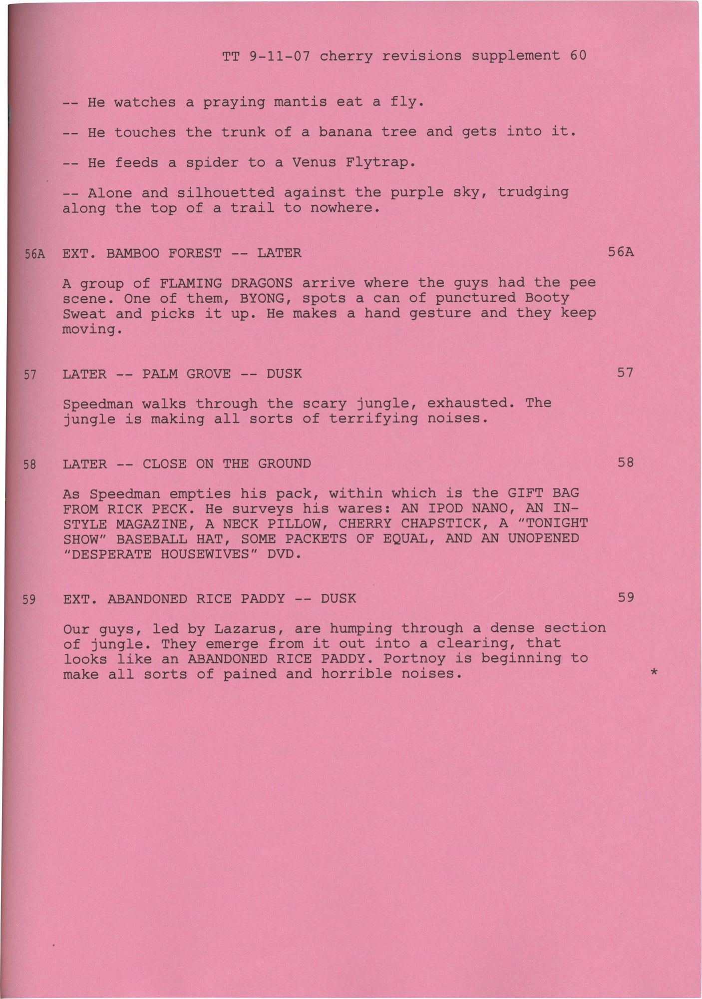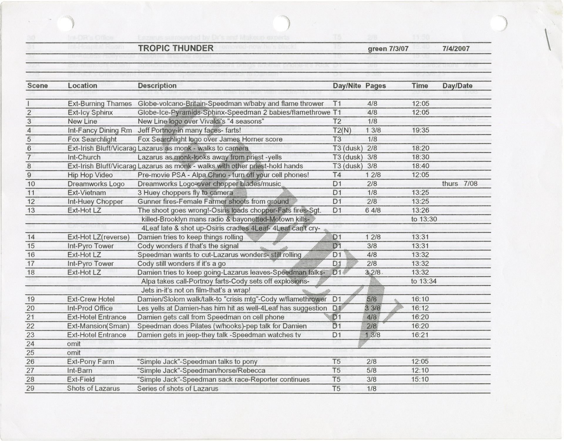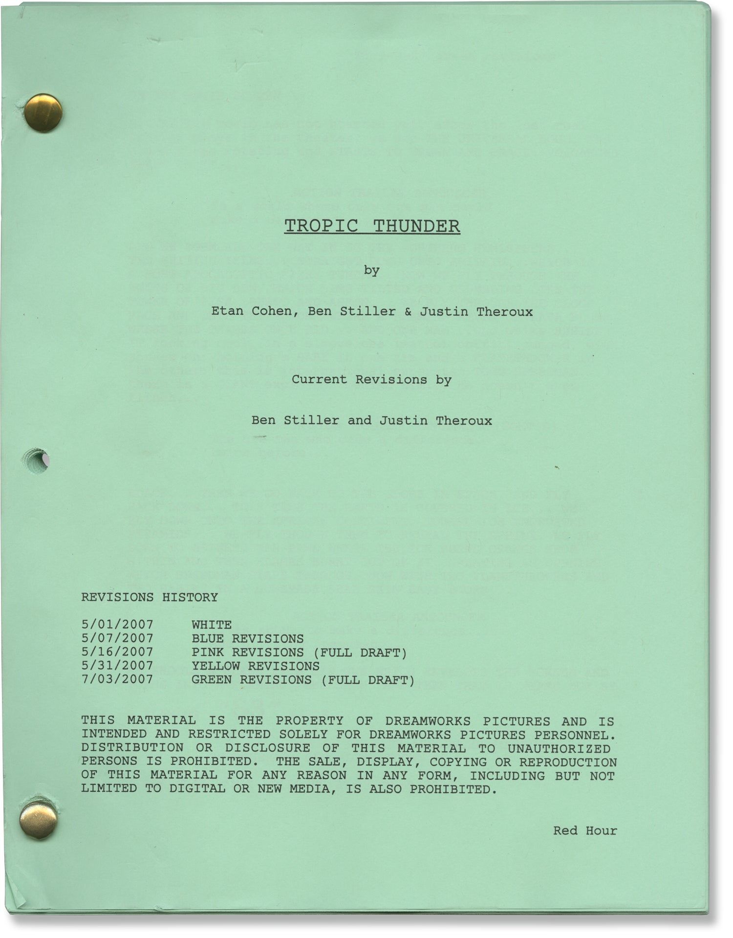 Self wrappers. Title page present, dated May 1, 2007, with credits for screenwriters Etan [sic, Ethan] Cohen, Ben Stiller, and Justin Theroux. 142 leaves, with last page of text numbered 123. Xerographic duplication, rectos only, with rainbow revision pages throughout, dated variously between July 3 and November 4, 2007. Pages Very Good plus, bound with three gold brads.