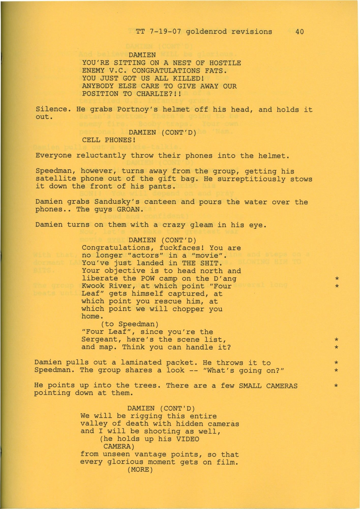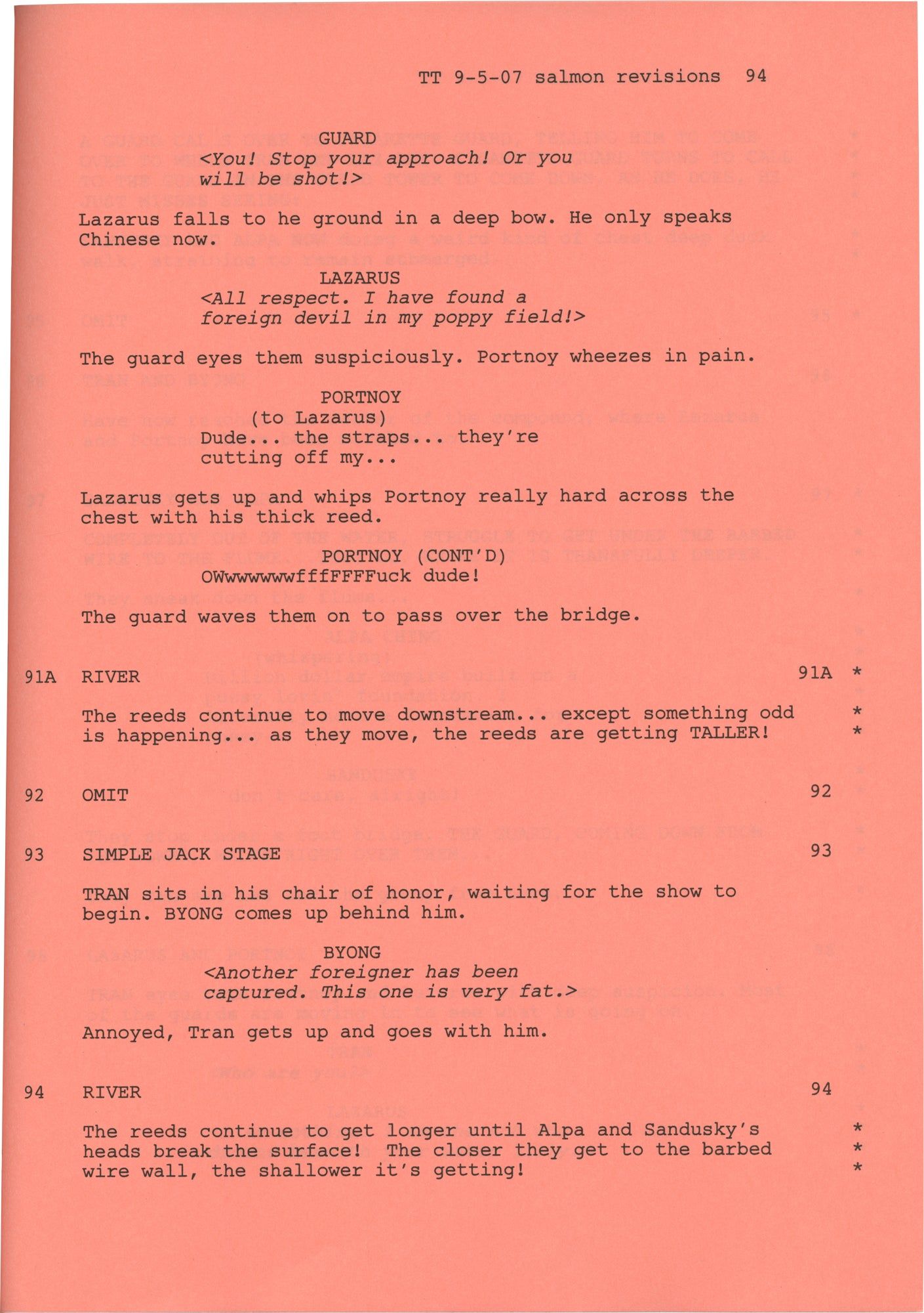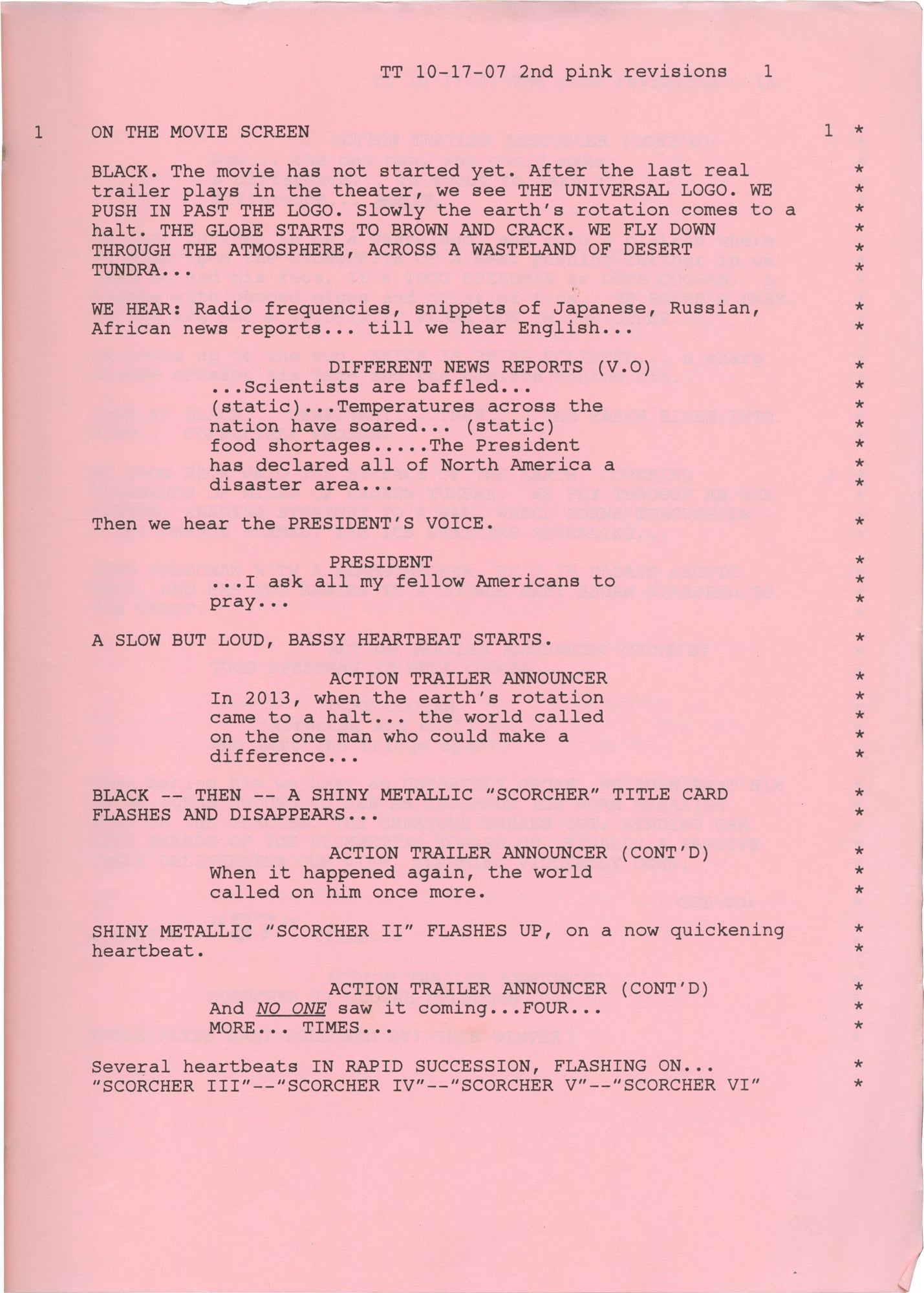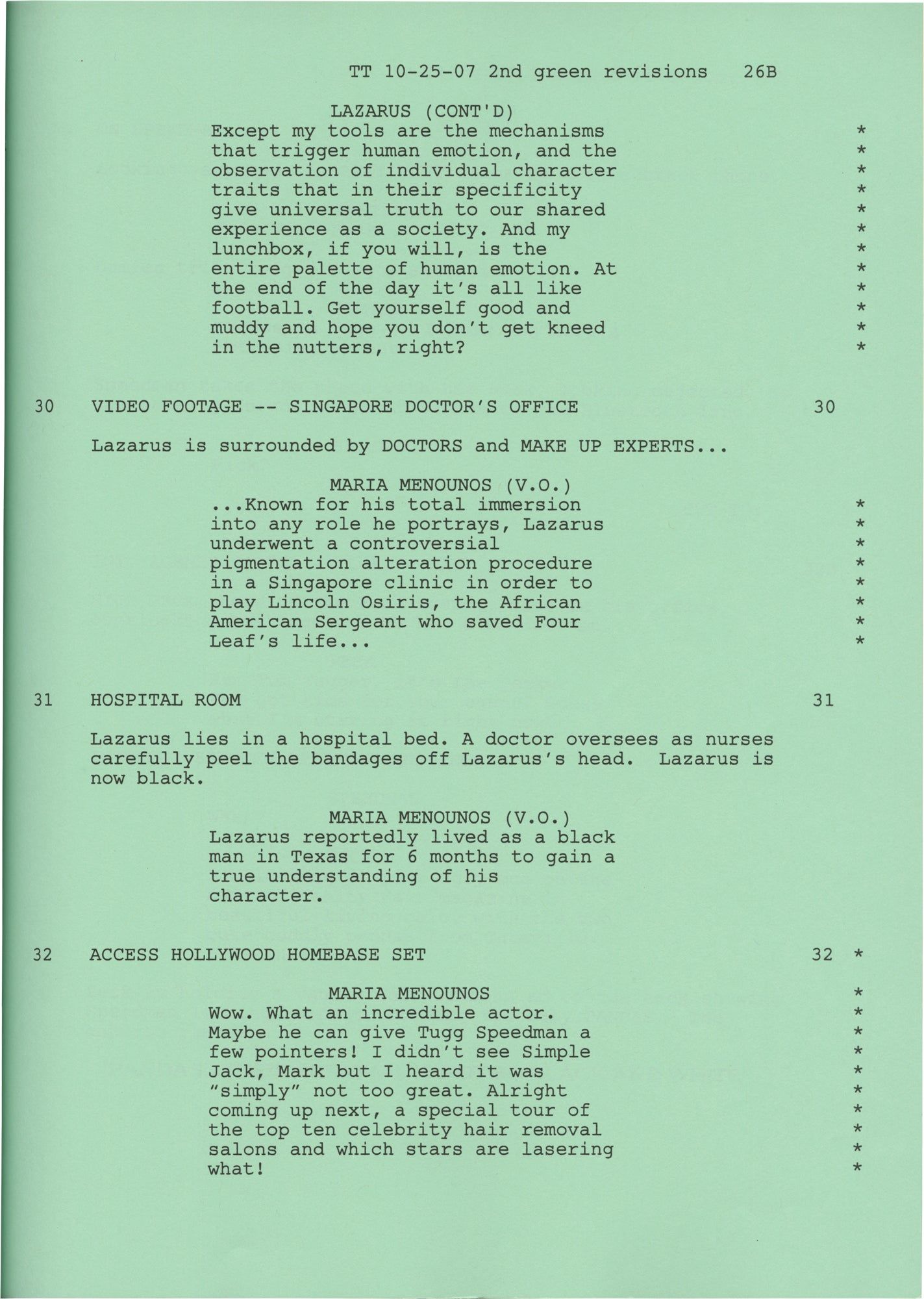 Self wrappers. Title page present, dated May 1, 2007, with credits for screenwriters Etan [sic, Ethan] Cohen, Ben Stiller, and Justin Theroux. 142 leaves, with last page of text numbered 123. Xerographic duplication, rectos only, with rainbow revision pages throughout, dated variously between July 3 and November 4, 2007. Pages Very Good plus, bound with three gold brads.