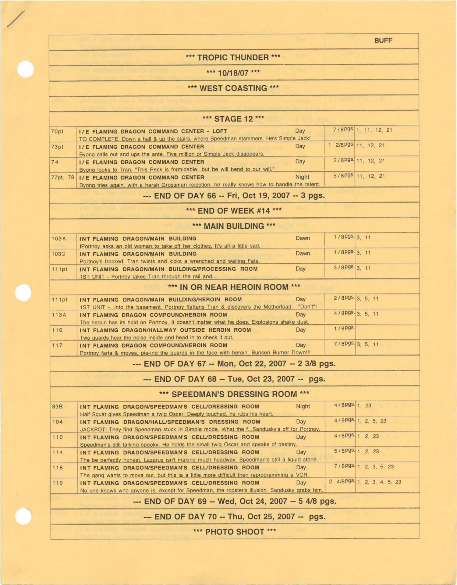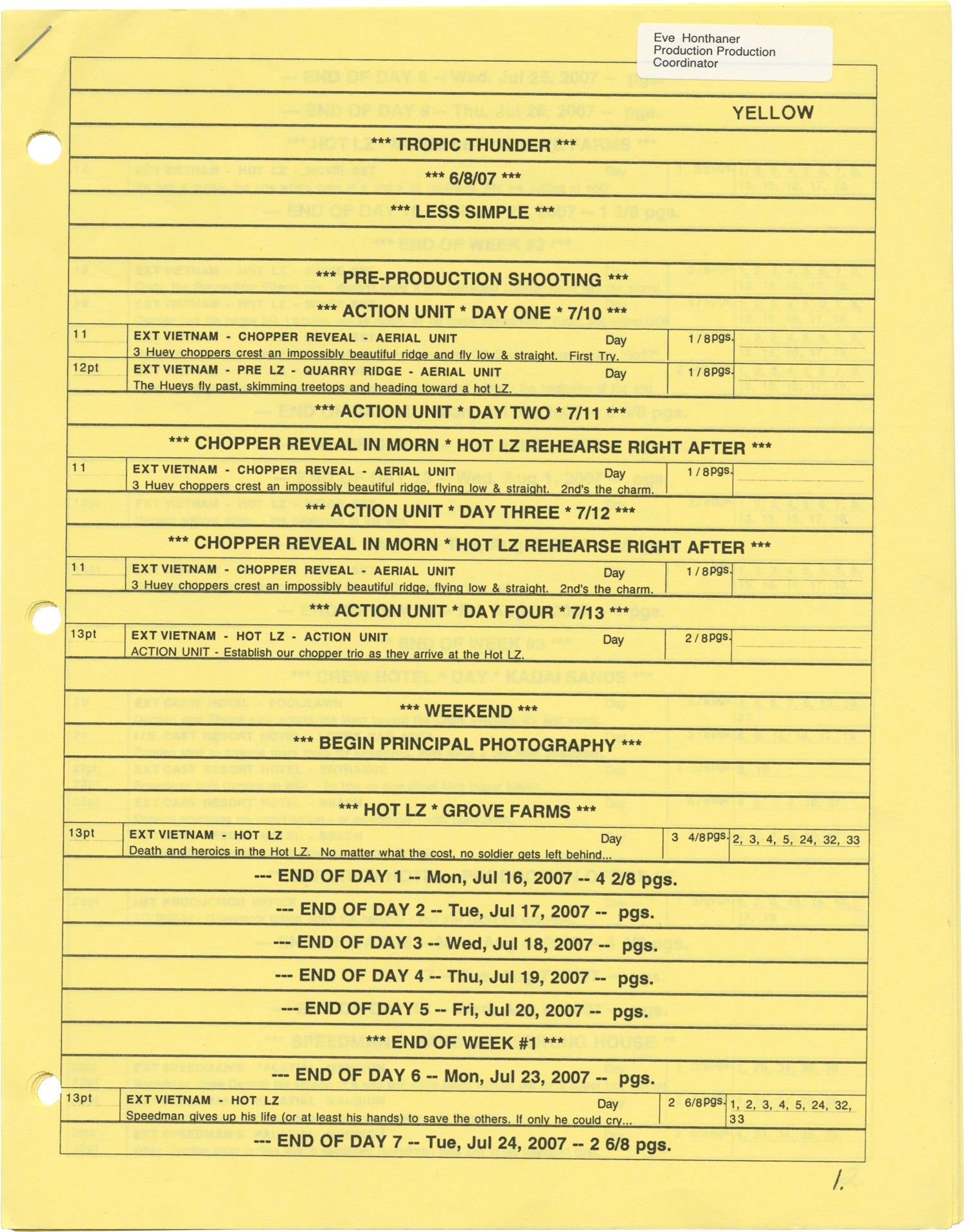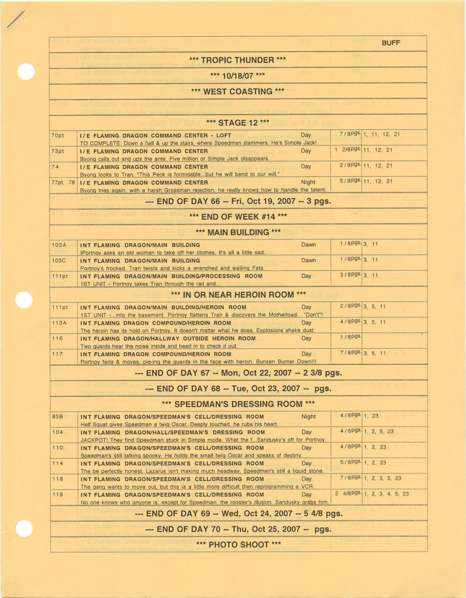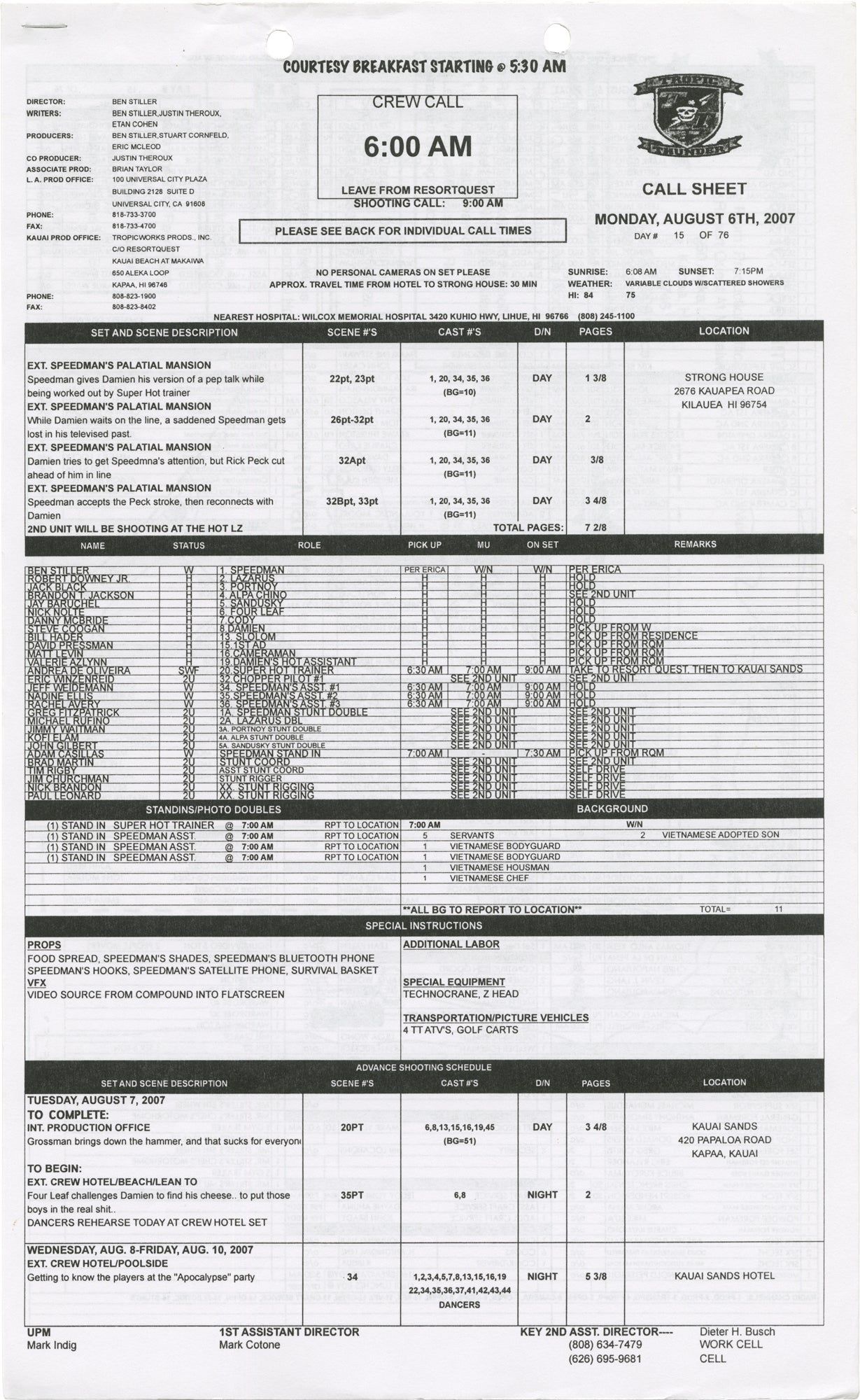 Universal City: Dreamworks, 2007. Revised Draft script for the 2008 film. Rainbow revision copy belonging to production coordinator Eve Honthaner, with her name in manuscript ink on the first leaf of the title page. Included with the script are numerous gatherings of production documents, including shooting schedules, call sheets, maps of filming locations, script supervisor breakdowns, and travel logs, and multiple revisions of the same.