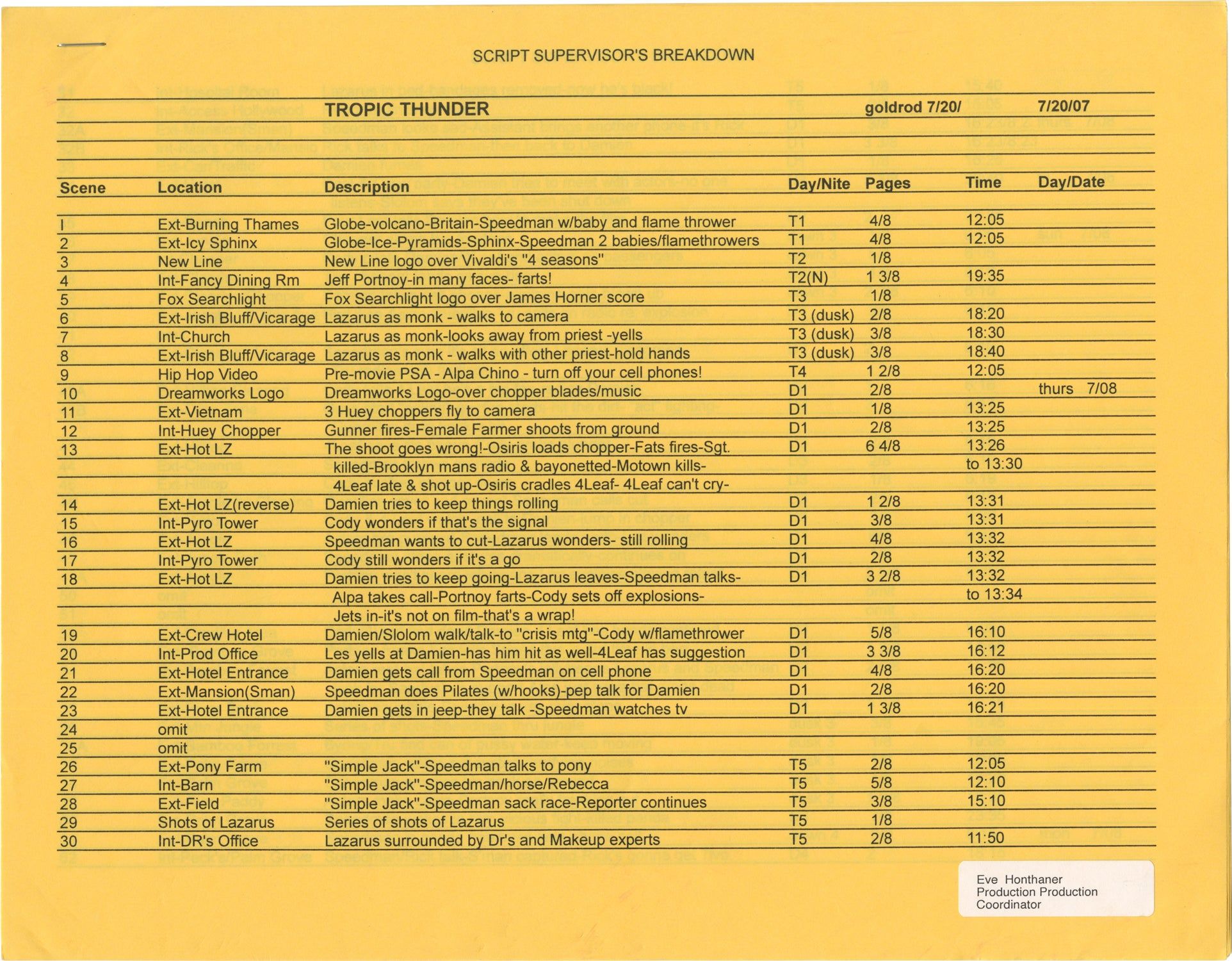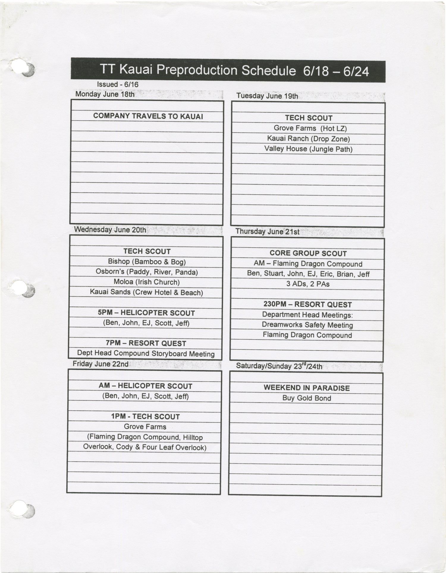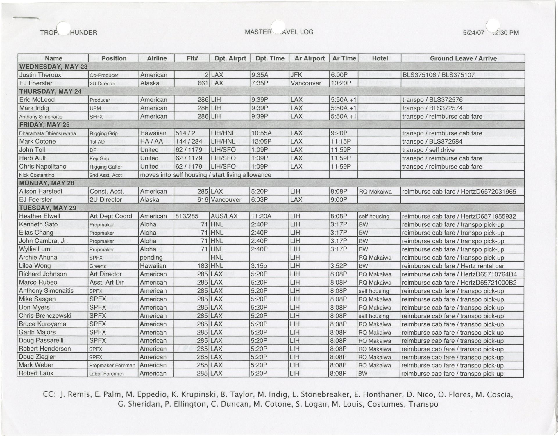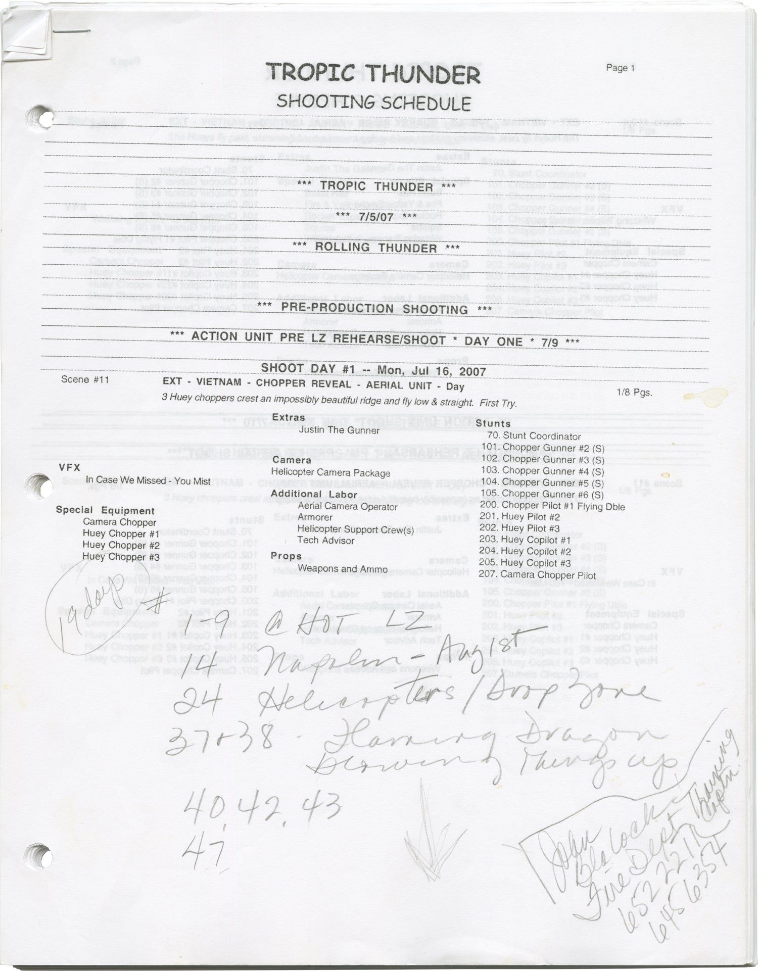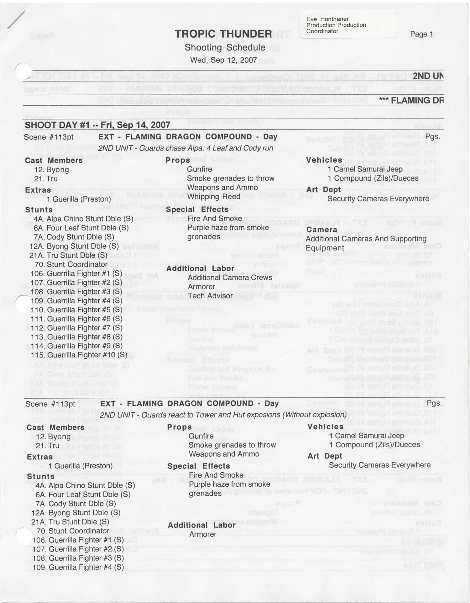 Universal City: Dreamworks, 2007. Revised Draft script for the 2008 film. Rainbow revision copy belonging to production coordinator Eve Honthaner, with her name in manuscript ink on the first leaf of the title page. Included with the script are numerous gatherings of production documents, including shooting schedules, call sheets, maps of filming locations, script supervisor breakdowns, and travel logs, and multiple revisions of the same.