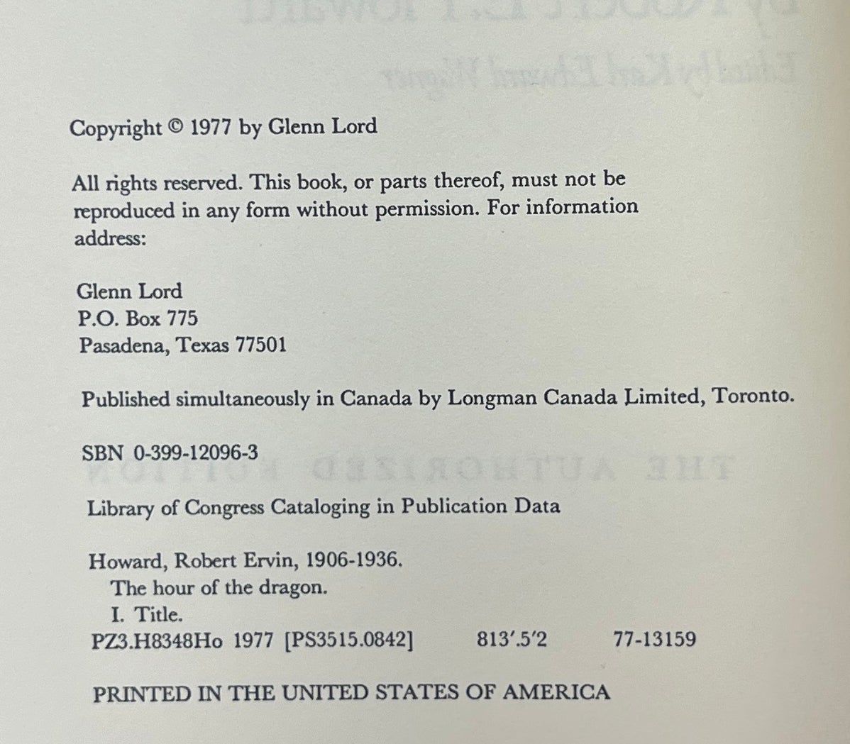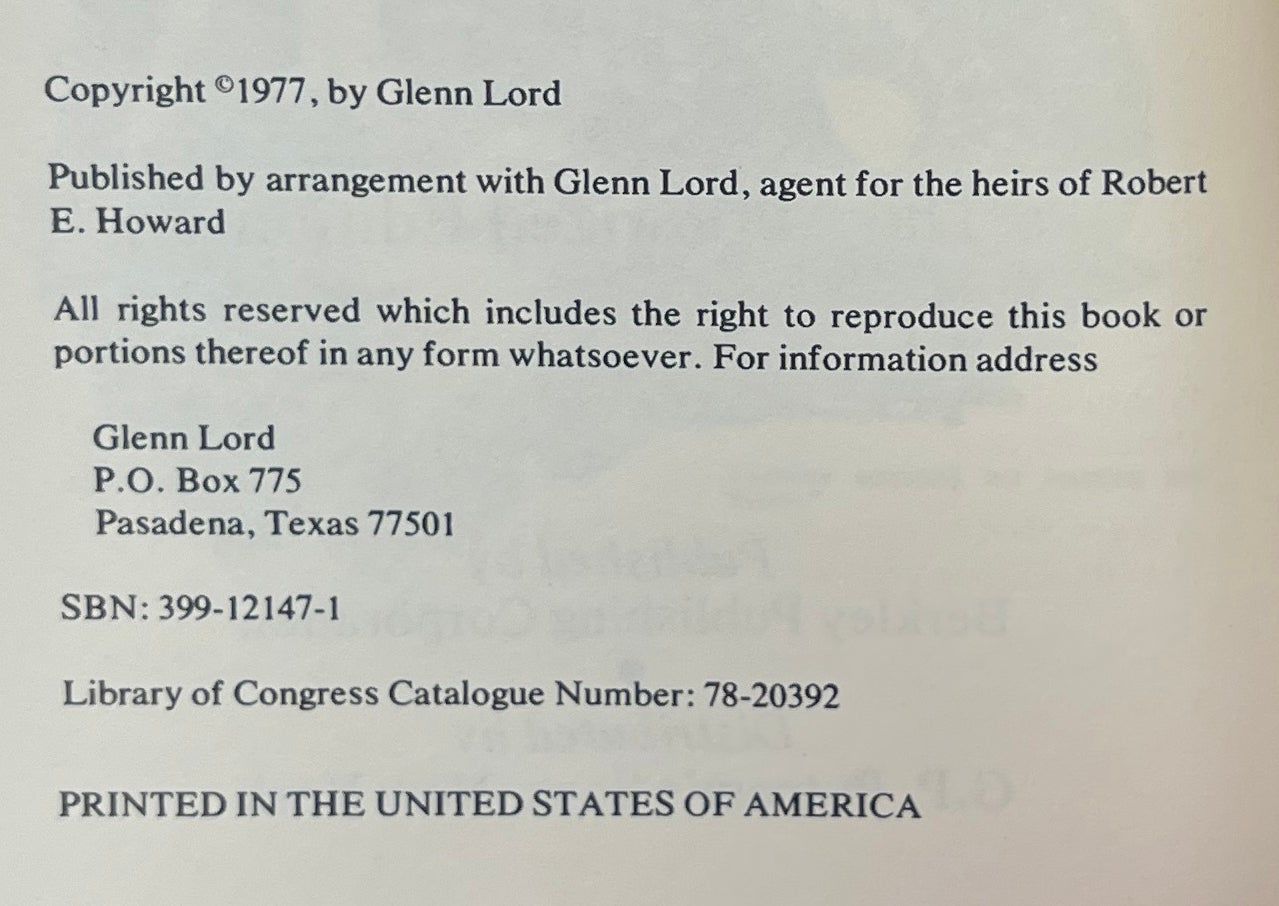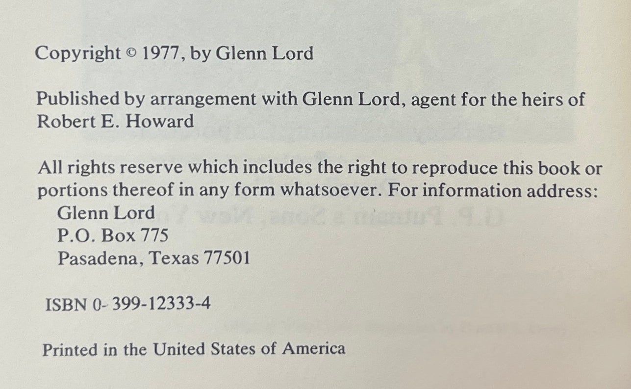 New York: G.P. Putnam's Sons, 1977. First Edition Thus. Hardcover. Fine/Fine. Authorized Edition. Edited by Karl Edward Wagner. Fine in about Fine jackets, unclipped ($8.95, $9.95, $9.95), with some creases and bumps at the lower edges and corners. Cloth on the boards with gilt lettering on the spines. Square and firmly bound, faintly foxed at the top edges, clean internally. The first Berkley Putnam hardcover publications of these three Conan books that would later be collected as The Essential Conan.