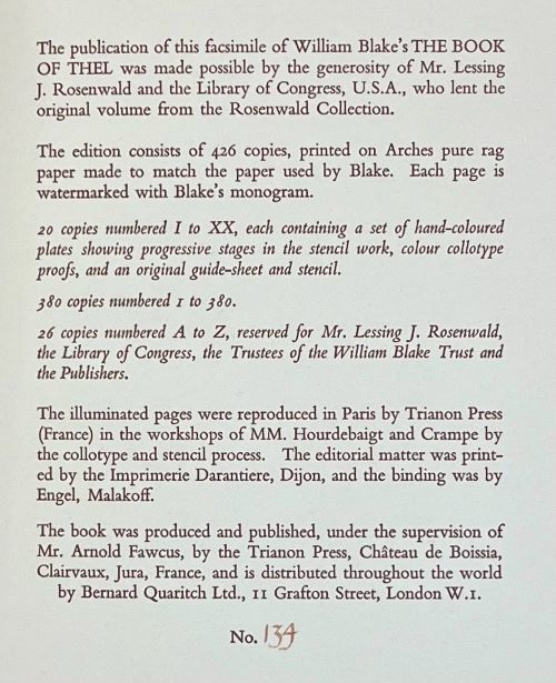 A beautiful facsimile edition, printed on pure rag paper - made to match the paper used by William Blake. The illuminated pages were reproduced using a collotype and stencil process. Additionally, each page is watermarked with Blake's monogram.