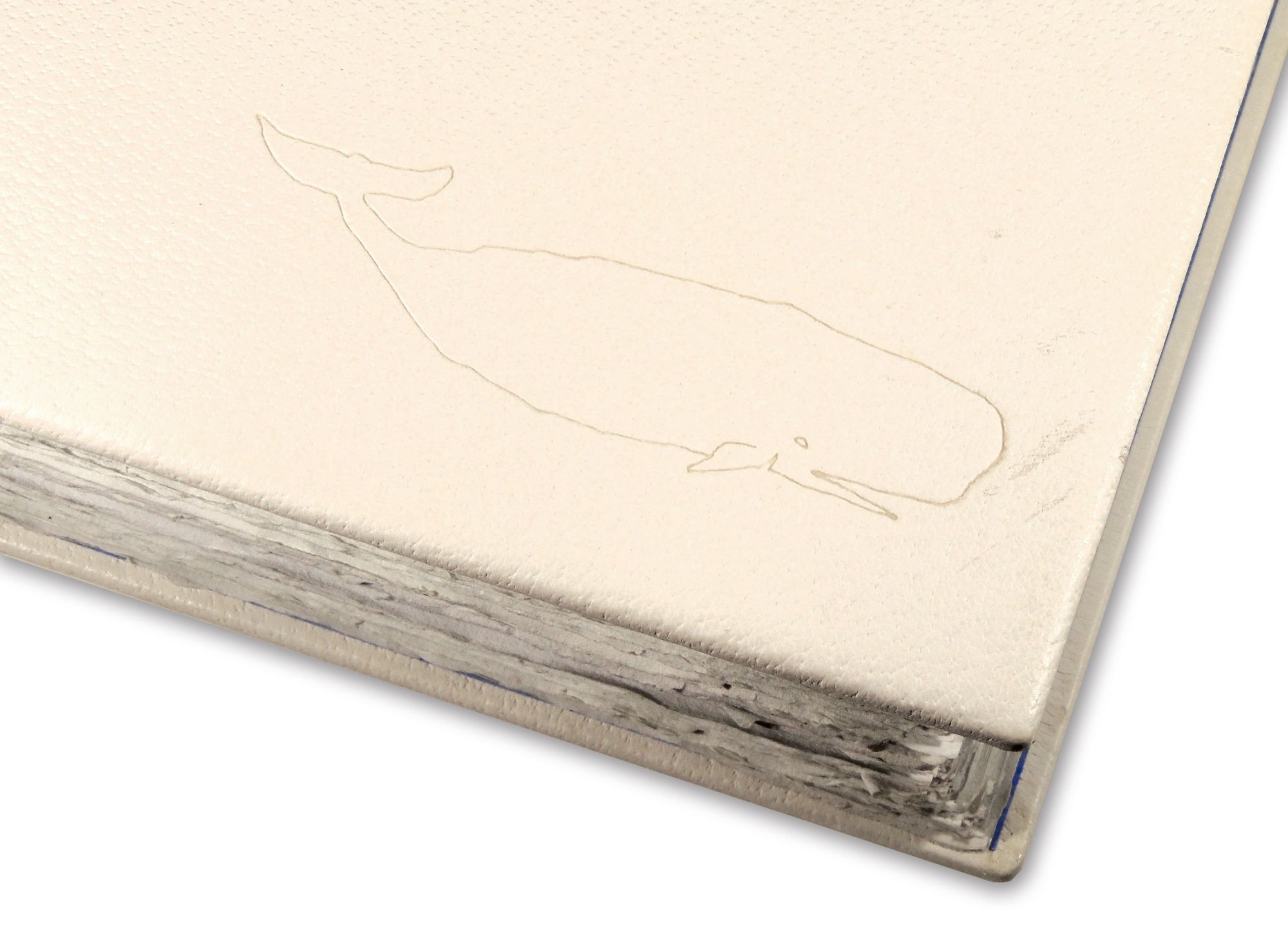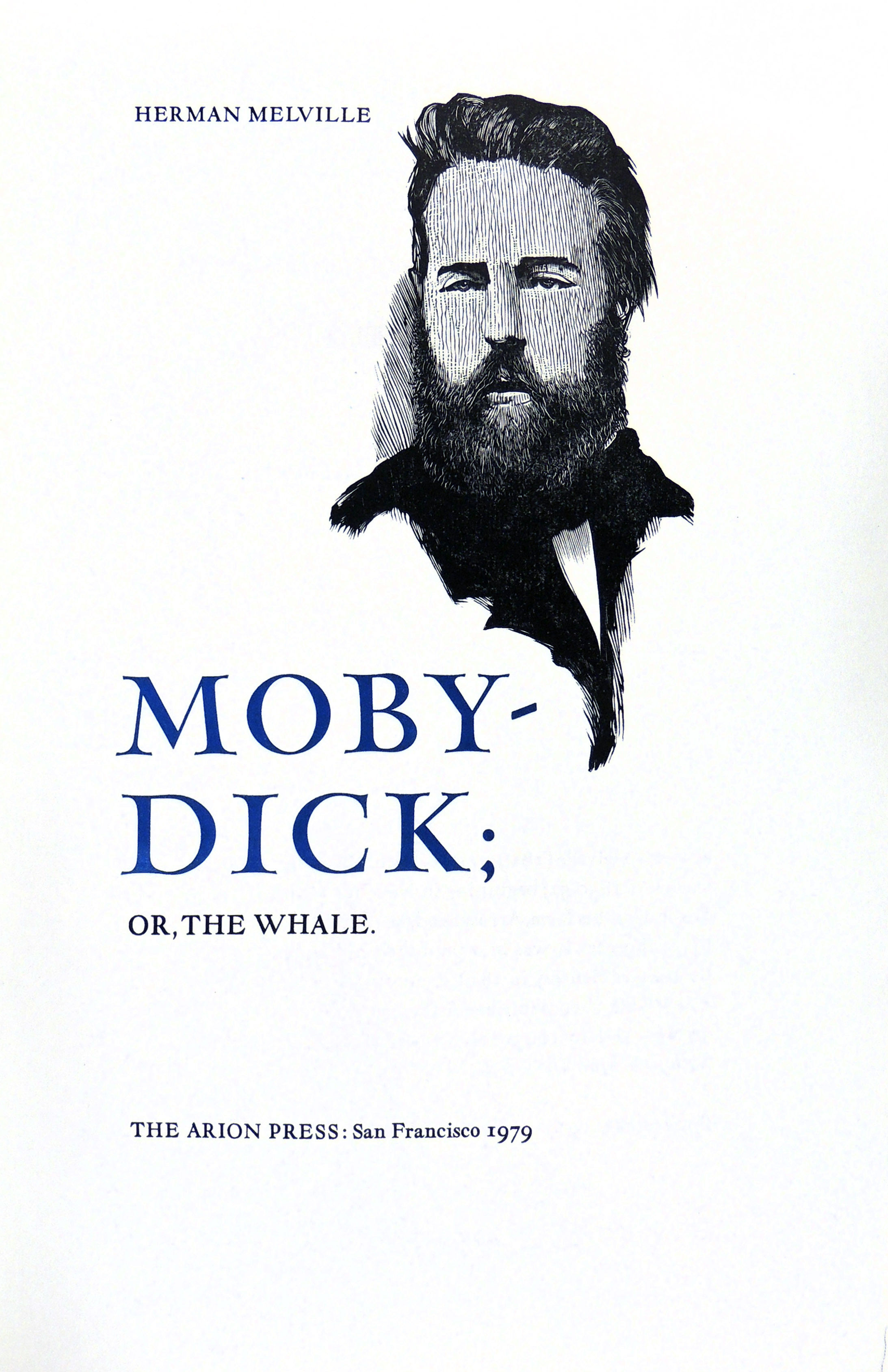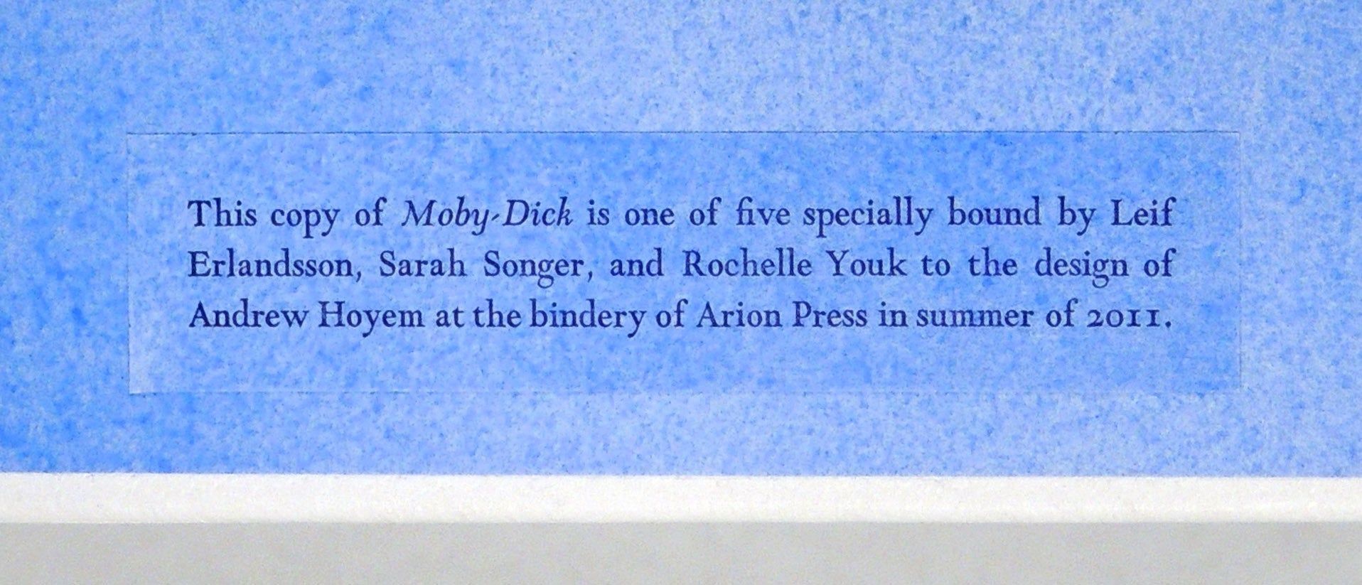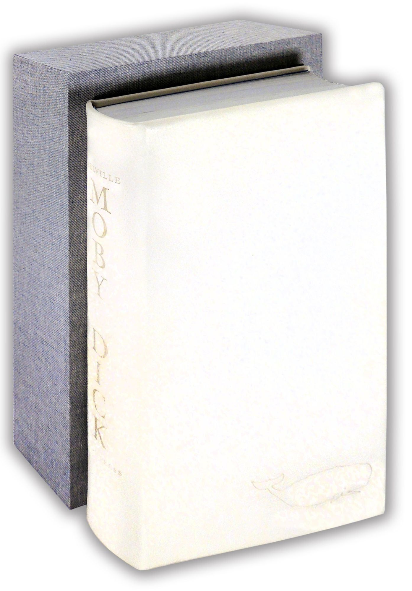 It took 14 months to print this folio copy of Moby Dick. Bound in full white leather with the illustrated image of a whale debossed on the front cover and titling to the spine. With beautiful blue endpapers. The text was set by hand in Goudy Modern, with initial letters printed in blue at the start of each of the 135 chapters in Leviathan Capitals, a special alphabet designed for the purpose by Charles Bigelow & Kris Holmes. Printed on Barcham Green's handmade paper, which is watermarked with the outline of a whale. Very light occasional foxing to fore-edges, not affecting the text pages. Housed in a custom box covered with gray cloth bearing a title label printed on the same white leather used on the special binding. Accompanied by the prospectus. In fine condition. Measures 10 x 15 x 3 inches. 577 pages. PRI/091924.
