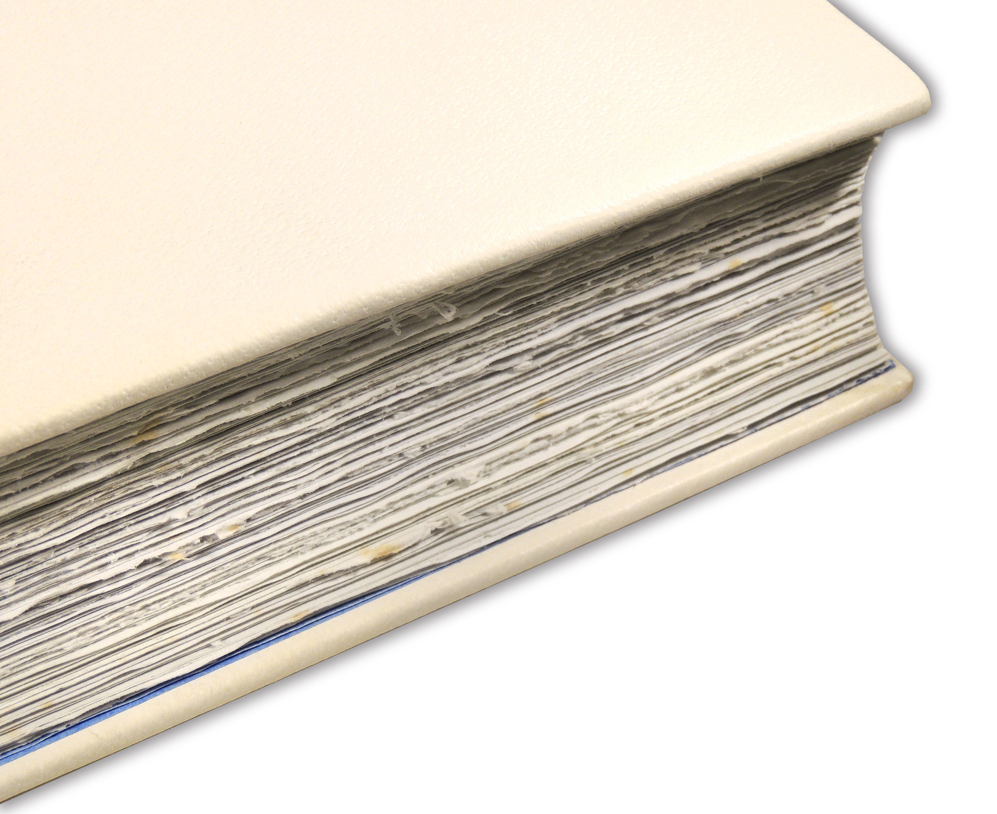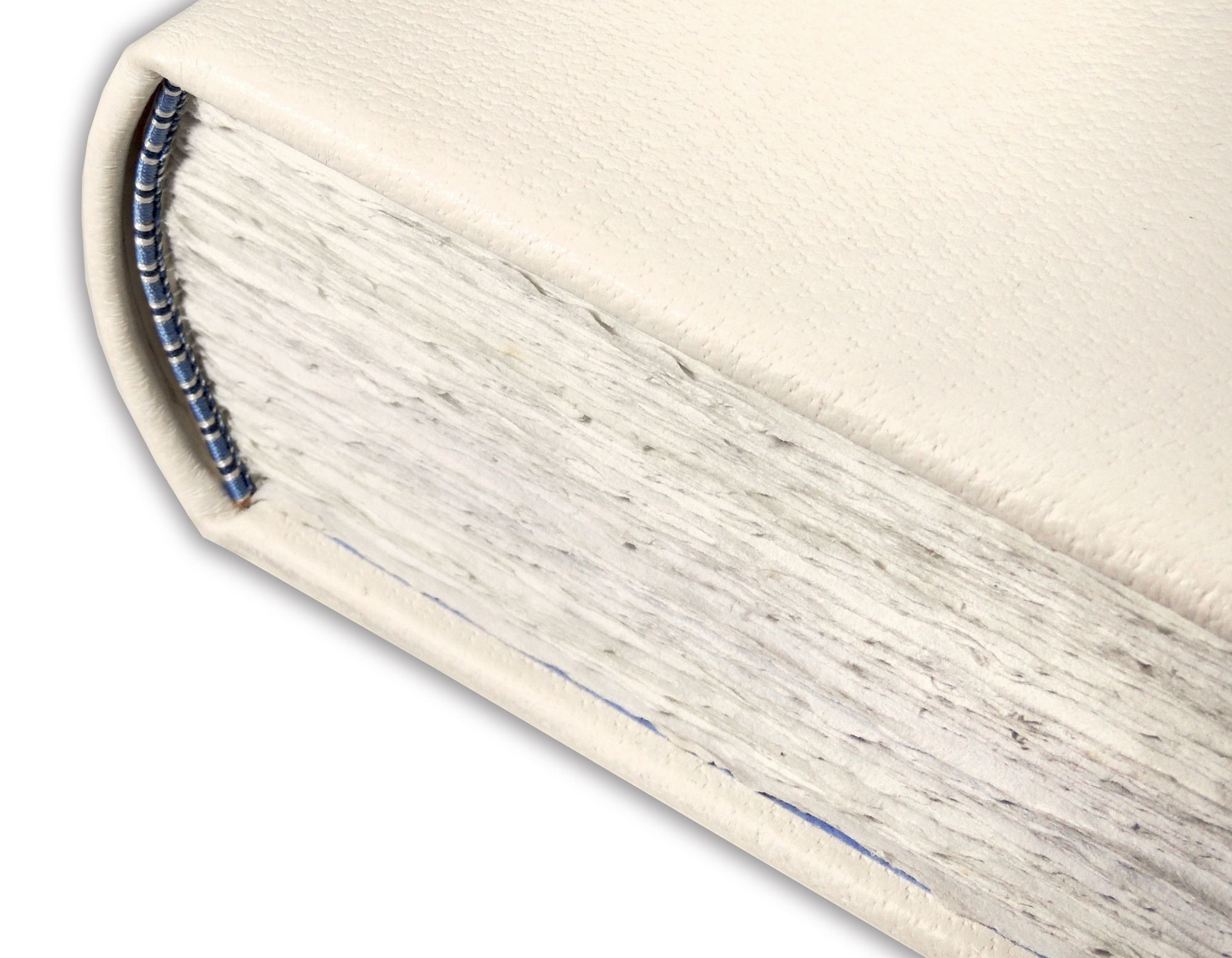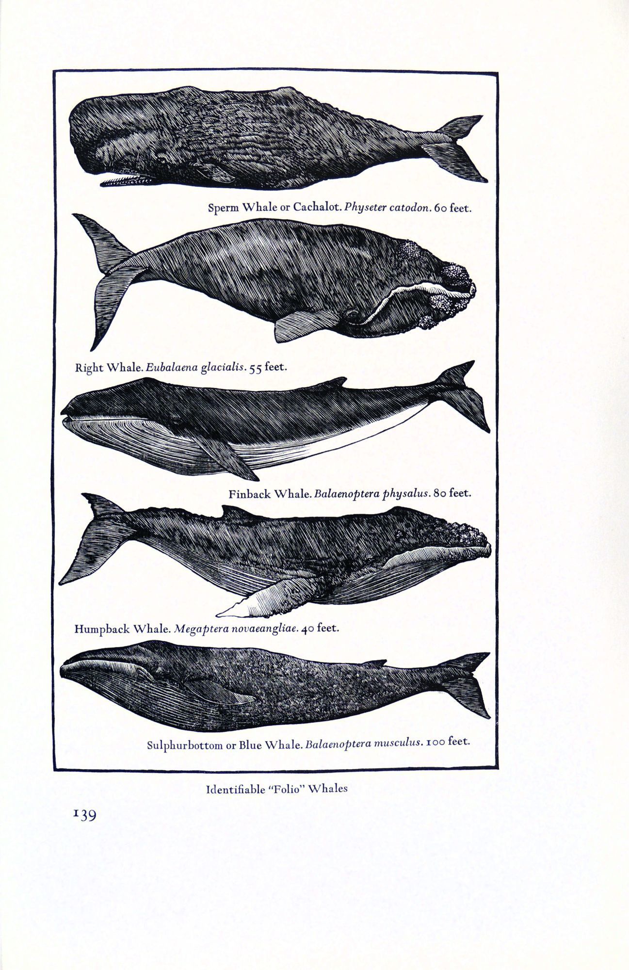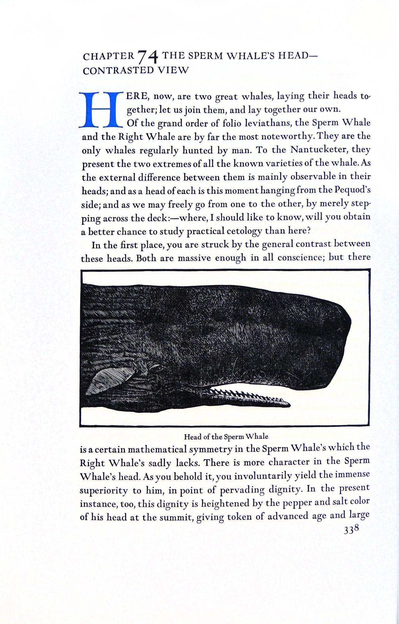 It took 14 months to print this folio copy of Moby Dick. Bound in full white leather with the illustrated image of a whale debossed on the front cover and titling to the spine. With beautiful blue endpapers. The text was set by hand in Goudy Modern, with initial letters printed in blue at the start of each of the 135 chapters in Leviathan Capitals, a special alphabet designed for the purpose by Charles Bigelow & Kris Holmes. Printed on Barcham Green's handmade paper, which is watermarked with the outline of a whale. Very light occasional foxing to fore-edges, not affecting the text pages. Housed in a custom box covered with gray cloth bearing a title label printed on the same white leather used on the special binding. Accompanied by the prospectus. In fine condition. Measures 10 x 15 x 3 inches. 577 pages. PRI/091924.