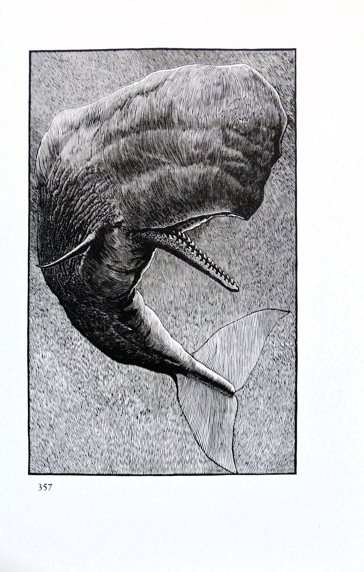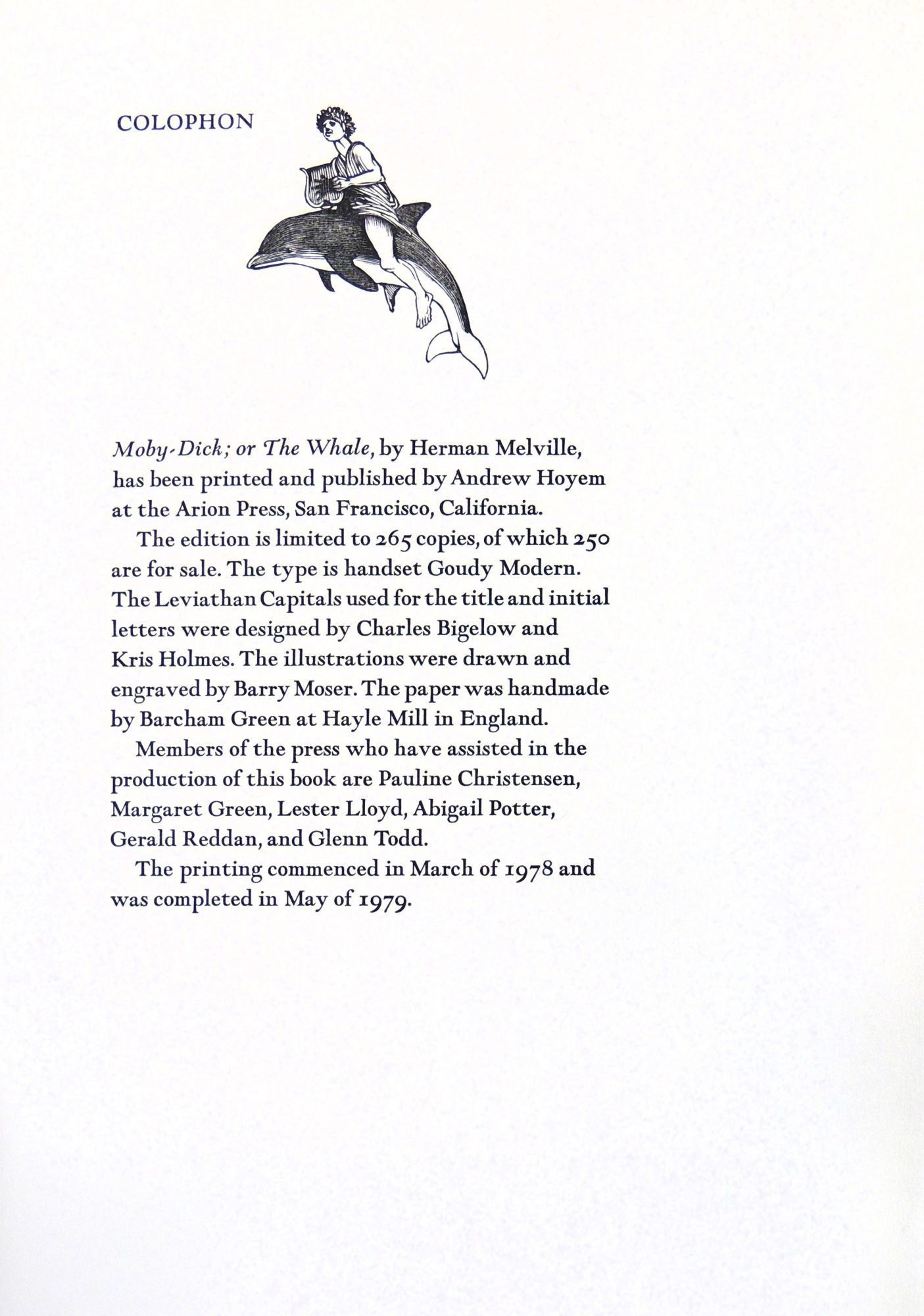 According to the 24 page prospectus for the book, this was the sixth publication issued by the press, which is described by them as "one of the most elaborate printing ventures ever to be undertaken by an American press, and nothing will be spared in the effort to make it the finest of books." There is a several page description of the making of this magnificent edition. They write: "Despite many editions -perhaps because of its length - it has not been accorded the full typographical treatment that a classic of its stature deserves"....in the early days of [the press] they considered the possibility of their printing a handset folio Moby Dick. It took ten years from the early discussions for the press to secure the capital for this long-planned venture. They go on to explain in detail the type and paper selection, followed by a section on the illustrations by the renowned artist Barry Moser of the Pennyroyal Press. It was decided from the inception of the project that there would be no dramatic or interpretive scenes that would imposed on the reader's imagination. Instead, the text would be interspersed with informative depictions of subjects mentioned by Melville.