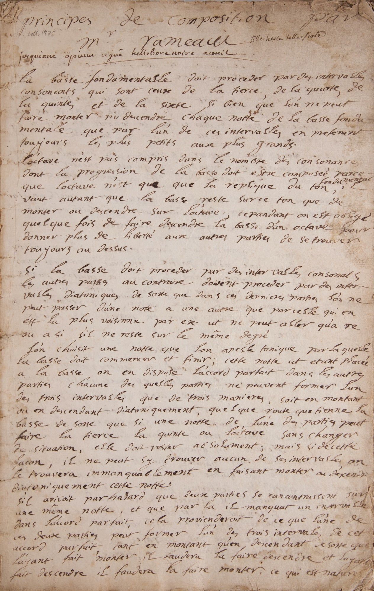 Loose in worn contemporary gray wrappers with "Principes de Composition et d'accompagnement par Rameau" in an early hand to upper. Both manuscripts in the same hand. Rameau's highly important first work on music theory, the Traité summarizes the author's efforts to transform the consideration of music from art to science. It was first published in Paris by Jean-Baptiste-Christophe Ballard in 1722, and earned its author a reputation as the most learned musician of his era. The work is divided into four parts: