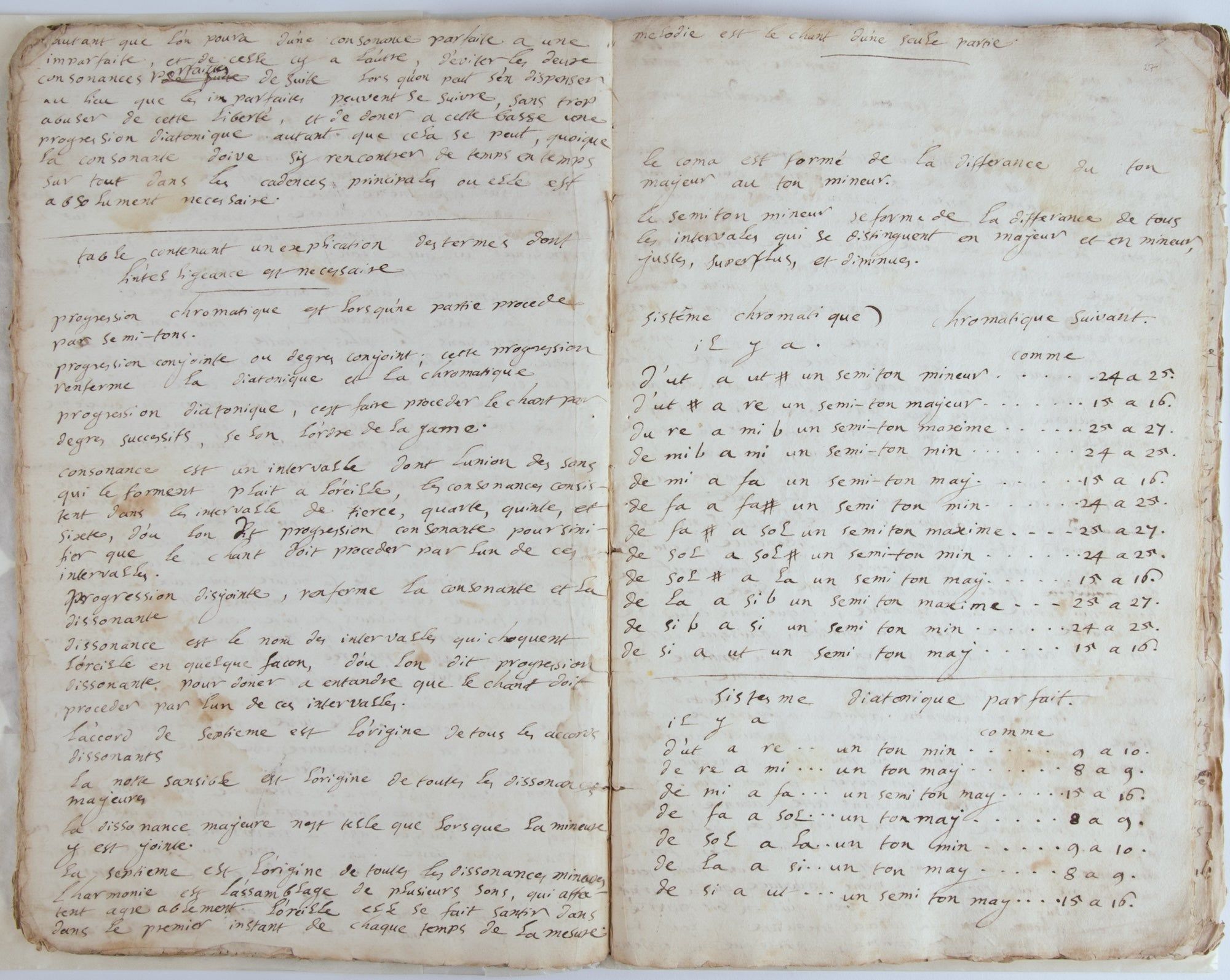 Folio. 34 unnumbered pages + one folding plate "Table des progressions." With several musical examples. Occasional corrections. Worn and soiled, heavier to edges; some edges frayed and corners turned; several tears; dampstaining to inner portions of several leaves; small sewing holes to several inner margins; final leaves partially detached. Seems to follow Part III of the Traité but with textual differences and original elements including tables and diagrams.
